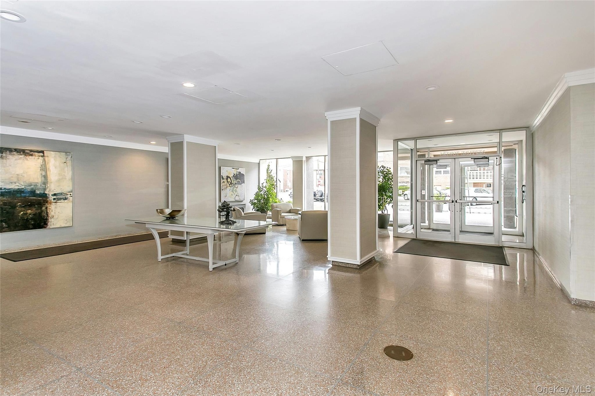 - Building lobby with expansive windows and recessed lighting