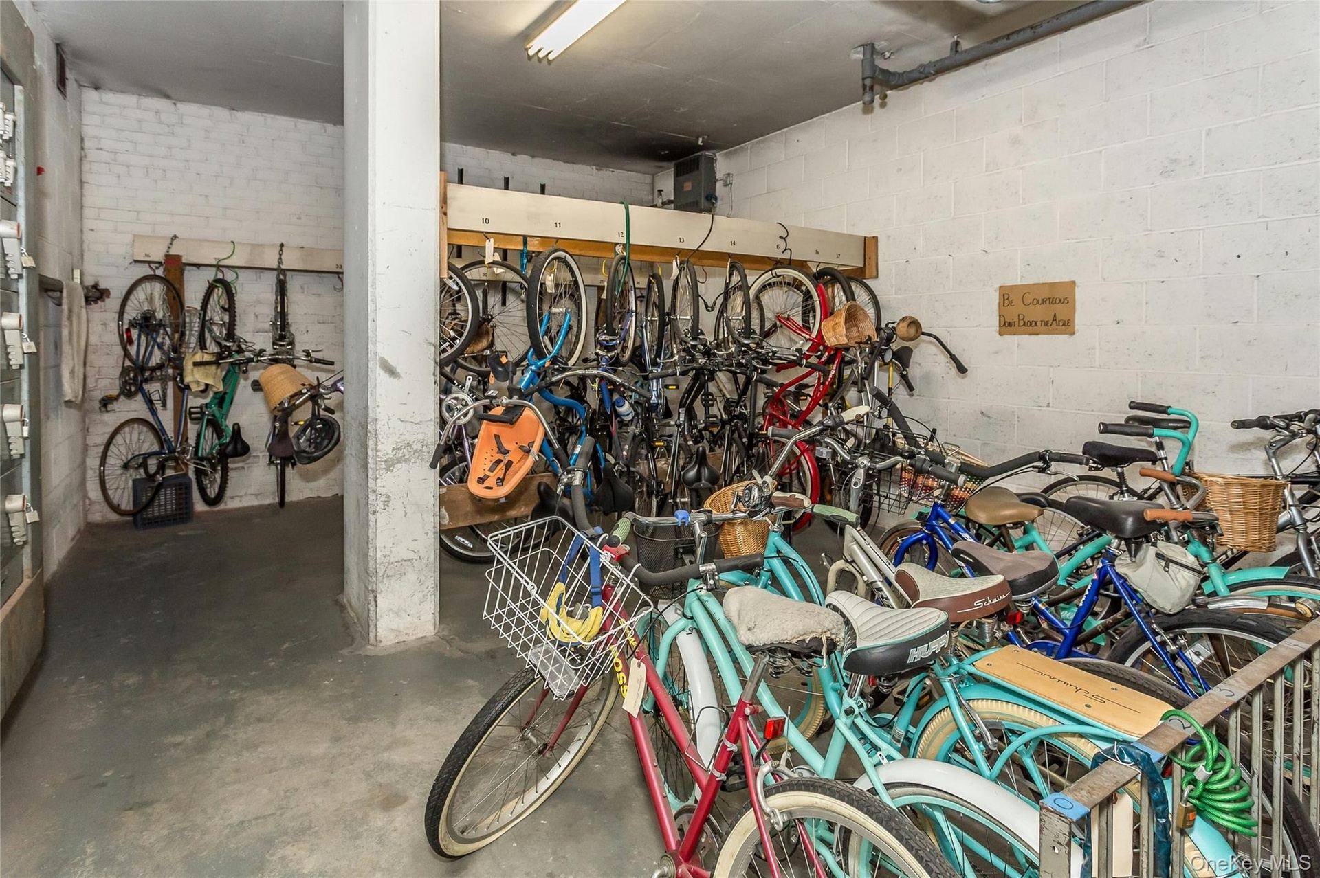 - Garage featuring concrete block wall and bike storage