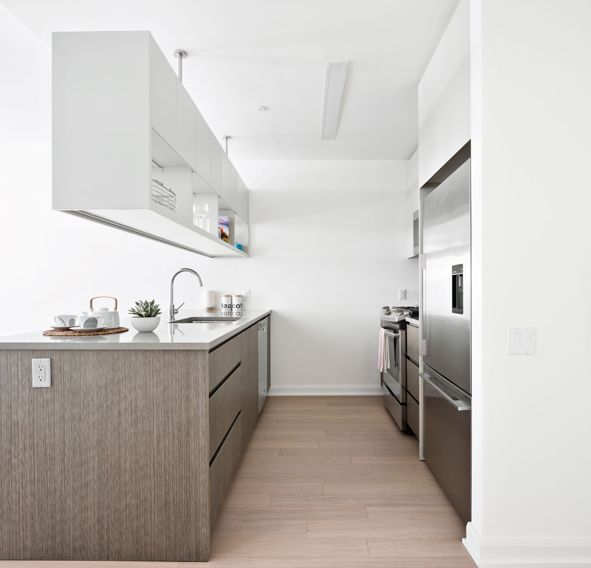 Modern one bedroom with floor to ceiling windows, an open kitchen with stainless steel appliances, quartz counters and eating bar, high ceilings, and an in-unit washer/dryer.