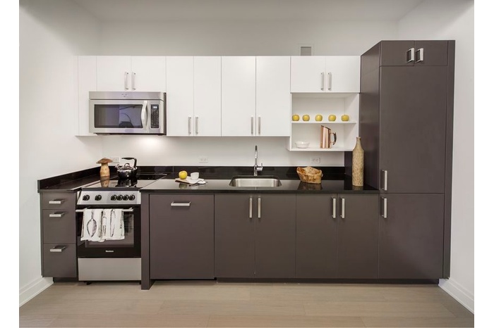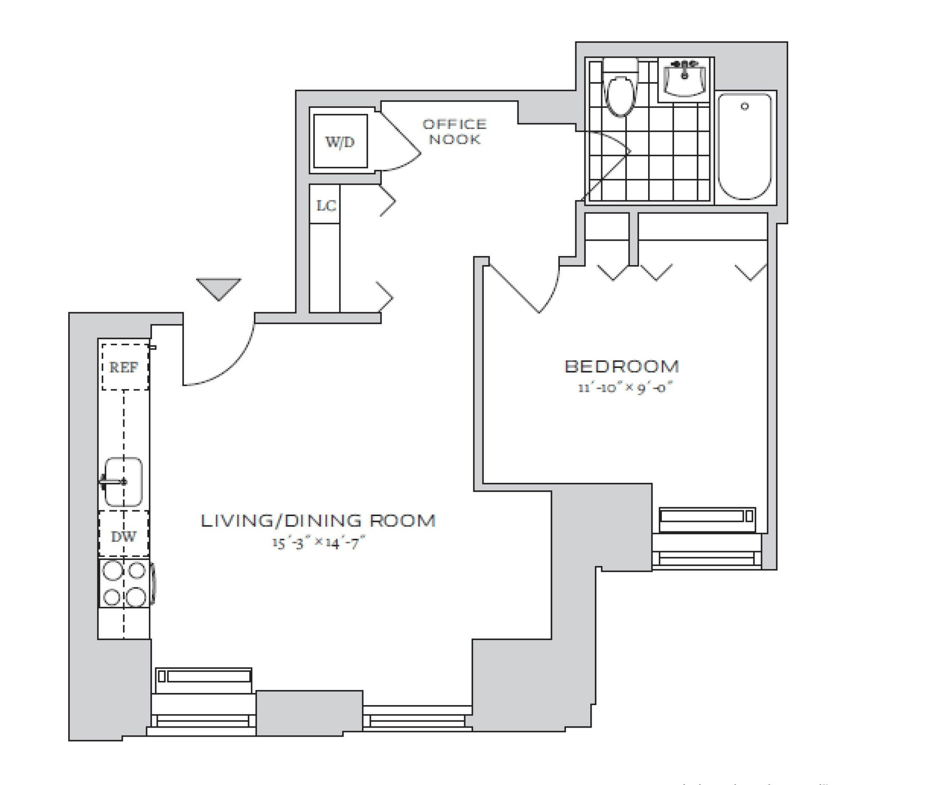 High floor 1 bed w/amazing views, space for a dedicated dining room or home office, gourmet kitchen with stainless steel appliances and stone countertops, wood floors, multiple closets, and an in-unit w/d.