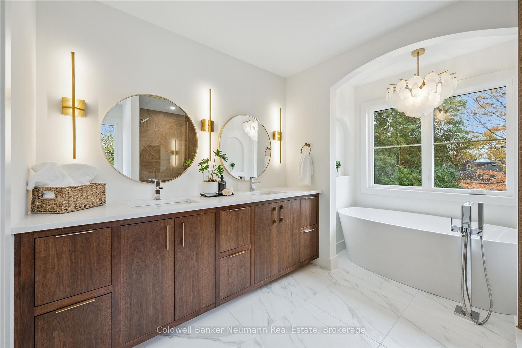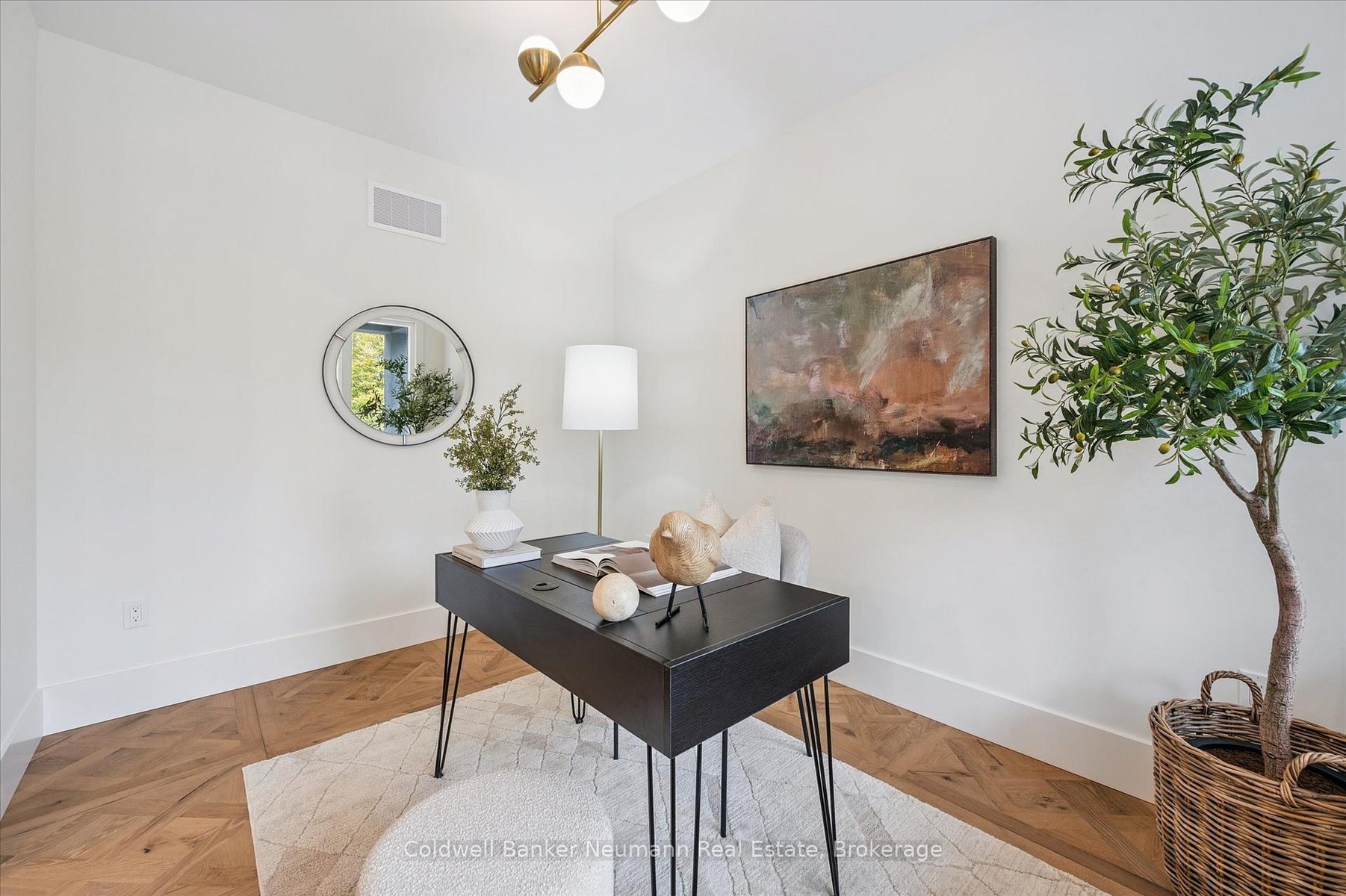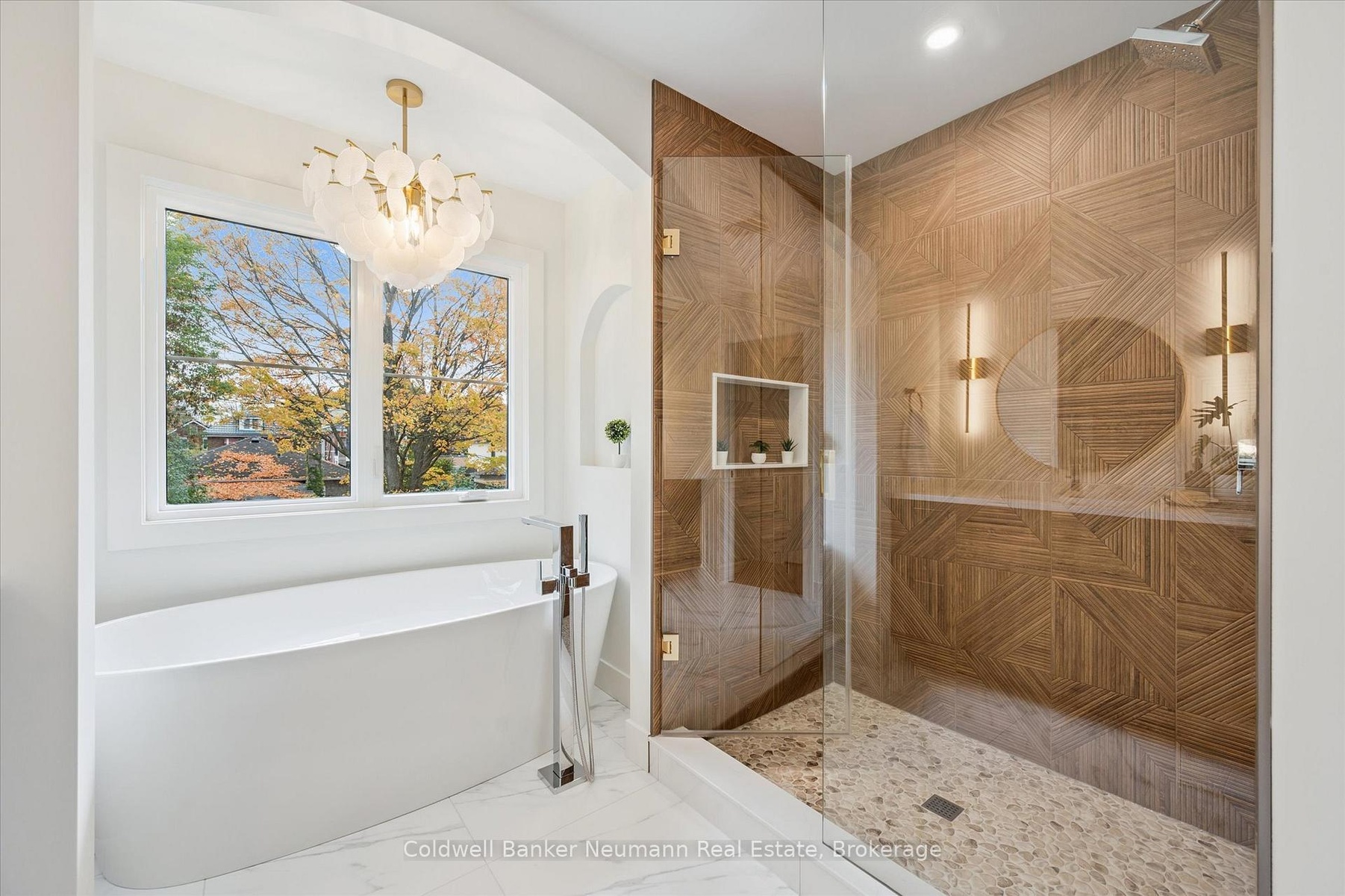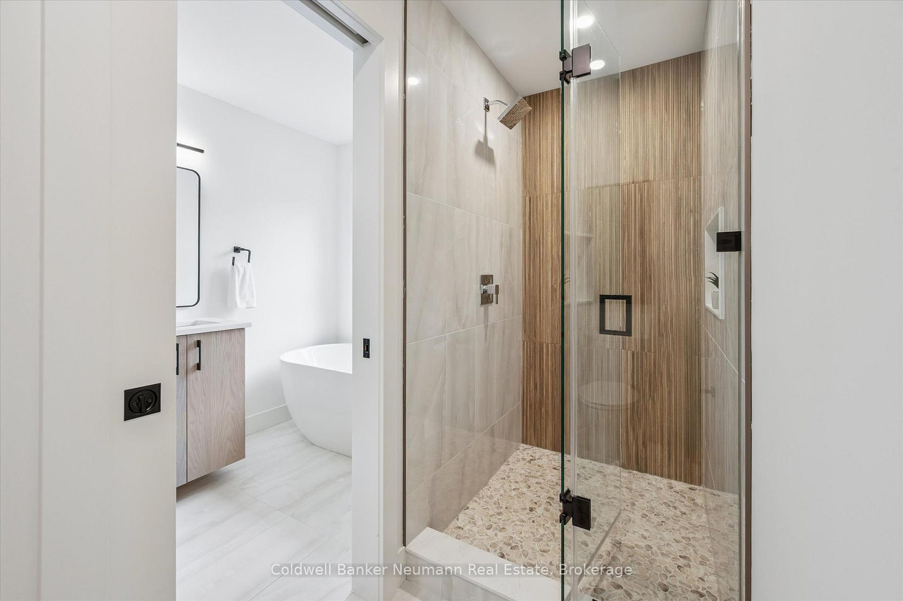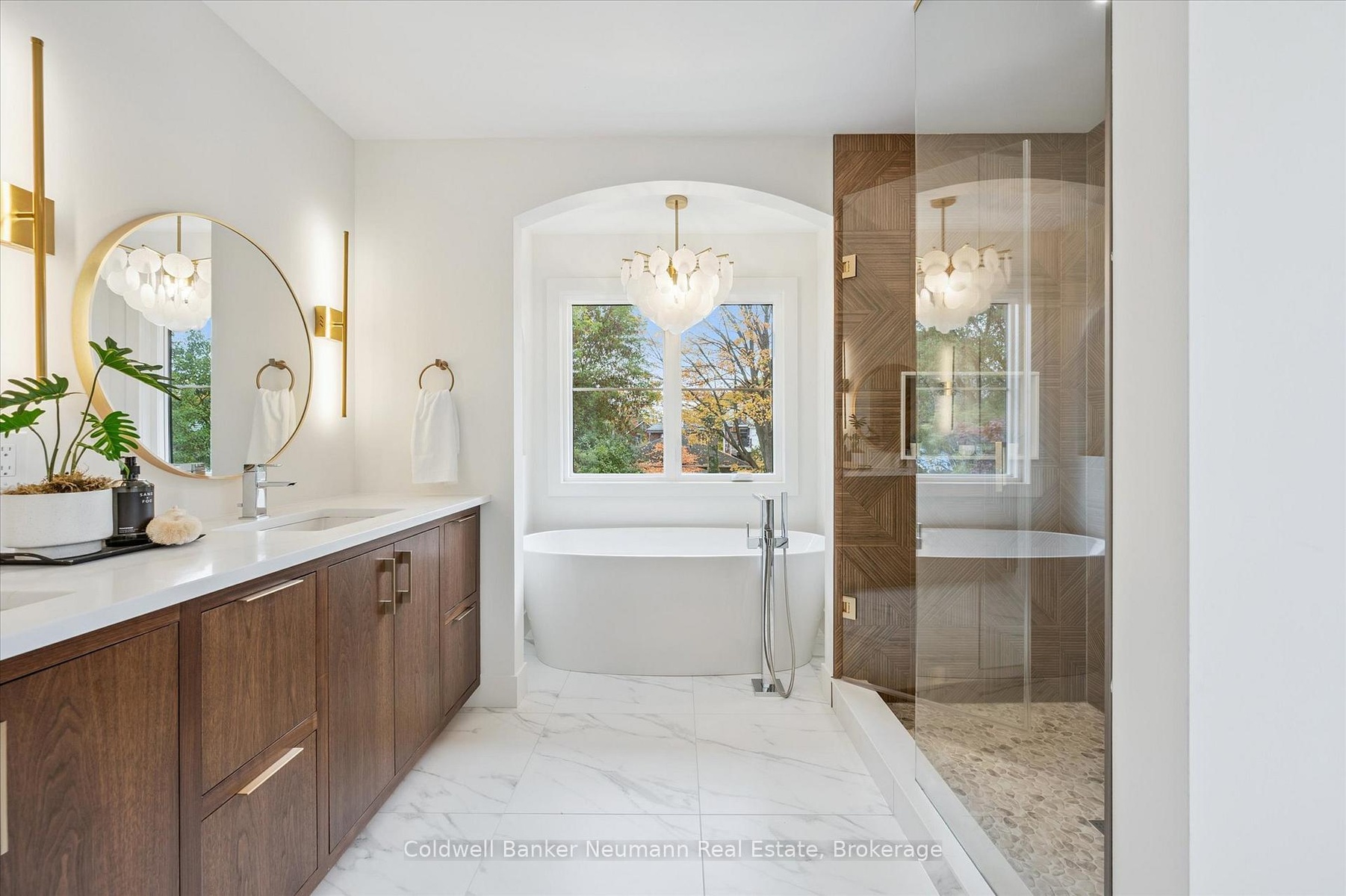 Welcome to 126 Oxford Street - a brand new luxury home built with exceptional attention to detail by Everest Homes, ready for you to make it your own. From the striking modern stucco exterior to the nine-foot ceilings and white oak flooring on the main floor, every feature exudes sophistication. The front foyer sets the tone with its distinctive hardwood, while the main level offers a bright home office, an open-concept Barzotti kitchen, and custom built-ins in the dining and living areas-anchored by a stunning 74" Napoleon fireplace. Upstairs, you'll find three spacious bedrooms, including a primary suite that truly impresses, complete with a large walk-in closet and a five-piece ensuite featuring a custom walnut vanity. A convenient upper-level laundry room adds practicality to the elegant design.The lower level offers even more potential, with large windows, a separate entrance, and rough-ins for a kitchen, bathroom, and laundry-making it ideal for an in-law suite or future 2 bedroom apartment. Beautifully situated in Guelph's downtown core, this home is steps from Exhibition Park, schools, and all amenities-offering luxury living in one of the city's most desirable locations.