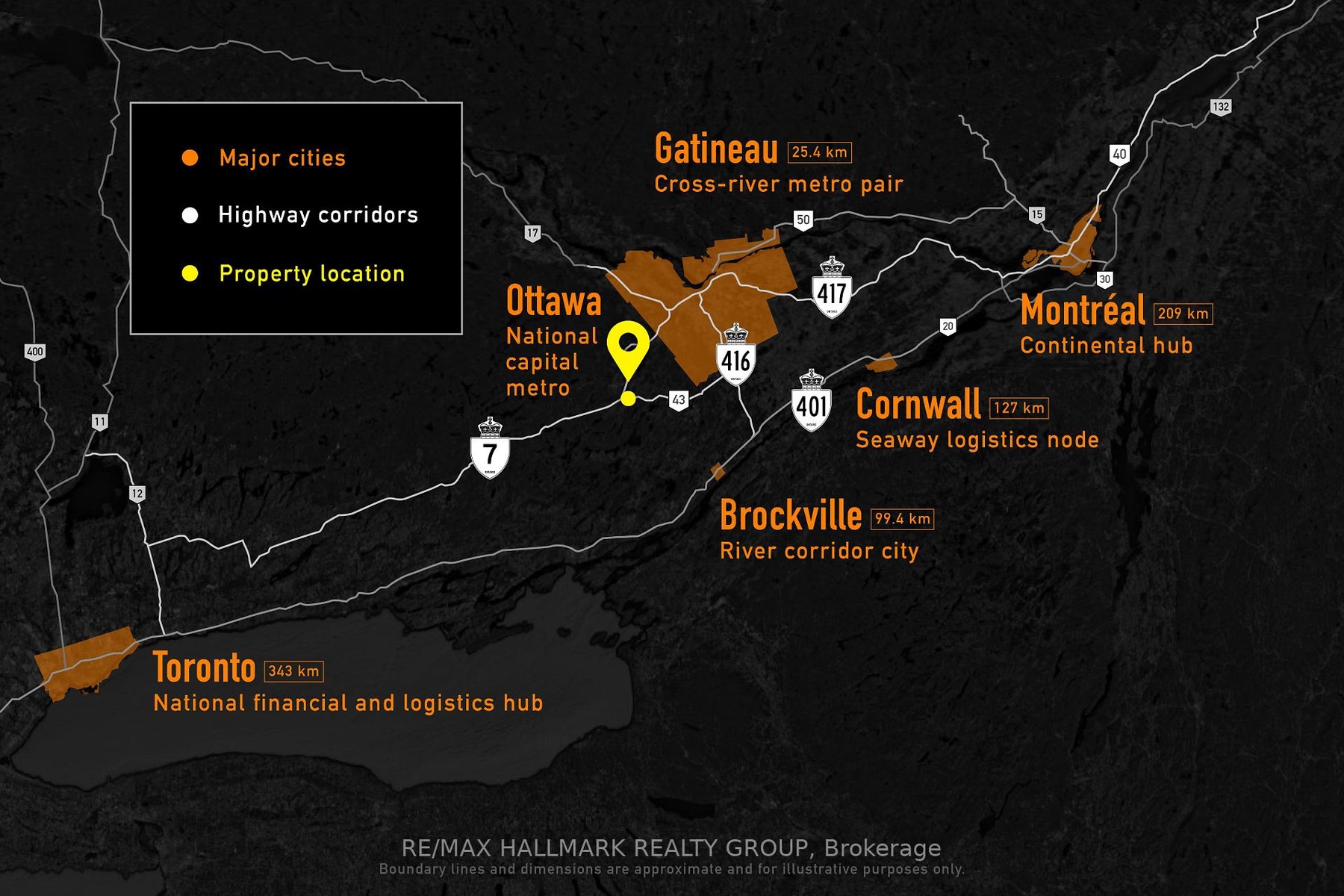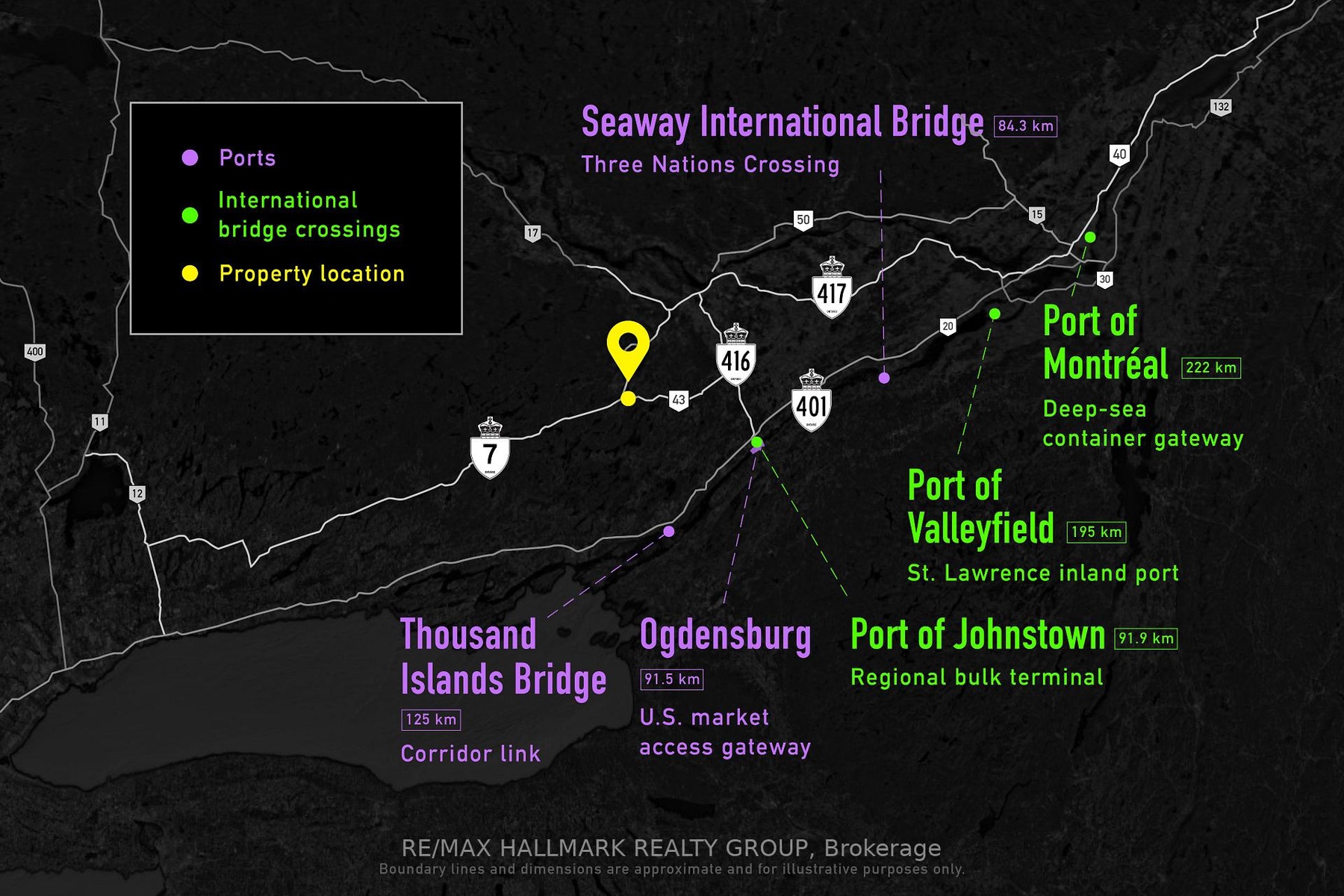 Located at 1847 Rogers Rd in Perth, this 5-acre industrial site delivers +/- 51,093 sq ft (+/- 50,423 sq ft warehouse & +/-670 sq ft office) with two dock-level doors, one drive-in bay, a gravel yard enabling low-friction heavy-vehicle circulation, and ample hydro and natural gas-vacant possession lets you mobilize day one. Fronting the Hwy 7 corridor ~80 km west of Ottawa and ~86 km from Kingston, the property sits on a direct east-west freight route with fast linkage to Hwy 417 toward Ottawa/Montréal and the 416/401 spine to Toronto and the Seaway-an efficient single-campus platform to push throughput, stage trailers, and scale operations.