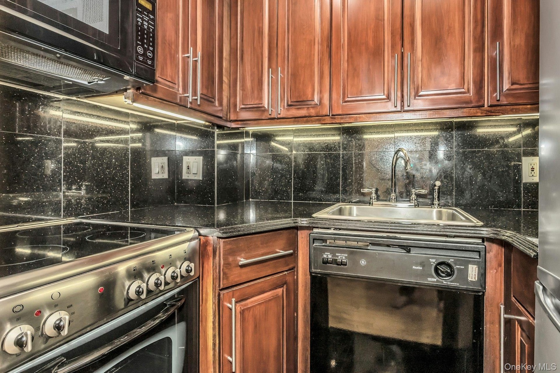 - Kitchen with black appliances, backsplash, dark brown cabinets, and dark stone countertops