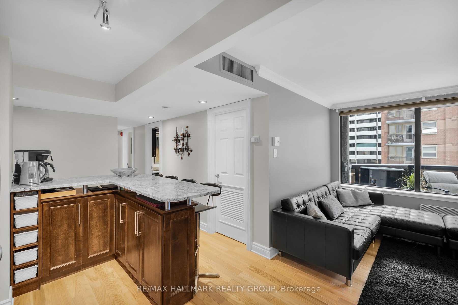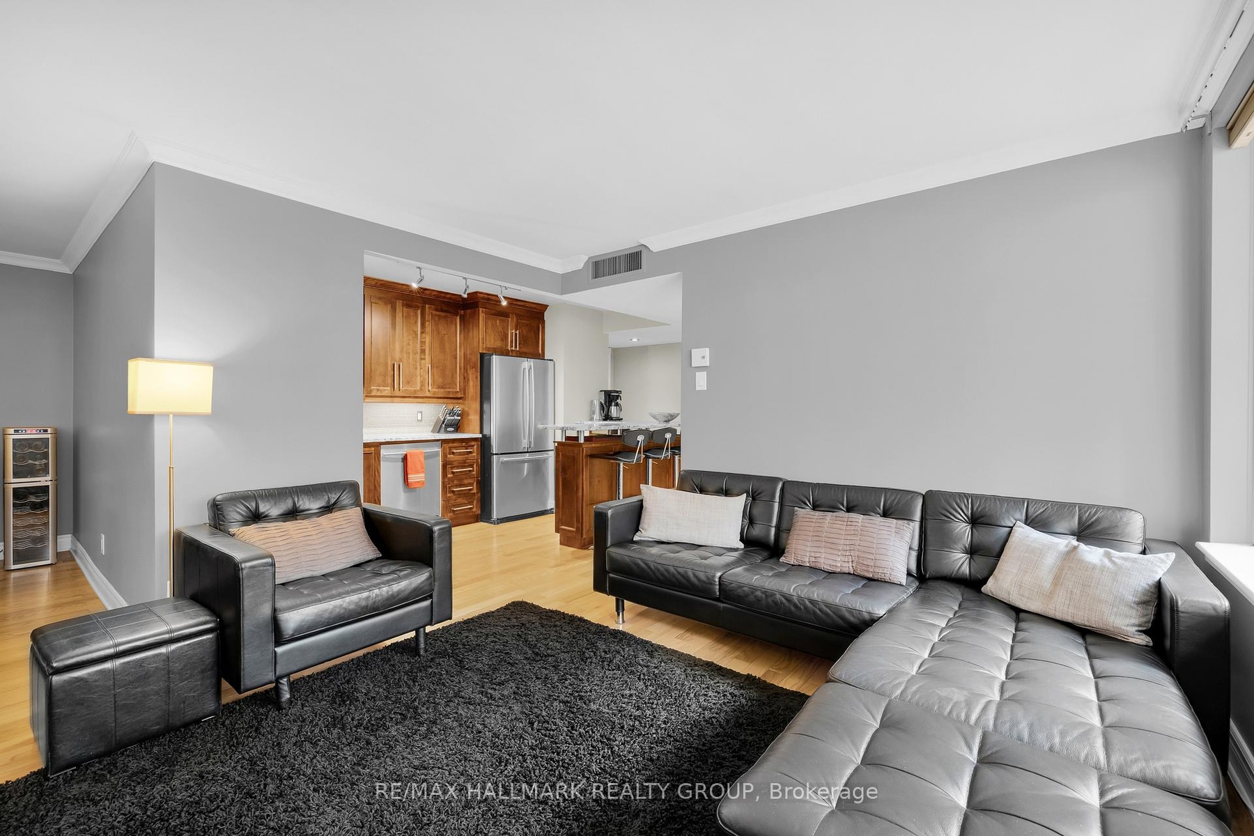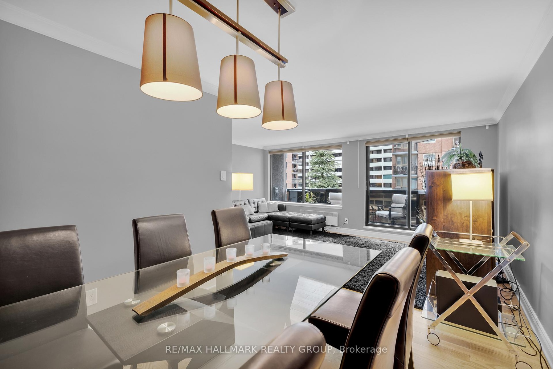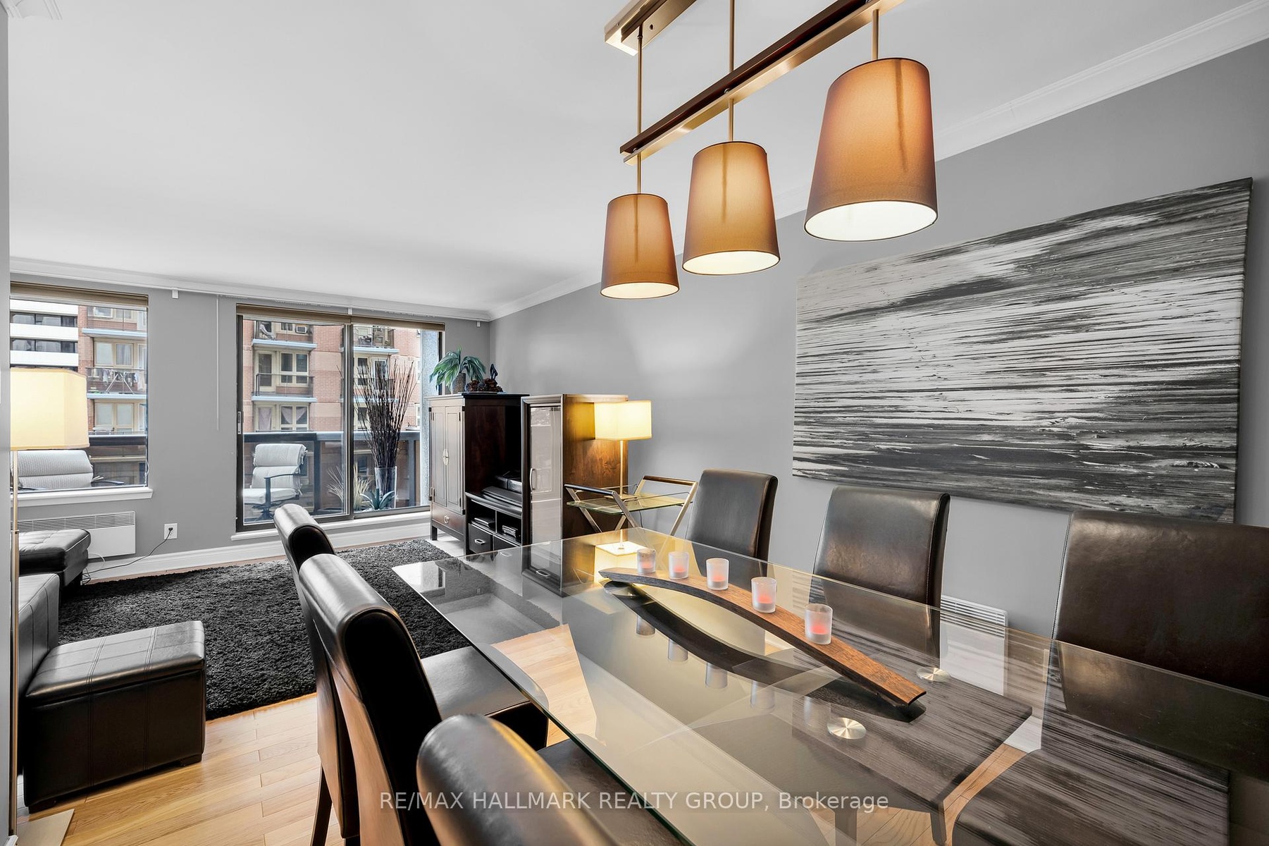 Beautifully updated & move-in ready, this spacious 2-bdrm, 2-bath corner unit condo (app. 1200 sf) blends style, comfort and convenience in the heart of the city. Open-concept layout features soundproof engineered real hardwood floors, crown moulding, high baseboard trim & wood trim around doors, high-end lighting fixtures throughout, and the entire unit is finished in neutral elegant paint tones. From the living area, step out to a large private balcony w/ great city views. The generous dining room offers ample space for entertaining or can easily serve as a home office. The contemporary kitchen is both stylish & functional, complete w/ granite counters on an extended breakfast bar, tiled backsplash, energy-efficient appliances, ample cabinetry & under-cabinet lighting. Both bedrooms are generously sized with excellent storage, while individually controlled wall-mounted heaters & insulated blinds provide comfort & efficiency - helping keep heating & cooling bills low. The primary suite includes a large walk-in closet and private 2-pce ensuite, while the 2nd bedroom also has its own walk-in. The main 4-pce bath is beautifully finished w/ granite counters, updated tilework & excellent storage. A separate laundry room offers a stackable washer/dryer, & loads of storage. This secure building provides excellent amenities: 24-hr concierge & security cameras, indoor saltwater pool, hot tub, saunas, guest suite, party room, rooftop terrace (23rd flr) w/ dining & lounge areas, plus back courtyard w/ BBQ and seating. Unit comes w/ bike storage, storage locker & underground parking. Enjoy the very best of urban living just steps from your everyday conveniences, trendy restaurants, shops, Rideau Centre, Parliament Hill, ByWard Market, Parks, National Museums, all major Government offices, City Hall, & scenic walking/biking paths along the Canal. With Lyon LRT Station & major bus routes nearby, commuting is effortless while still avoiding the congestion of heavy traffic.