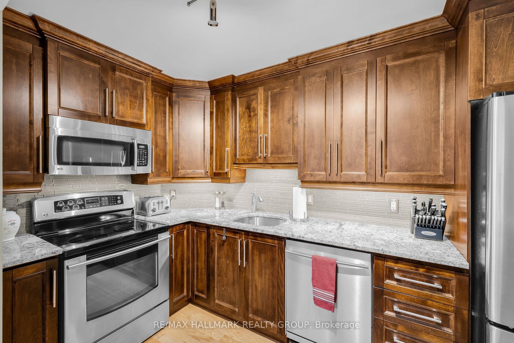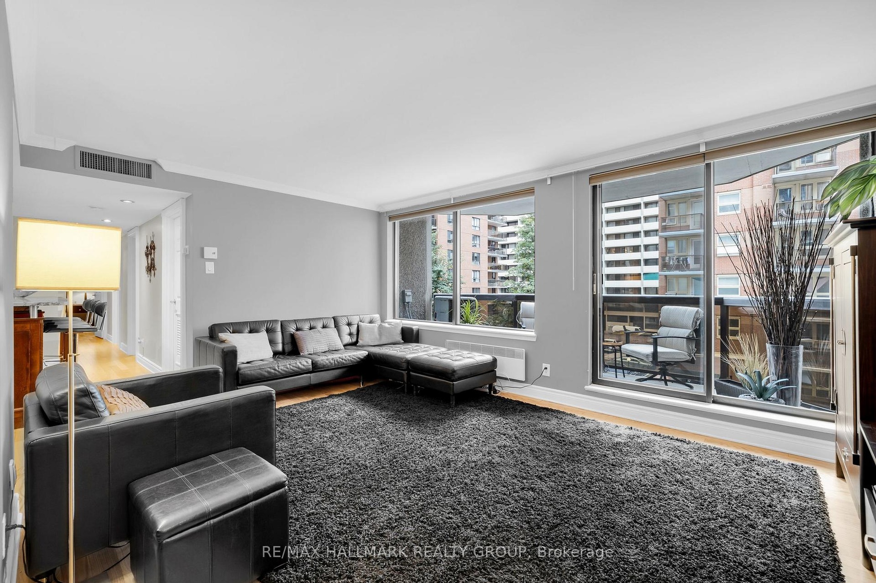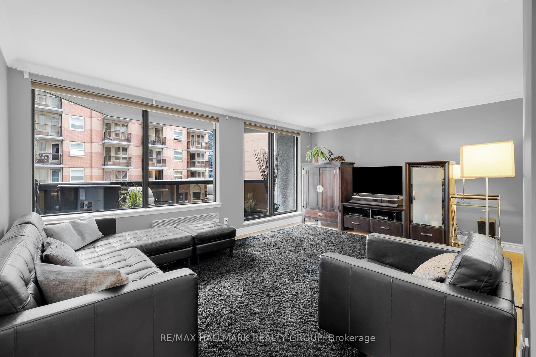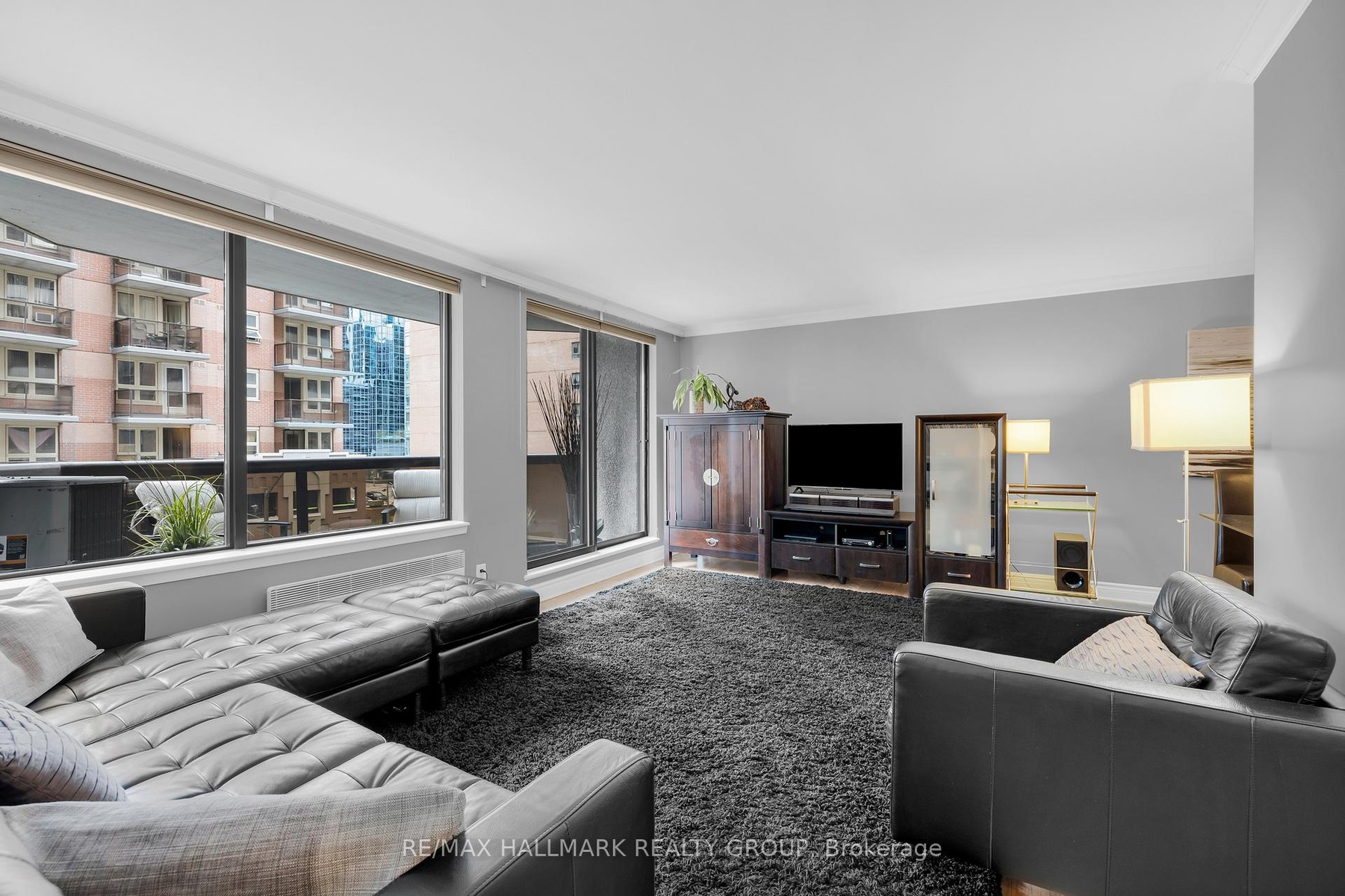 Beautifully updated & move-in ready, this spacious 2-bdrm, 2-bath corner unit condo (app. 1200 sf) blends style, comfort and convenience in the heart of the city. Open-concept layout features soundproof engineered real hardwood floors, crown moulding, high baseboard trim & wood trim around doors, high-end lighting fixtures throughout, and the entire unit is finished in neutral elegant paint tones. From the living area, step out to a large private balcony w/ great city views. The generous dining room offers ample space for entertaining or can easily serve as a home office. The contemporary kitchen is both stylish & functional, complete w/ granite counters on an extended breakfast bar, tiled backsplash, energy-efficient appliances, ample cabinetry & under-cabinet lighting. Both bedrooms are generously sized with excellent storage, while individually controlled wall-mounted heaters & insulated blinds provide comfort & efficiency - helping keep heating & cooling bills low. The primary suite includes a large walk-in closet and private 2-pce ensuite, while the 2nd bedroom also has its own walk-in. The main 4-pce bath is beautifully finished w/ granite counters, updated tilework & excellent storage. A separate laundry room offers a stackable washer/dryer, & loads of storage. This secure building provides excellent amenities: 24-hr concierge & security cameras, indoor saltwater pool, hot tub, saunas, guest suite, party room, rooftop terrace (23rd flr) w/ dining & lounge areas, plus back courtyard w/ BBQ and seating. Unit comes w/ bike storage, storage locker & underground parking. Enjoy the very best of urban living just steps from your everyday conveniences, trendy restaurants, shops, Rideau Centre, Parliament Hill, ByWard Market, Parks, National Museums, all major Government offices, City Hall, & scenic walking/biking paths along the Canal. With Lyon LRT Station & major bus routes nearby, commuting is effortless while still avoiding the congestion of heavy traffic.