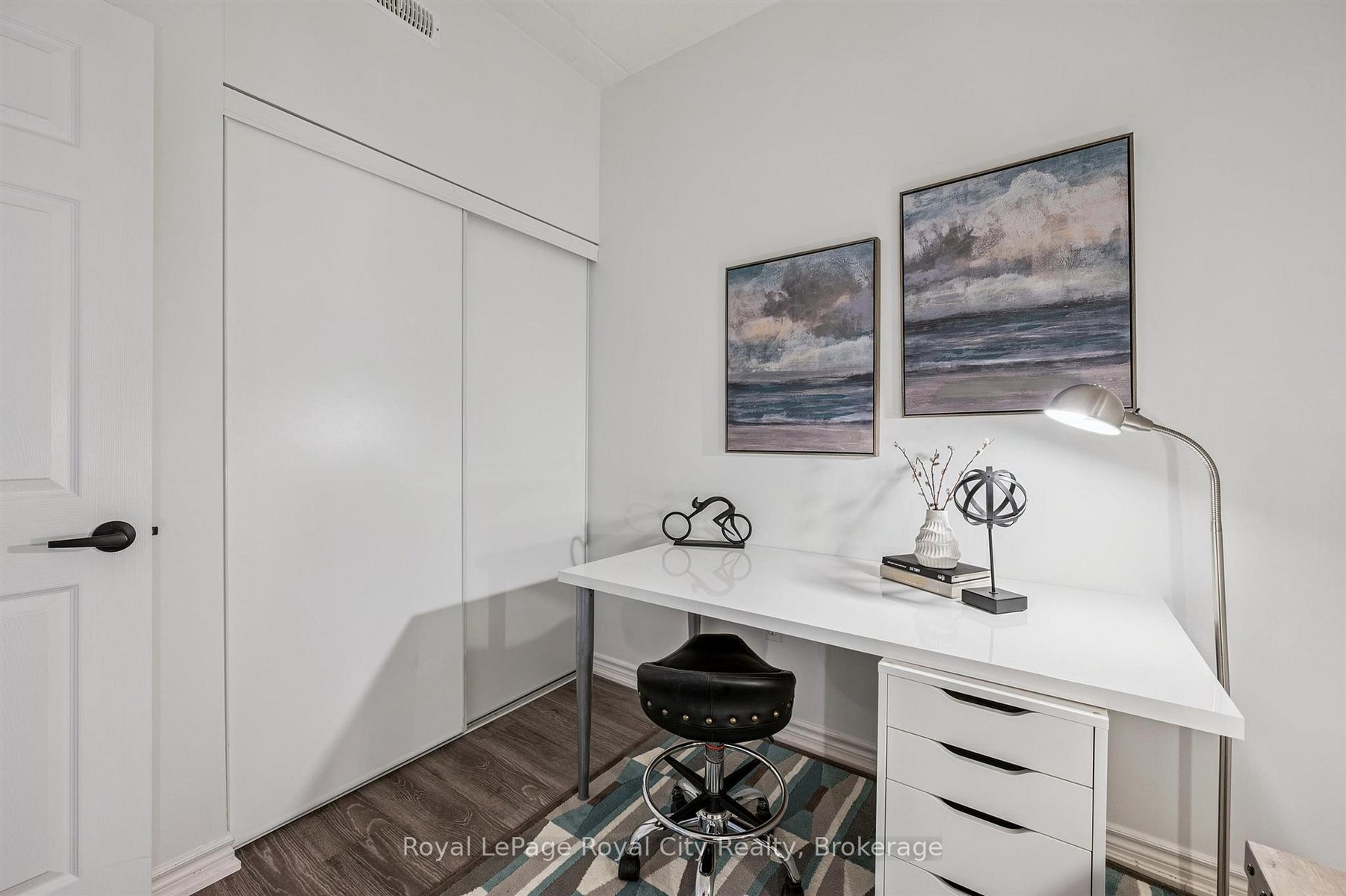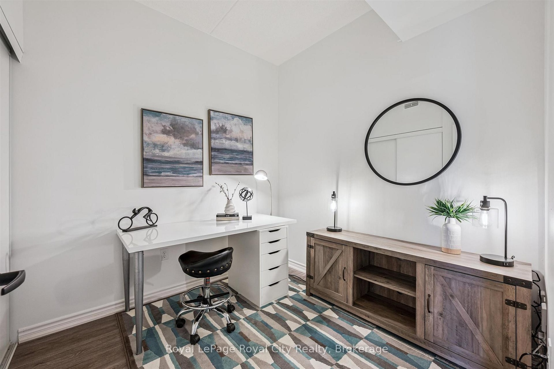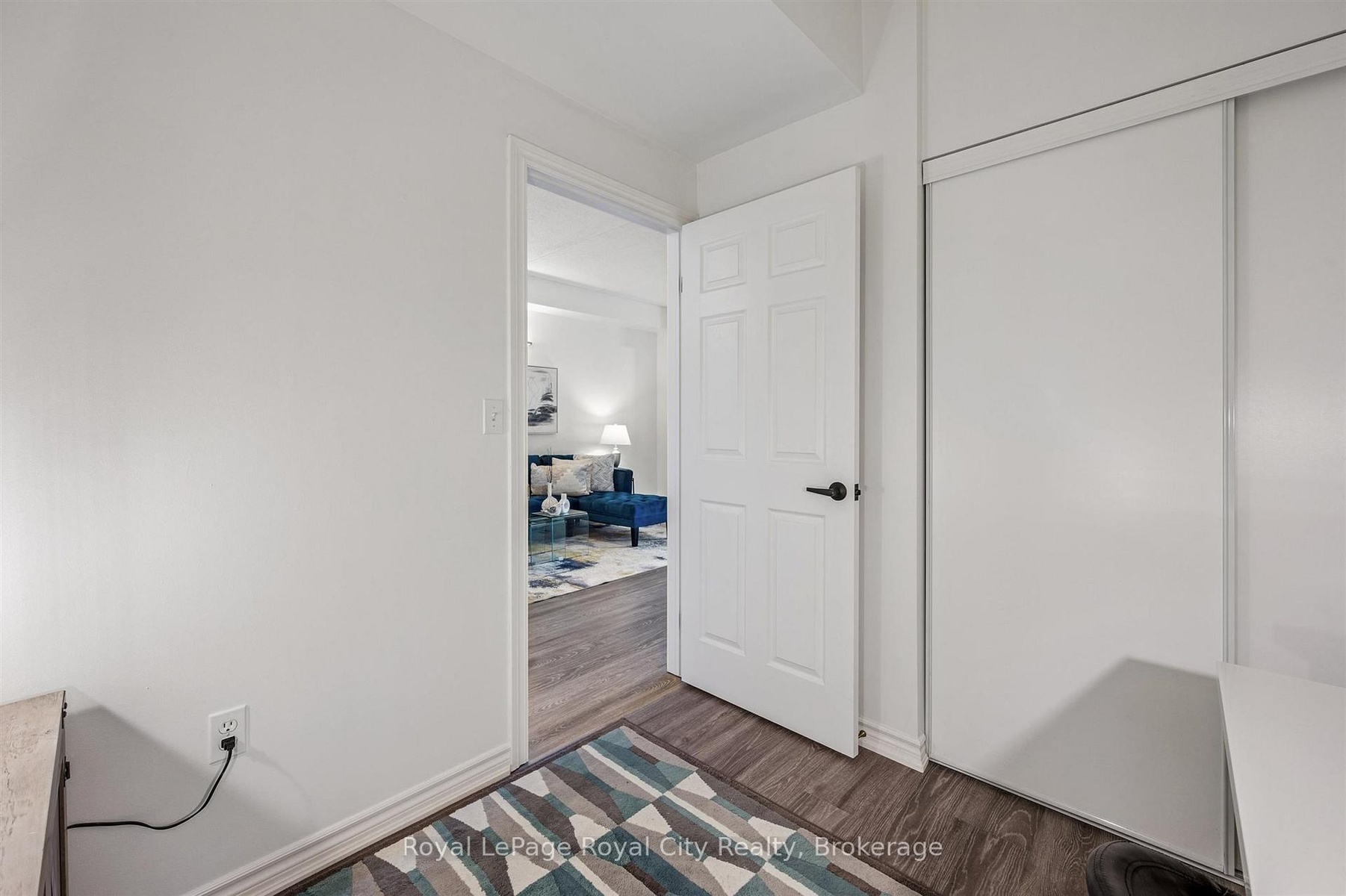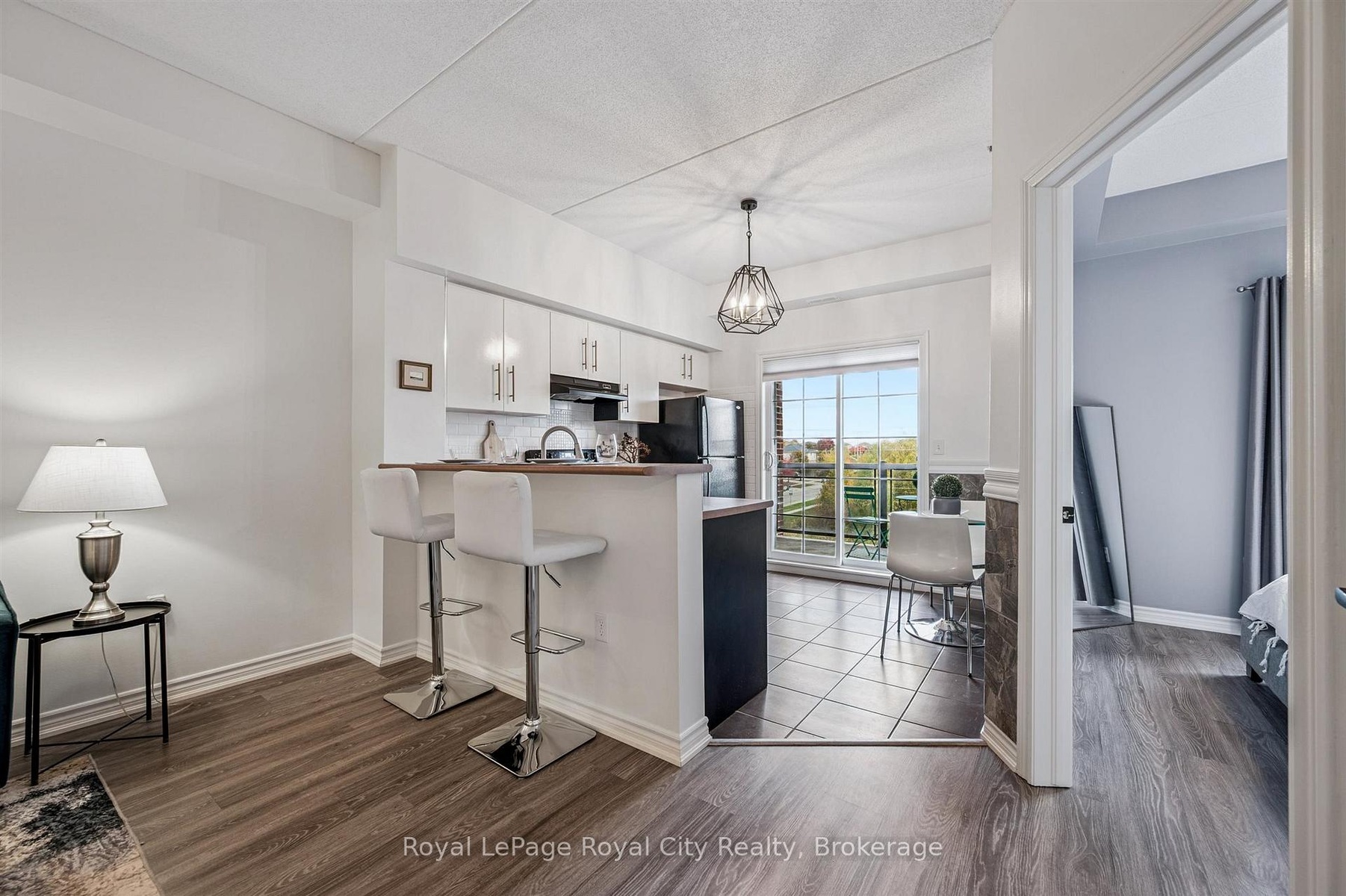 Thinking of getting into the housing market but feeling a bit nervous? I get that...it's a huge step. Here is the thing, why not start small and have a look at this cozy third floor condo in Guelph's quiet east end. This 1 bedroom plus den condo has been freshly painted and is awaiting your arrival. With an open concept floor plan, entertaining for friends is easy with a kitchen that has lots of counter and cupboard space and the convenience of eating at the breakfast bar or the bistro table. Ensuite laundry tucked into a closet, makes this chore easy and efficient while you work away in the den, lounge on the balcony or fix dinner. This unit comes with one parking spot, lots of closet storage and access to schools, parks and a direct bus route to the University of Guelph too. So, start small, ease into the market and enjoy easy living while you build up your equity, enjoy all that the east end has to offer and plan for your one day "forever" home. Have a peek at this cutie today! I think you will be impressed without the awful feeling of being nervous.