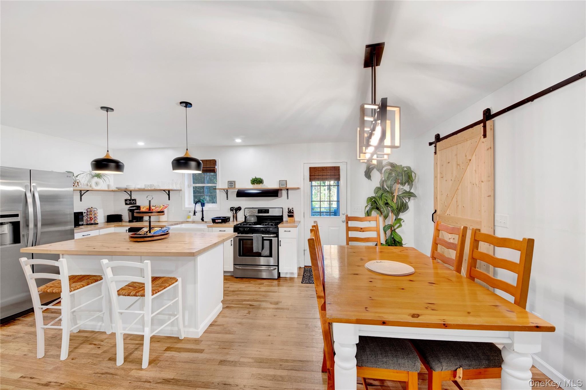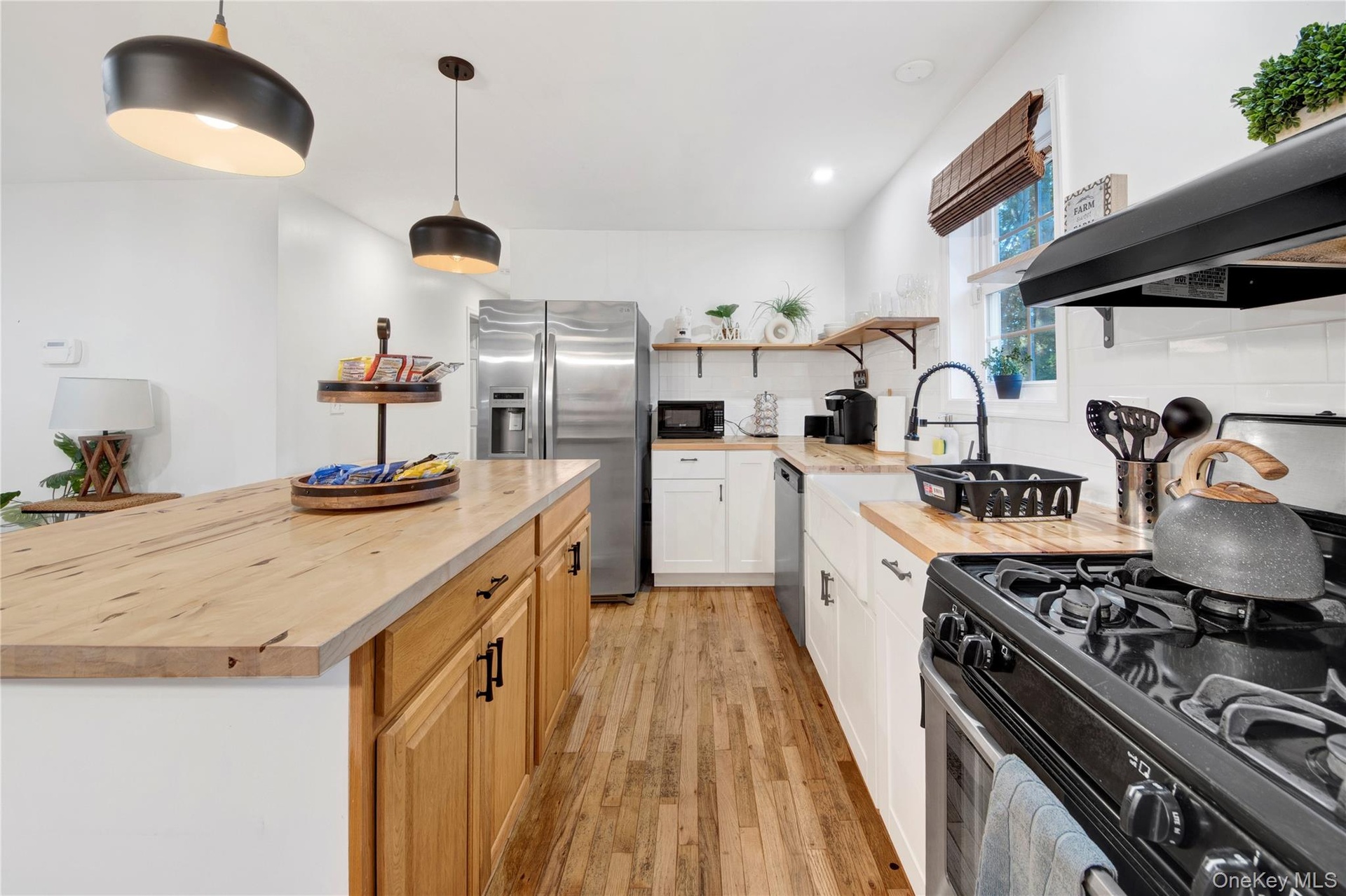 Step inside to an inviting layout where the kitchen, dining, and living areas flow seamlessly. The kitchen features warm butcher block countertops, stainless steel appliances, a center island, open shelving, and a clean, modern design perfect for gathering and entertaining. Natural light floods the living room, accented by hardwood floors and serene views of the surrounding nature.