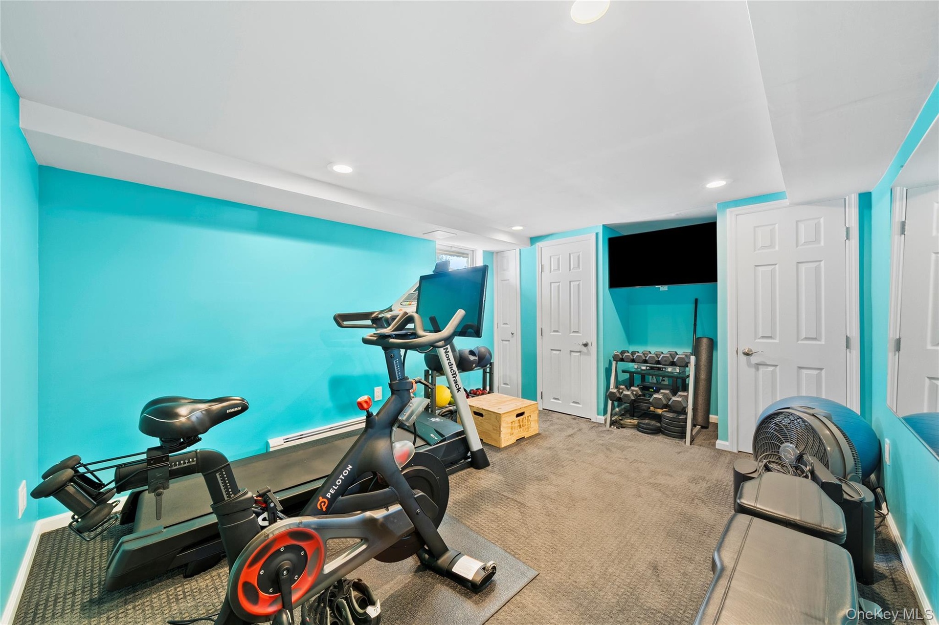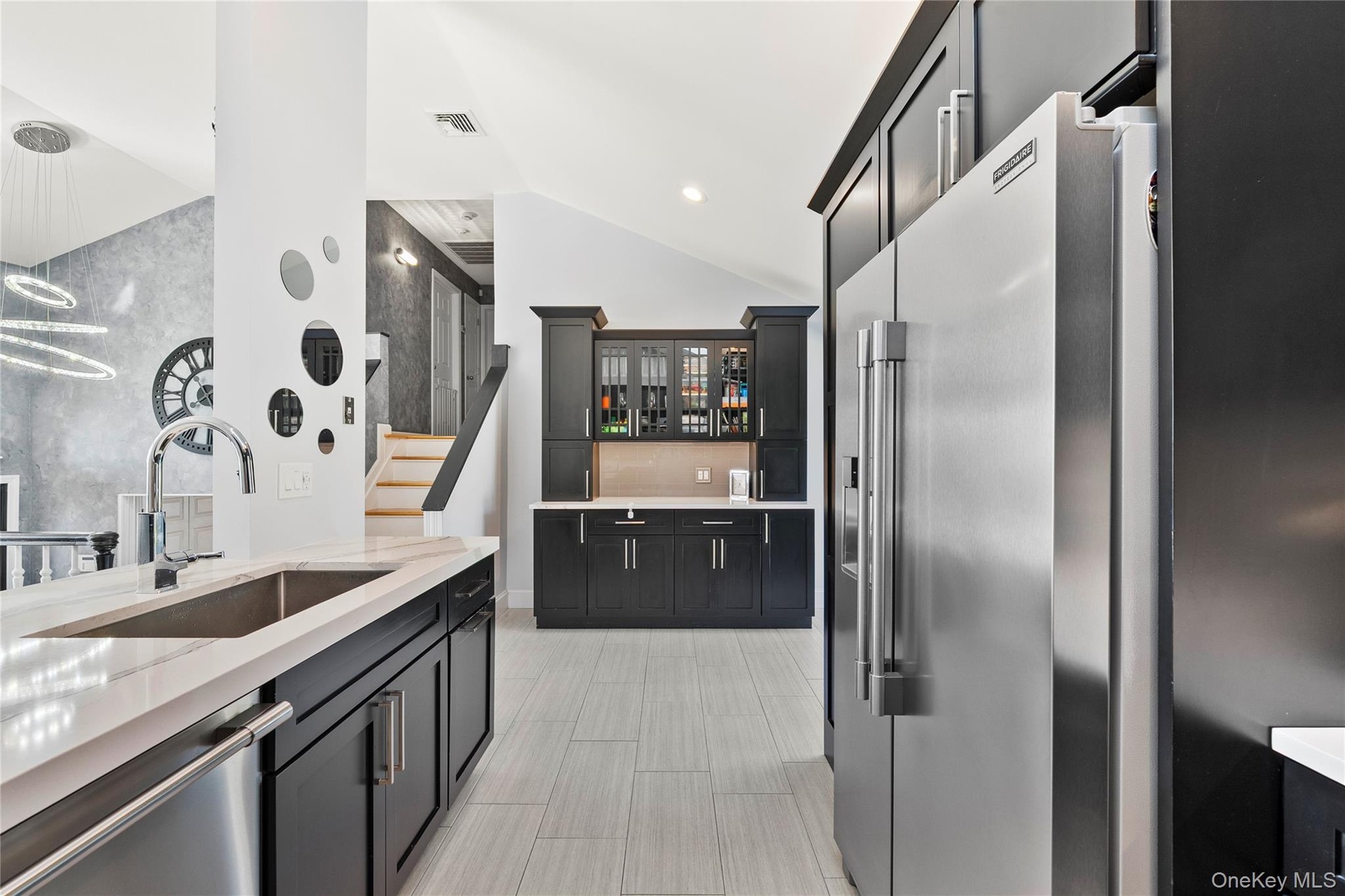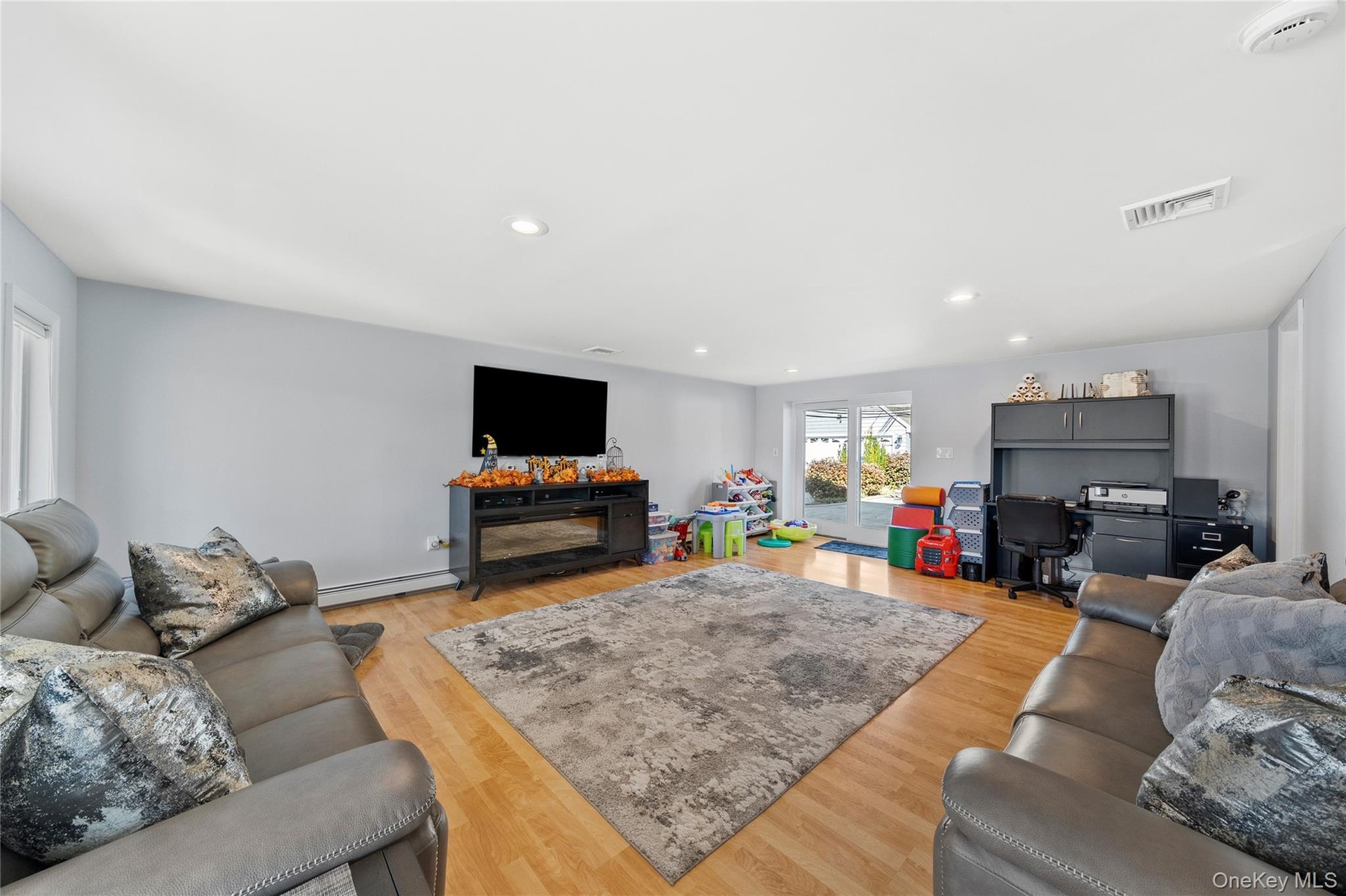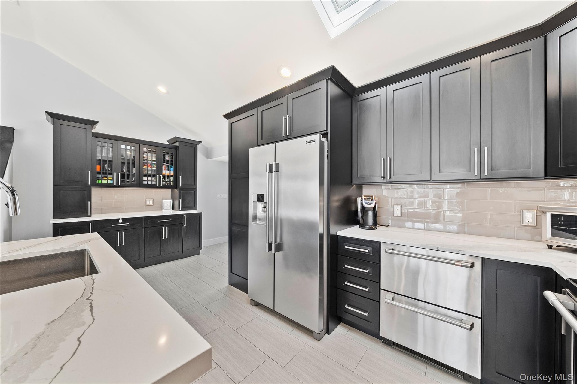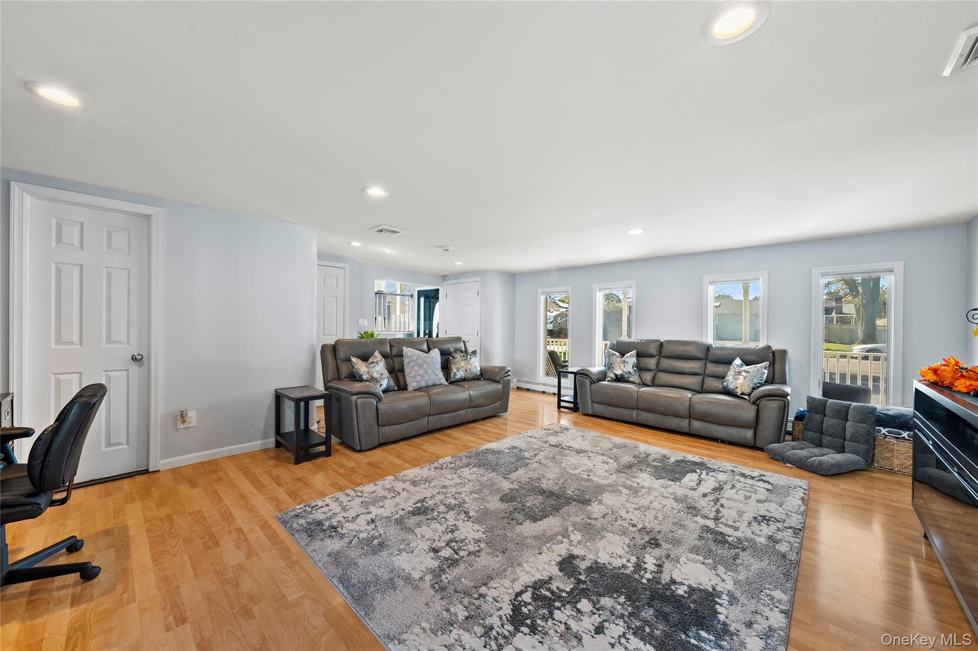 Inside, you’ll find a bright open-concept layout with an impressive chef’s kitchen featuring quartz countertops, sleek cabinetry, stainless steel appliances, and a skylight that fills the space with natural light. Both the kitchen and dining area include radiant heated floors for year-round comfort. The spacious living room is ideal for entertaining, with recessed lighting and multiple windows creating a warm and open atmosphere.