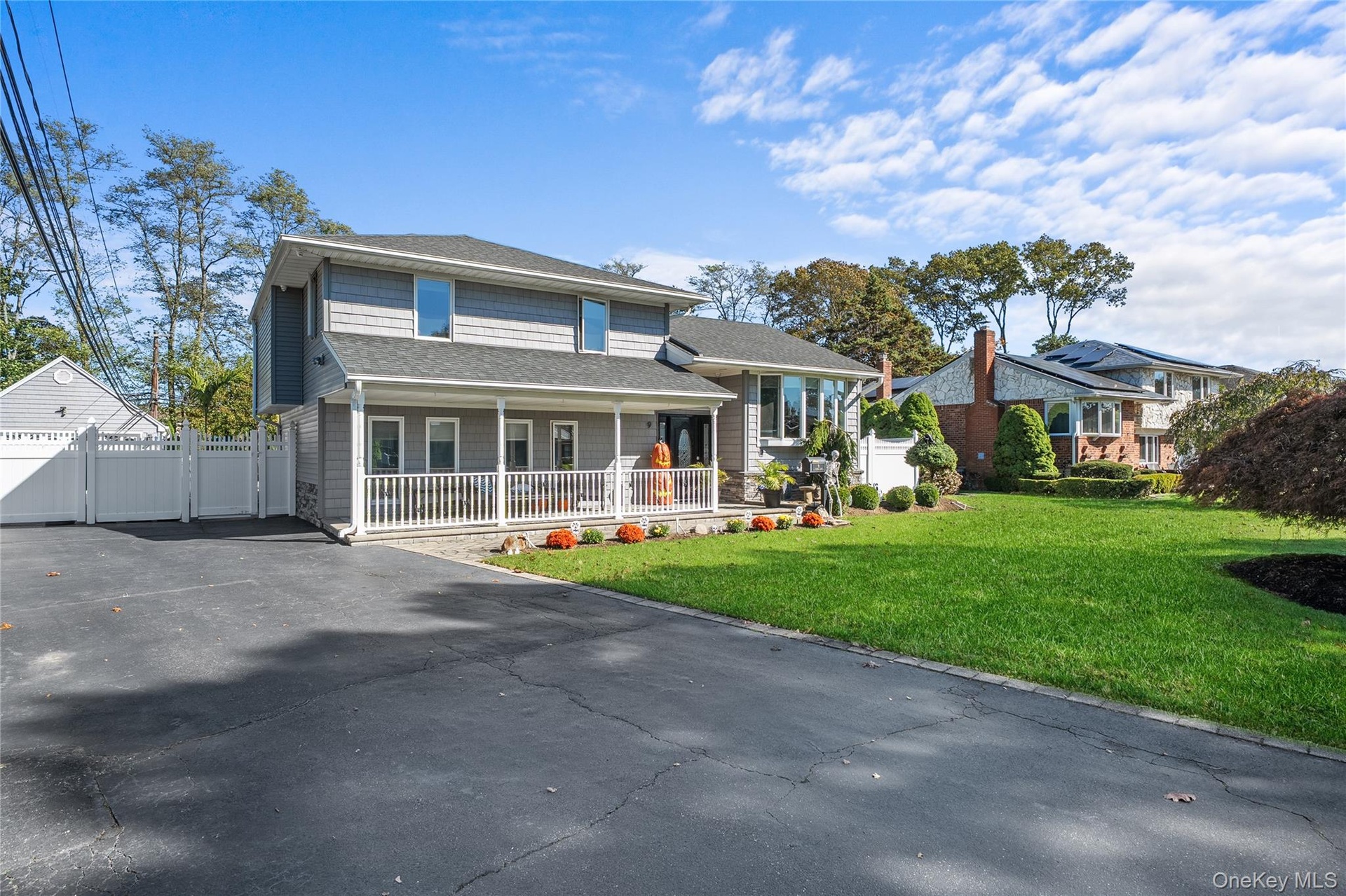 The inviting exterior features a welcoming covered front porch, updated siding, roof, and windows, and a large front yard with clean landscaping. The oversized driveway leads to a massive two-car detached garage w/ 2nd floor loft, providing ample parking and storage.