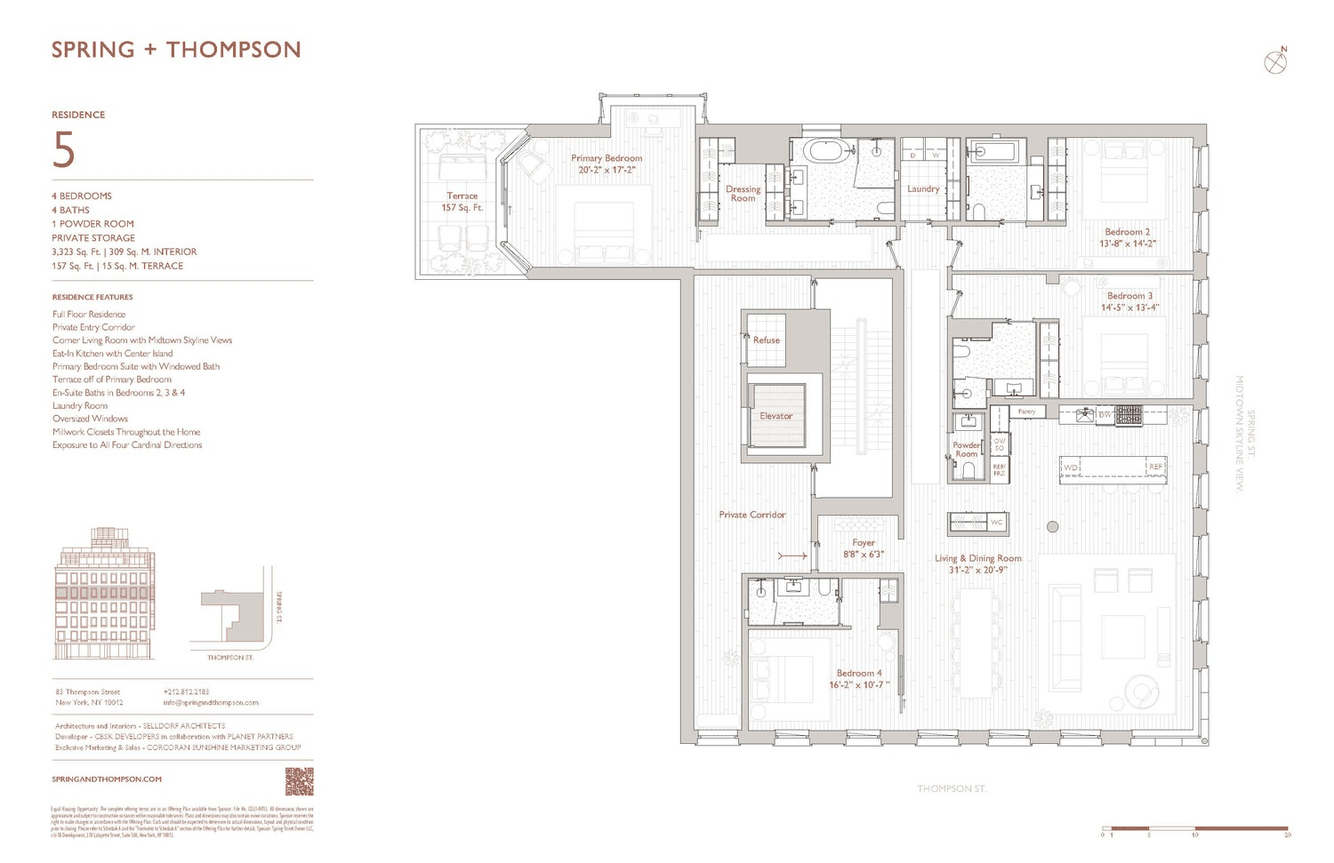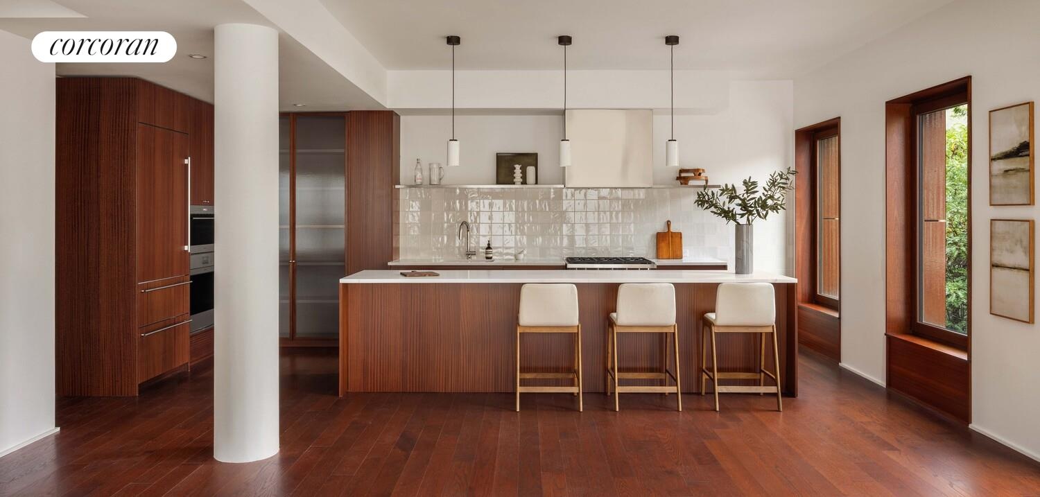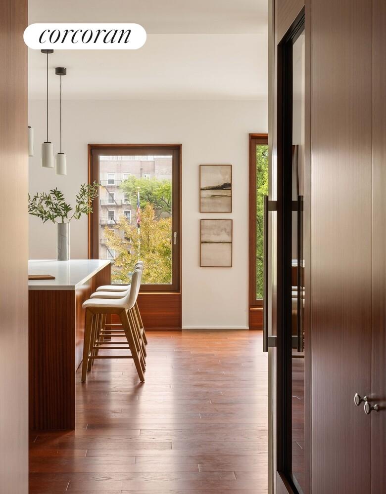 Residence 5 is a one-of-a-kind full-floor 4 Bedroom home with incredible light and panoramic city views. The spacious 3,323 Sq. Ft. layout features an enormous corner great room with large eat-in kitchen and center island, including mahogany cabinetry, luxury appliances, and marble countertops. The home is lined with oversized wood-framed windows that look out across a tree-filled pocket park with open skies above and the midtown skyline beyond.