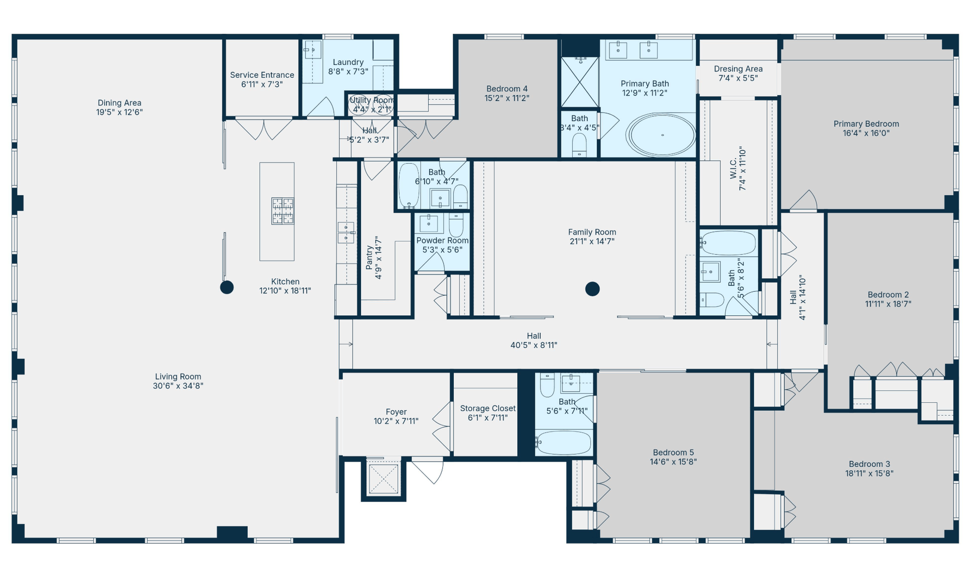 Stepping off the secure keyed elevator and into the spacious entry foyer, with an enormous storage closet off to the side, one is greeted by the massive great room, which spans nearly 50-feet and has nine huge windows facing south. The great room is so large there is space for two separate living areas and dining room with space for a 20-person dining table. The open kitchen, which can be closed off with elegant sliding doors, is a dream for any chef - top of the line appliances, including a large, vented range stove and Subzero refrigerator. Off the kitchen is a large laundry room with vented washer-dryer, a spacious pantry, and a fifth en-suite bedroom – perfect for guests or an au pair. Down the hallway on the way to the bedroom wing of the home, there is a powder room and spacious family/media room for the entire family to relax and enjoy. Four oversized bedrooms and three bathrooms make up the bedroom wing. The spacious primary bedroom suite comes with a huge custom walk-in closet and en-suite bathroom with a double-sink vanity, oversized soaking tub, walk-in shower, and separate toilet room for privacy. Gorgeous, newly finished solid oak floors, recessed lighting, ample storage and abundant closets throughout, round out this incredible home.