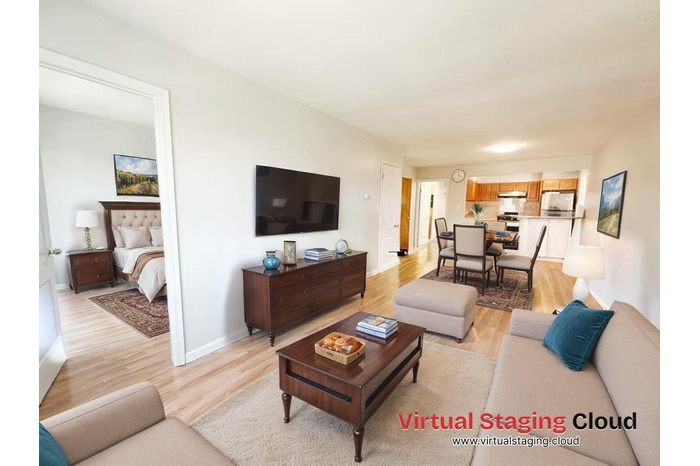 kitchen with stainless steel appliances, island and spacious true living room/dining room. First