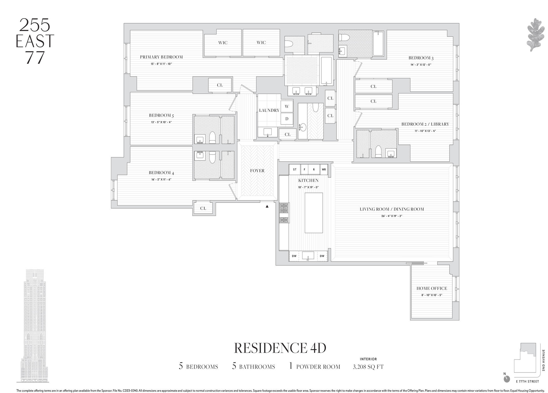 The Yabu Pushelberg-designed public spaces and amenities, bring a fresh and vibrant point of view while still respecting the Upper East Side sensibility. In the tower, a seventy-five-foot swimming pool with soaring ceilings and beautiful views is the centerpiece of a collection of comprehensive wellness and entertainment spaces designed with a hospitality perspective, including a fitness center, yoga room, spa with steam room and sauna, and a massage/treatment room. A library in the sky with a charming fireplace opens to a dramatic outdoor space. Additional building amenities are all designed at the highest level with something for everyone, including a cinema, a sports simulator, a kids club space, and a soundproof music practice room with a recording studio. Beyond the gates of the porte-cochere, there is a concealed automated parking system at ground level. The lobby will be attended 24 hours a day with a doorman and concierge service. The complete offering terms are in an offering plan available from the sponsor, file number CD23-0340.