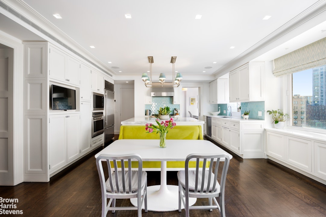 Enter on the 13th floor into a lovely gallery with lots of closet and storage space. The dramatic, oversized chefs eat-in kitchen has several windows, including a huge picture window with amazing, and protected, views of the Hudson River. There is an extra-large vented Viking stove, 2 ovens, a double sink and lots of counter and cabinet space. There is also a large center island as well as a big table for eating-in. The adjacent office is big enough for 2 people to work, with the same amazing River view out of enormous windows. Off the kitchen, towards the service entrance, there is a convenient laundry room/mud room with vented side by side washer/dryer and additional storage. The living room, formal dining room and a very spacious additional library/ fifth bedroom with renovated full bathroom are also on this floor. A ll 3 rooms have open North views and the library/ fifth bedroom has a West facing window with a Hudson River view! A lovely windowed powder room with a shower is also found on this floor. Up an elegant staircase are the private quarters where there are 4 large bedrooms and 3 full bathrooms. The 3 large secondary bedrooms face North. Two share a renovated windowed hall bathroom. The third bedroom is a corner room with a River view from its Western exposure and has an en-suite bathroom.