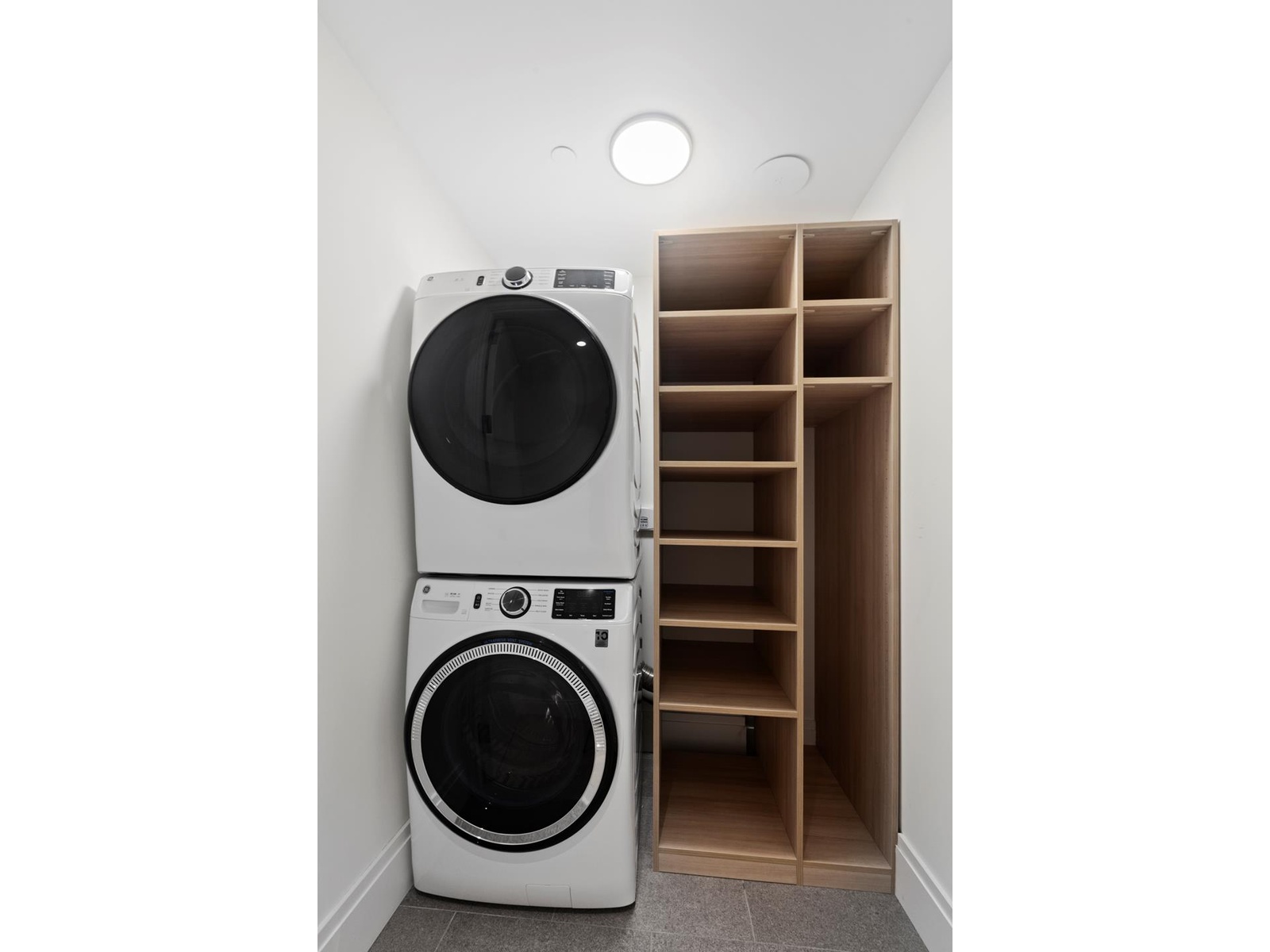 The open-concept Smallbone kitchen features white painted cabinetry, blonde oak portal, and Mountain White marble countertops/backsplash. Premium Subzero & Miele appliance package including an integrated refrigerator/freezer, gas cooktop, convection oven, speed oven, warming drawer, built-in hood, fully integrated dishwasher, and Sub-Zero wine fridge. A dedicated laundry room features a vented washer and dryer.