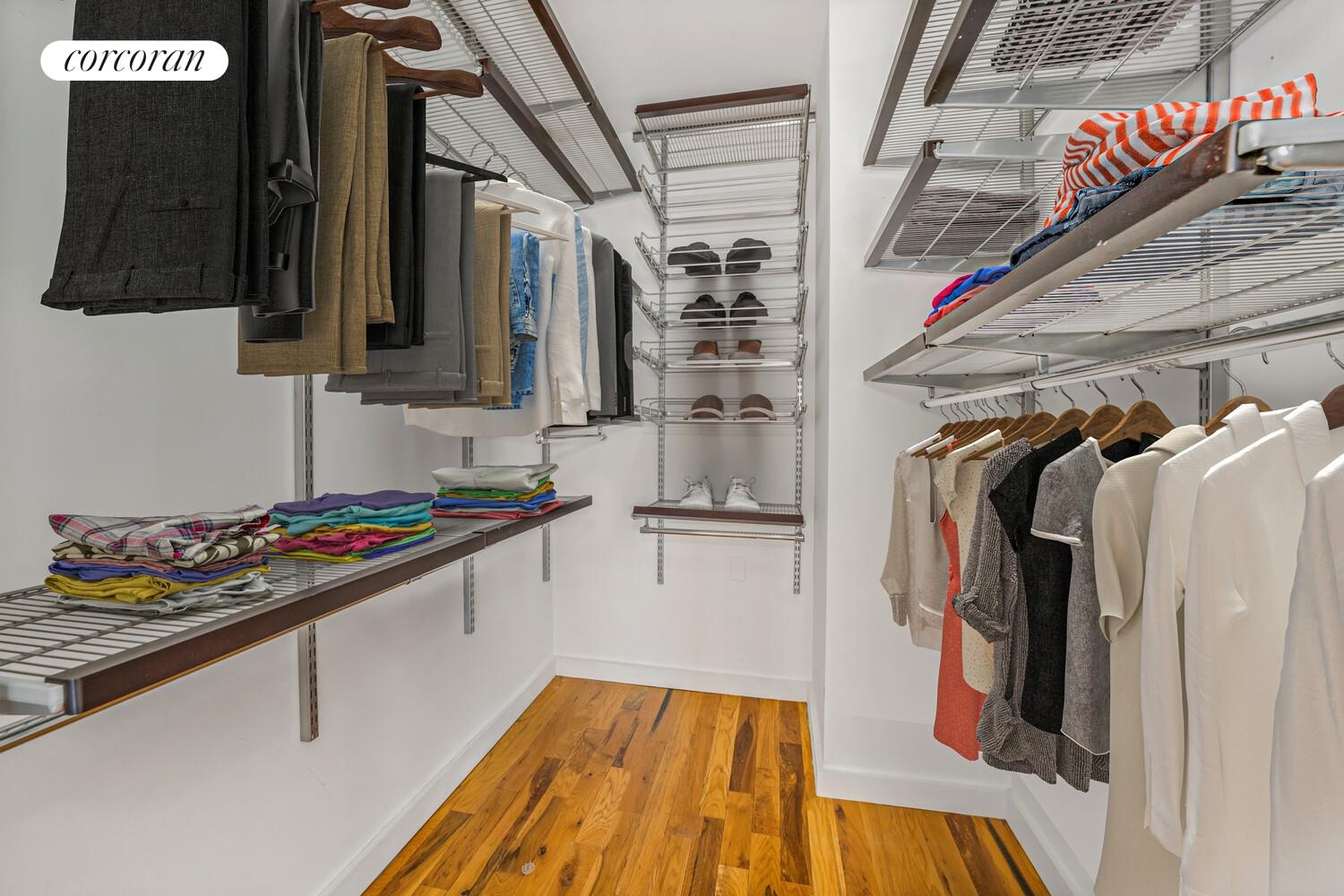 This lofty condo spans approximately 898 sq ft, with an expansive living and dining area with oak floors, floor to ceiling casement windows that flood the space with natural light, and a stylish Juliette balcony. Another Juliette balcony graces the king sized with a walk in closet. Some have used the large closet as a private office.