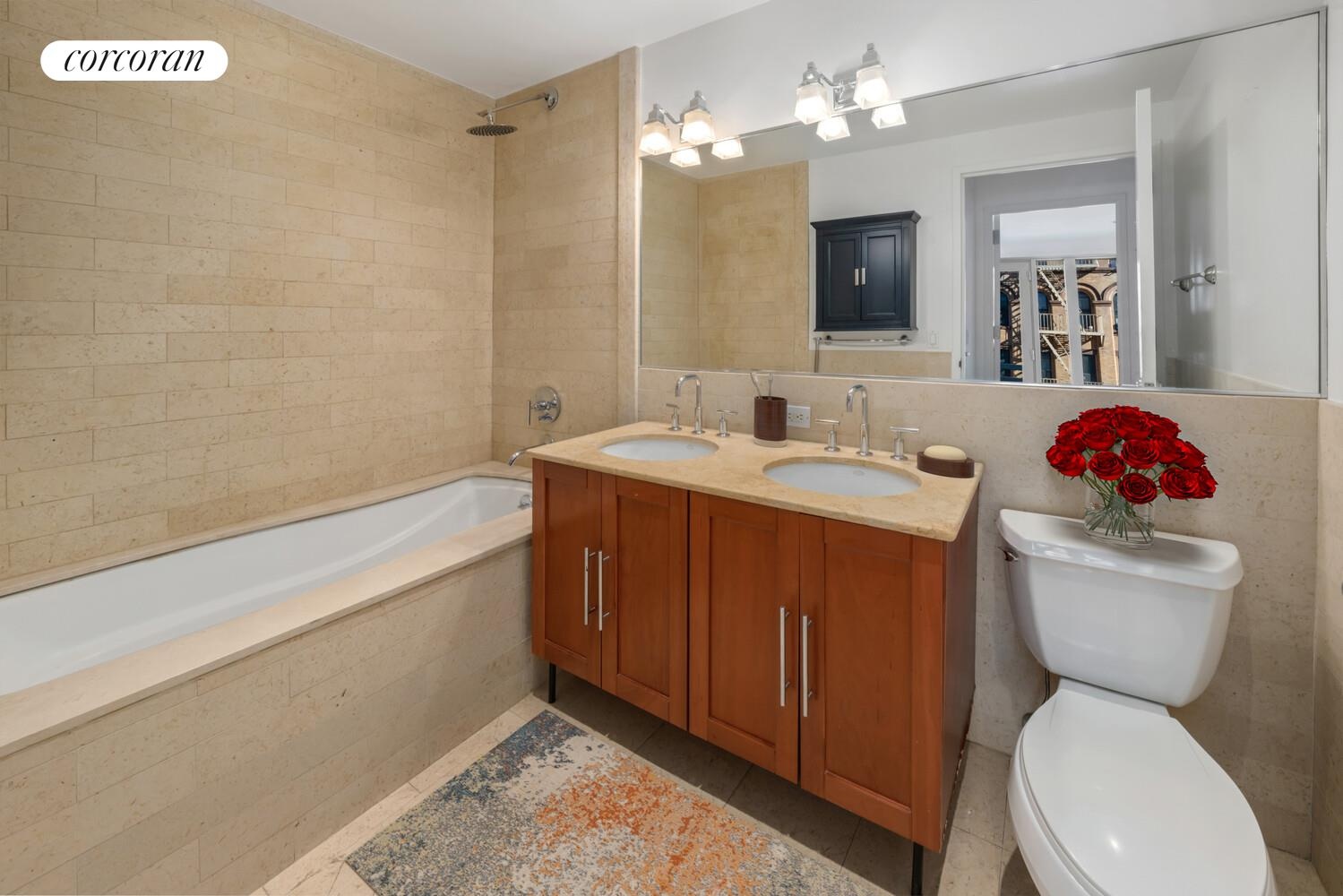 Entertaining is easy in this open kitchen with the granite island and quality cabinetry + a pantry area. The bathroom suits two people comfortably featuring double sinks, a soaking tub and marble and stone finishes.