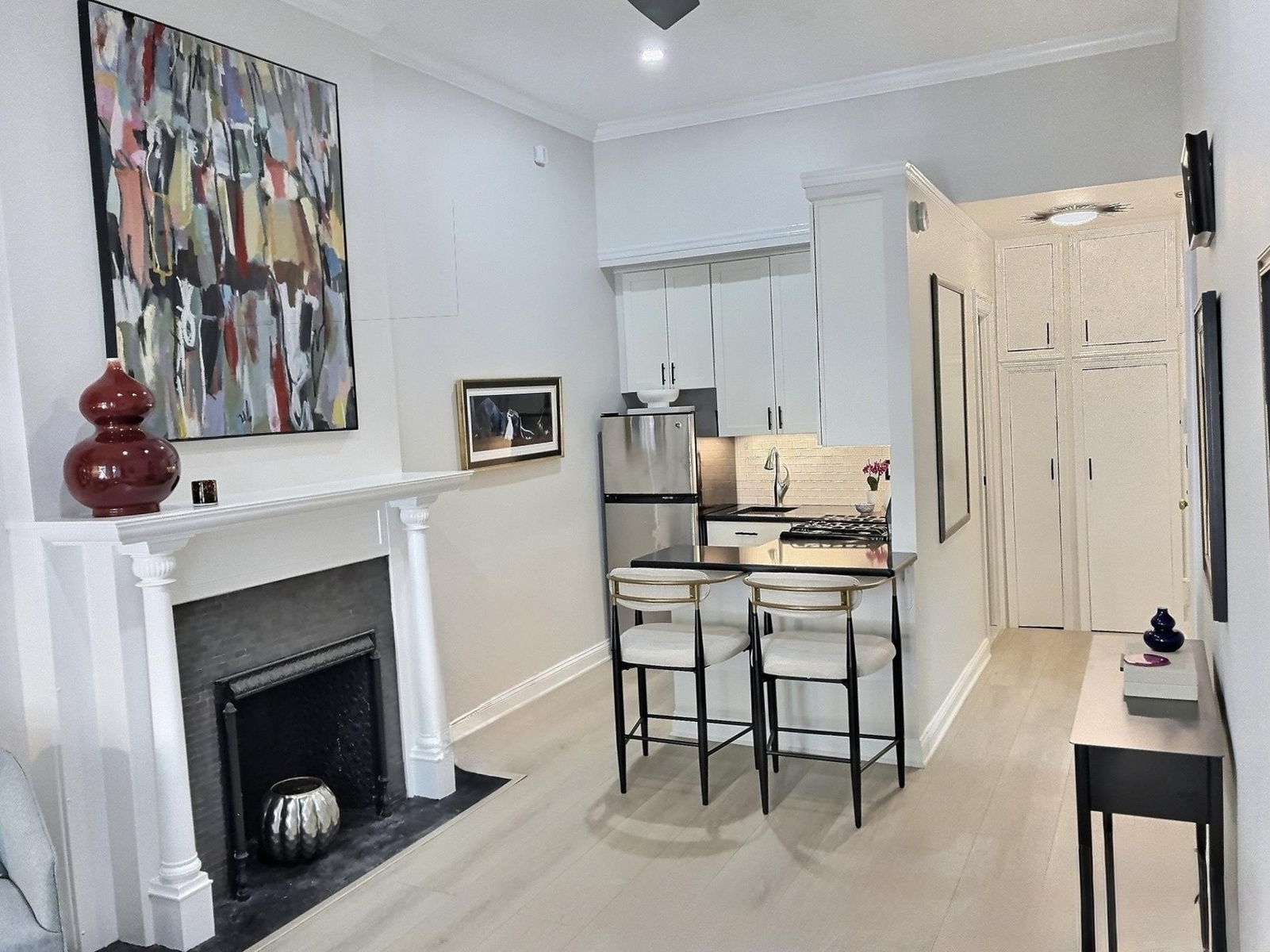 The living room easily accommodates both relaxation and productivity, offering room for a dining table, home office, or reading nook. The kitchen features stainless steel appliances, granite countertops, and a convenient breakfast bar—perfect for dining, entertaining, or working from home. Pre-war details such as the decorative fireplace, crown molding, and original pocket shutters preserve the elegance and charm of a bygone era.