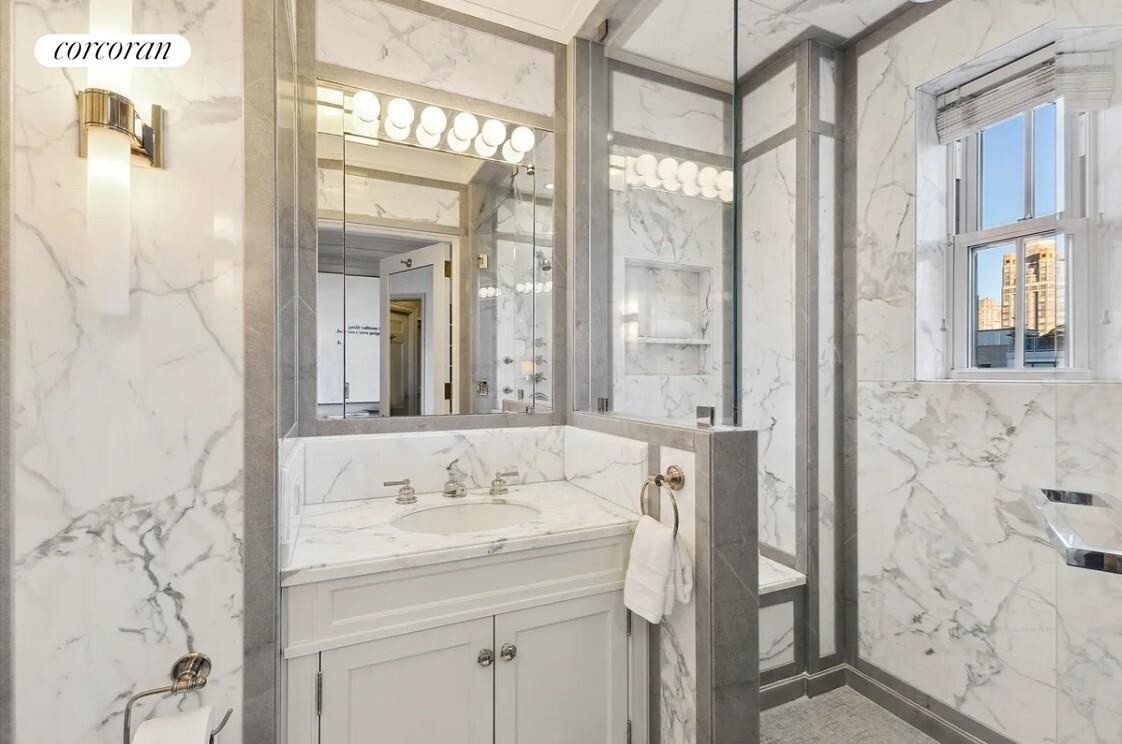 The private quarters include a serene corner primary bedroom with eastern and southern exposures over Park Avenue, two generous walk-in closets, and a luxurious ensuite windowed bathroom with hand-hewn fluted Italian marble. Three additional sun-filled bedrooms each with ensuite bathrooms and abundant closet space and offer wonderful bright city views.