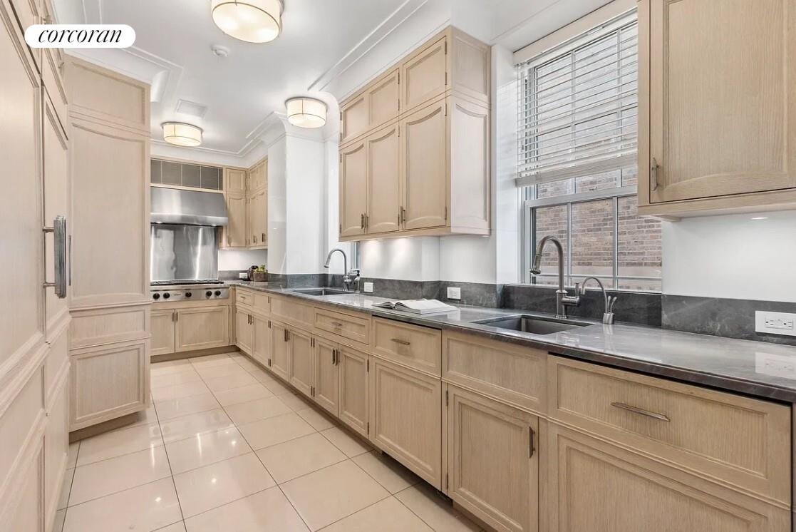 The immaculate, sunny chef's kitchen features Brazilian Azul Macaubas blue quartzite counters and cerused wood cabinetry. Adjacent to the kitchen is the windowed breakfast room, a large pantry as well as a separate sunny service wing with a breakfast bar, laundry area, and two bedrooms with a full bath.