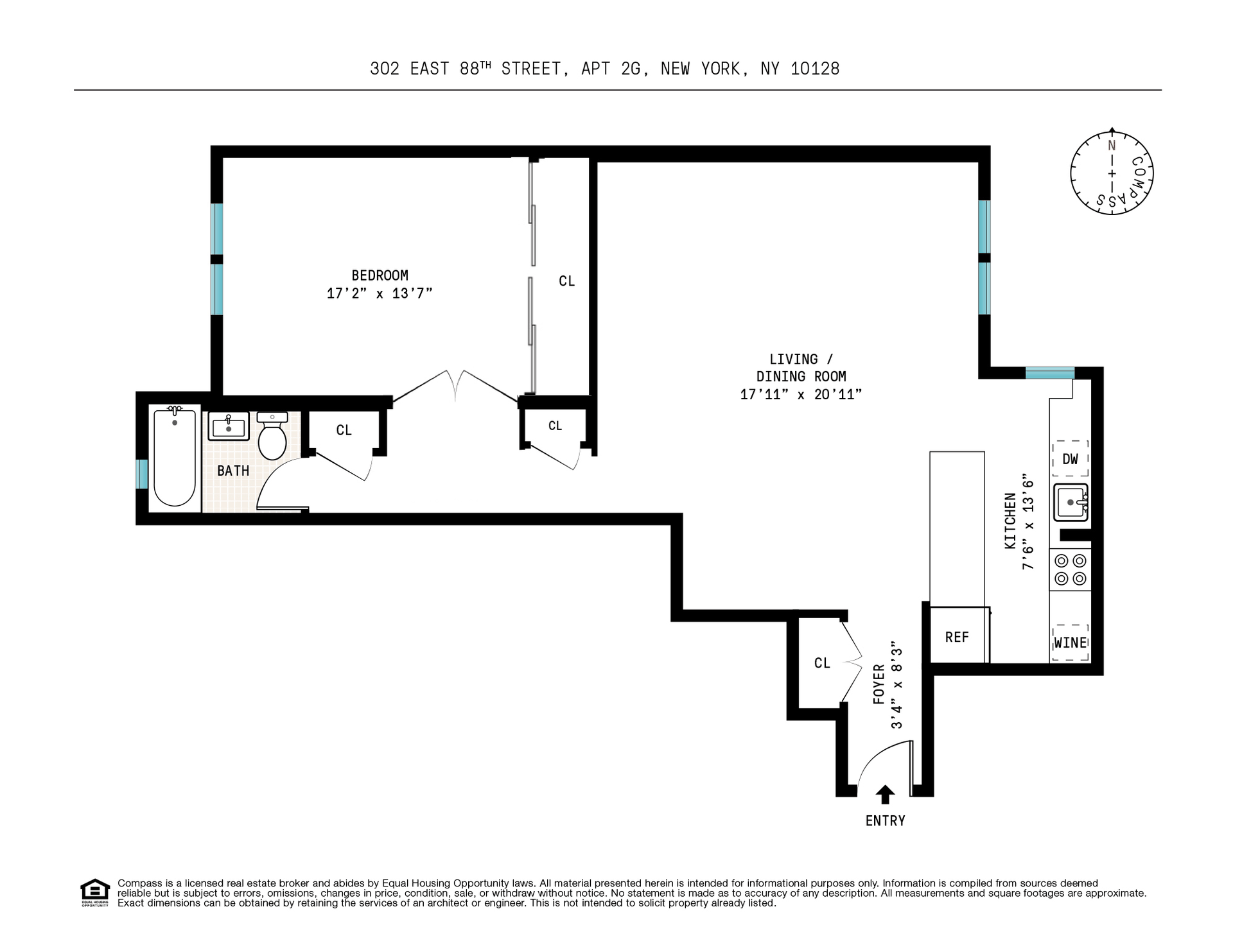Spanning approximately 800 square feet, unit 2G welcomes you with tall ceilings, hardwood floors and windows on three exposures. A gracious foyer with a large closet ushers you into the oversized living/dining room, offering a generous footprint for relaxing and entertaining surrounded by south-facing windows, recessed lighting and a designer chandelier. The renovated open kitchen wows with beautiful cabinetry, quartz counters, glass tile backsplashes and a large farm sink illuminated by undercabinet lighting. Enjoy casual meals and conversation at the breakfast bar while a fleet of stainless steel appliances -- including a gas range with double ovens, a dishwasher, a wine refrigerator, a built-in microwave and wine fridge -- make cooking and cleaning a breeze. The king-size bedroom provides a wall of closets, ceiling fan and plenty of space for a home office or fitness area. A windowed bathroom with a large tub/shower, contemporary fixtures, and classic subway and penny tile completes this move-in ready Yorkville retreat.