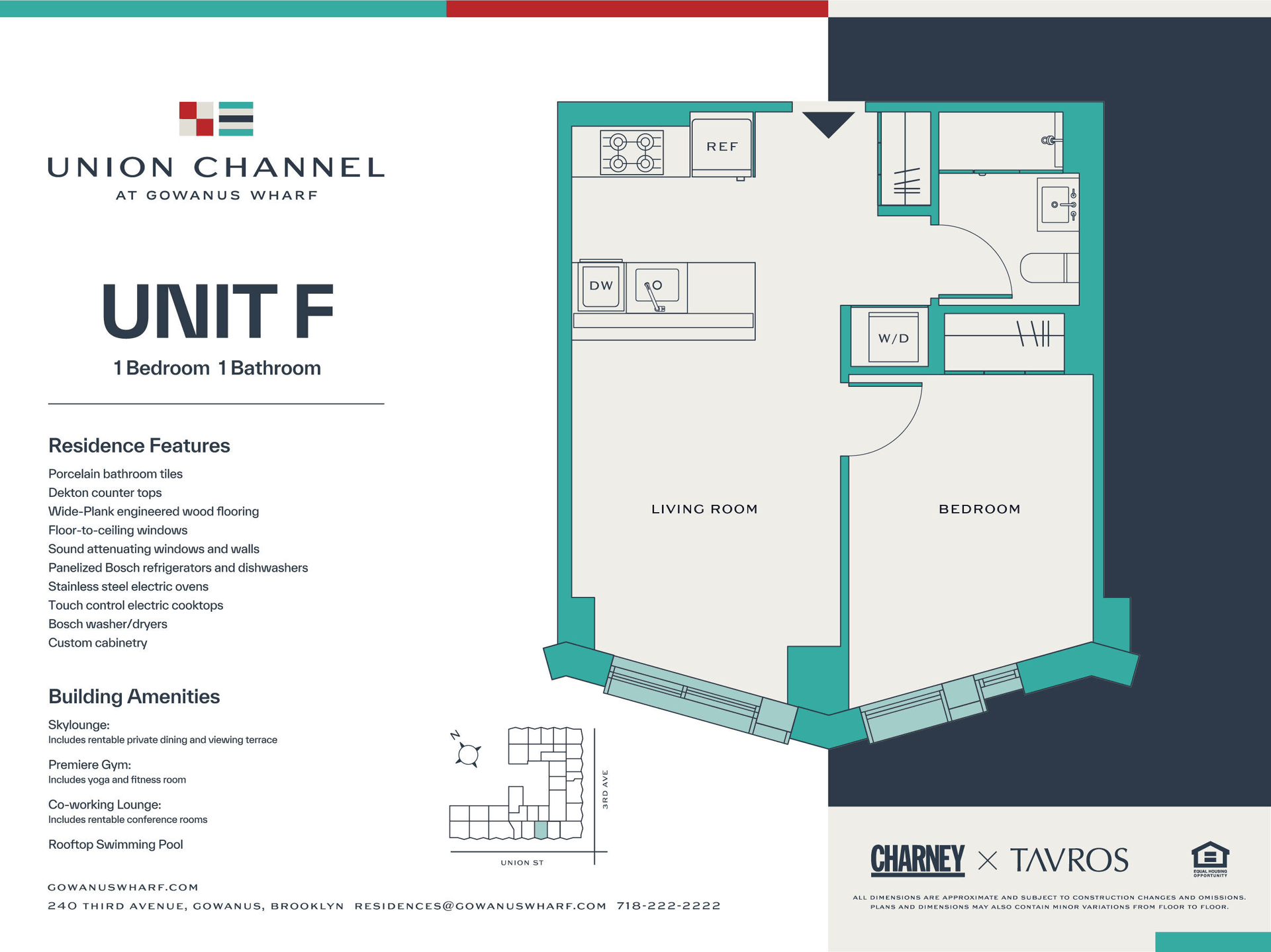 Union Channel marks the debut of Gowanus Wharf’s campus of residential buildings in the heart of Gowanus, Brooklyn. Situated on the corner of Union Street and 3rd Ave, Union Channel is a collection of 224 apartments, easily identifiable by its undulating facade and metal paneled angular-shaped bay windows, and one block from the R train and just 3 stops into Manhattan.