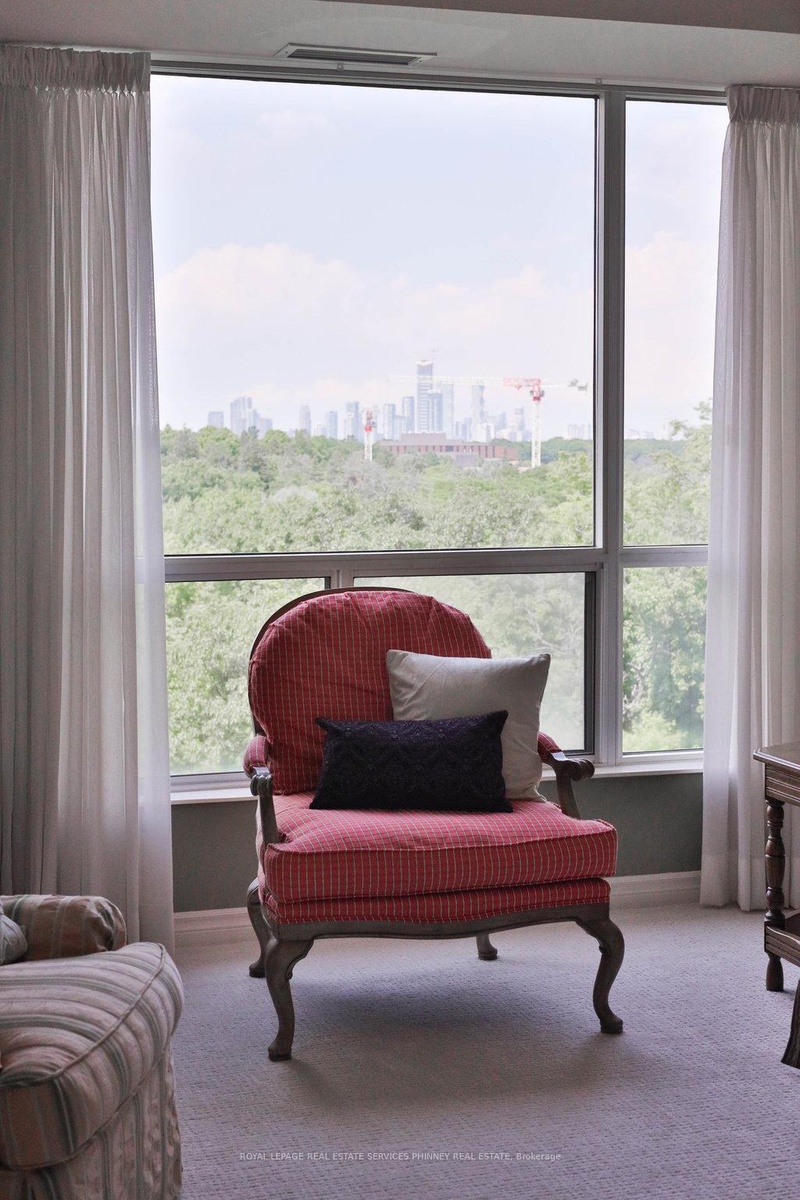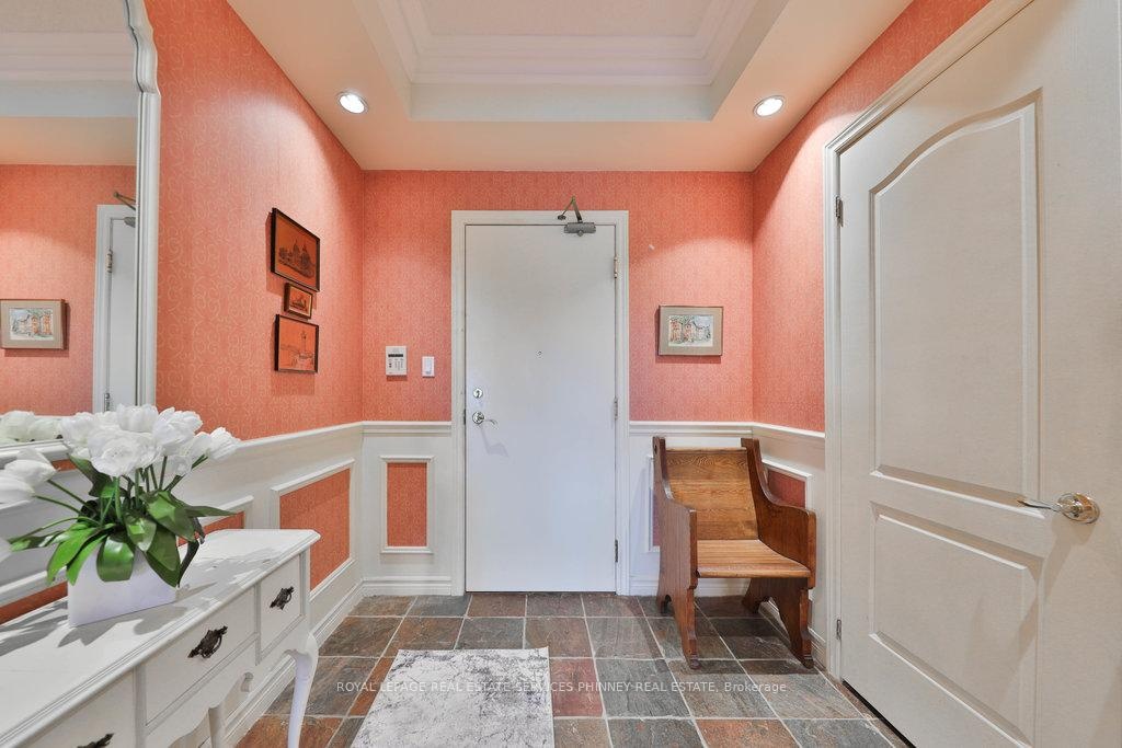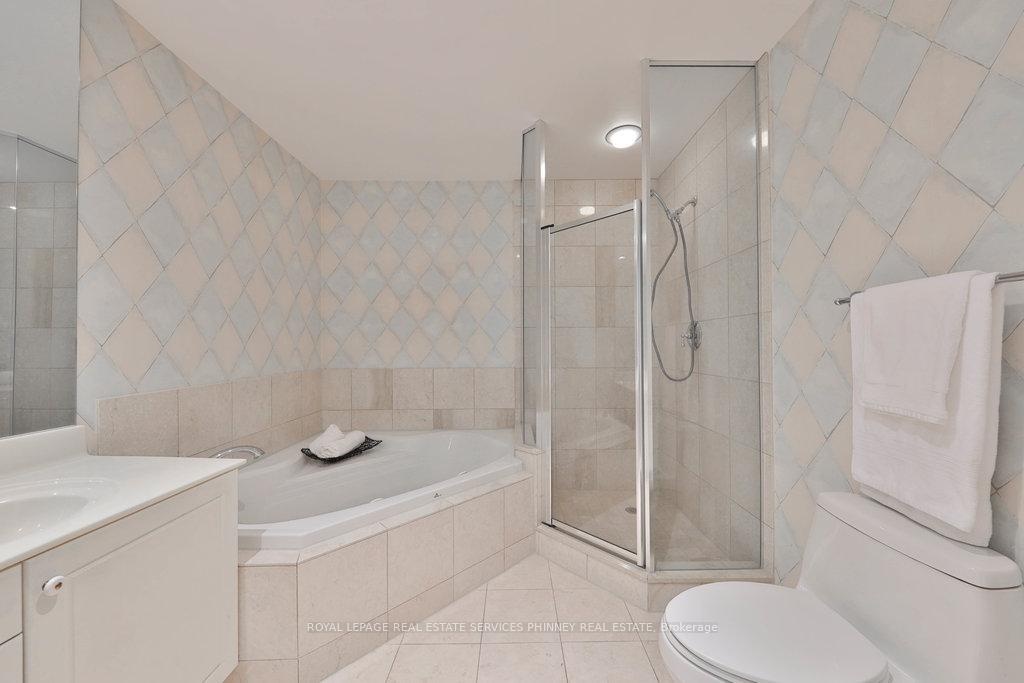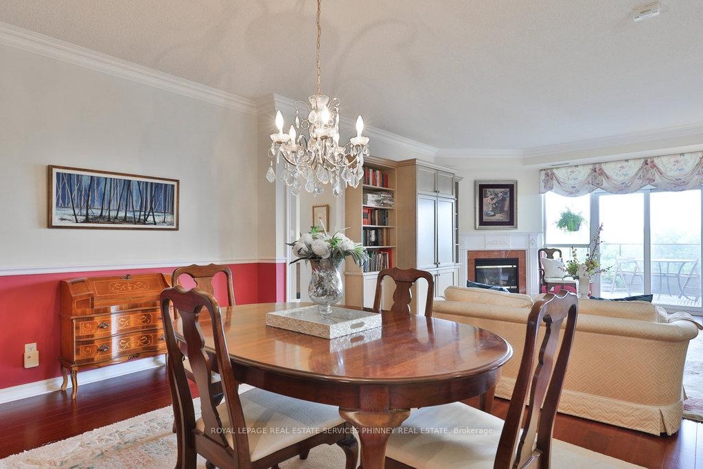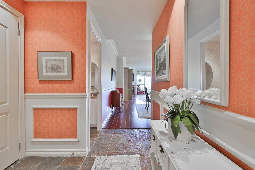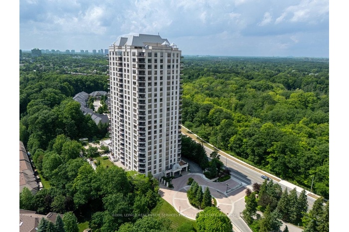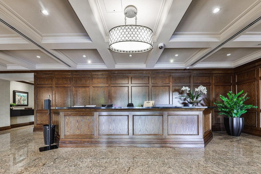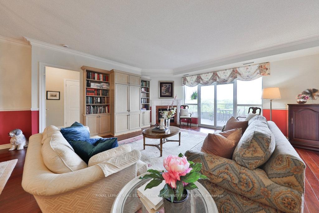 Welcome to The Palace, one of Mississauga's most prestigious and highly sought-after condominium communities. This upscale residence offers a wealth of amenities, including concierge, fitness centre, indoor pool, car wash station, underground visitor parking, and more. This desirable 2-bedroom, 2.5-bath "07" model boasts a tranquil easterly exposure, offering treetop views of the picturesque Sawmill Valley Trail. Spanning 1,732 sqft, the unit features a thoughtfully designed and functional layout. The tasteful open-concept living and dining area is perfect for everyday life, accentuated by stylish wainscoting and complete with a cozy gas fireplace and custom built-in bookshelves. The kitchen provides ample storage and sightline into the main living spaces, making it both practical and inviting. The spacious primary bedroom includes a walk-in closet, a luxurious 5-piece ensuite, and walk-out access to the oversized balcony. The second bedroom, accessed through elegant French doors, also features a walk-in closet, its own 4-piece ensuite, and walk-out to the balcony. Life at The Palace offers sophisticated, resort-style living with all the conveniences of a central location-yet comfortably removed from the city's hustle and bustle. Experience refined living at its finest. One underground parking space close to the elevator and a sizeable storage locker also included. Heat, water and cable tv included. Tenant pays hydro.