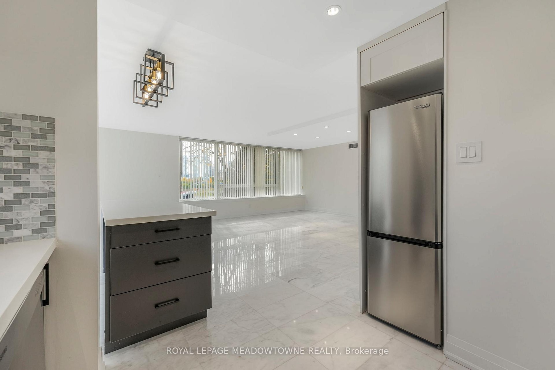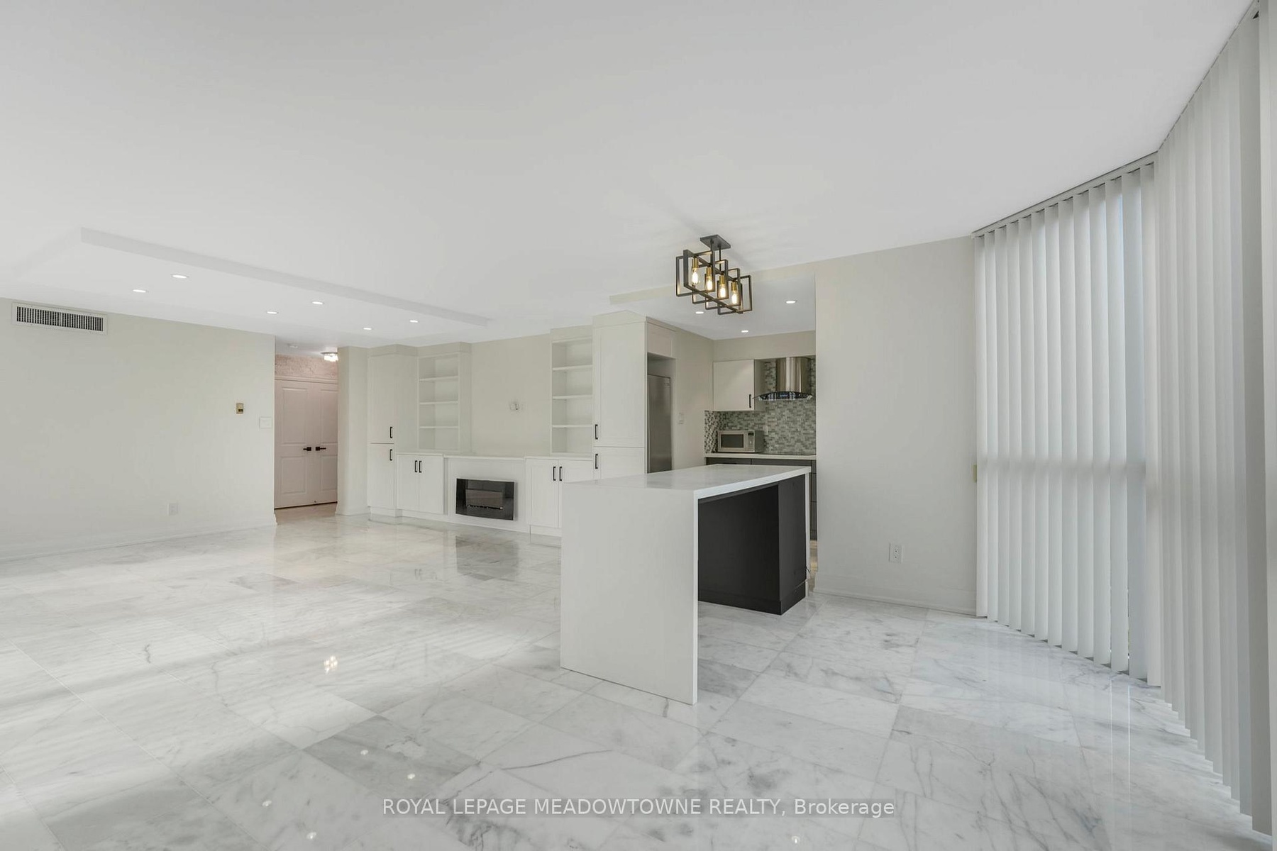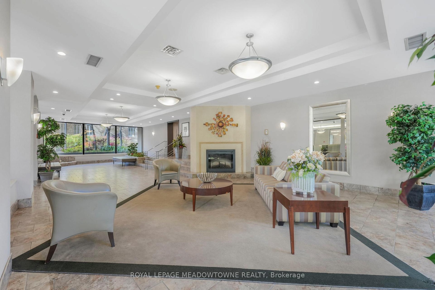 Welcome Home! Your Beautifully Upgraded Condo in the Heart of Mississauga Awaits! Come see this bright and inviting 2-Bedroom, 2-Bathroom CORNER UNIT  condo that truly feels like home. Located in the absolute heart of Mississauga, this unit offers convenience, luxury upgrades, and a wonderfully quiet atmosphere-perfect whether you're starting out or looking to downsize.  Close to major Highways, fantastic Shopping, schools, recreation, and places of worship. Plus, with this convenient second-floor unit, you don't even need the elevator to get in and out! It comes complete with 1 dedicated parking spot. This sun-drenched condo faces south and southeast, ensuring your main living areas are bright all day long and offer a lovely private view. You'll love the quality touches throughout. Gorgeous Marble Floors flow throughout the main living areas and bathrooms, giving the space an elegant, cohesive feel. The grand entranceway features a beautiful stone accent wall and a handy closet. Cozy up in the living room next to the fireplace! It's beautifully integrated with a built-in bookshelf and entertainment unit. Smooth Ceilings and a separate, modern Carrier heating system offer year-round comfort. Kitchen: Fully functional with a stylish backsplash, upgraded sink and faucet, and a full-size dishwasher. The clever moveable island with three drawers gives you flexibility and extra prep space! Primary Bedroom with hardwood floors, two closets (including a walk-in), and an indulgent Ensuite  bathroom. Features a shower/tub combination, Corian counters, marble accents, an upgraded toilet, and a chic floating vanity. Second Bath: Features an upgraded glass shower stall with enhanced pressure control and two dedicated linen closets for excellent storage. With hardwood floors in the second bedroom (which also has great closet space). Insuite laundry for ultimate convenience. Unit is virtually staged.