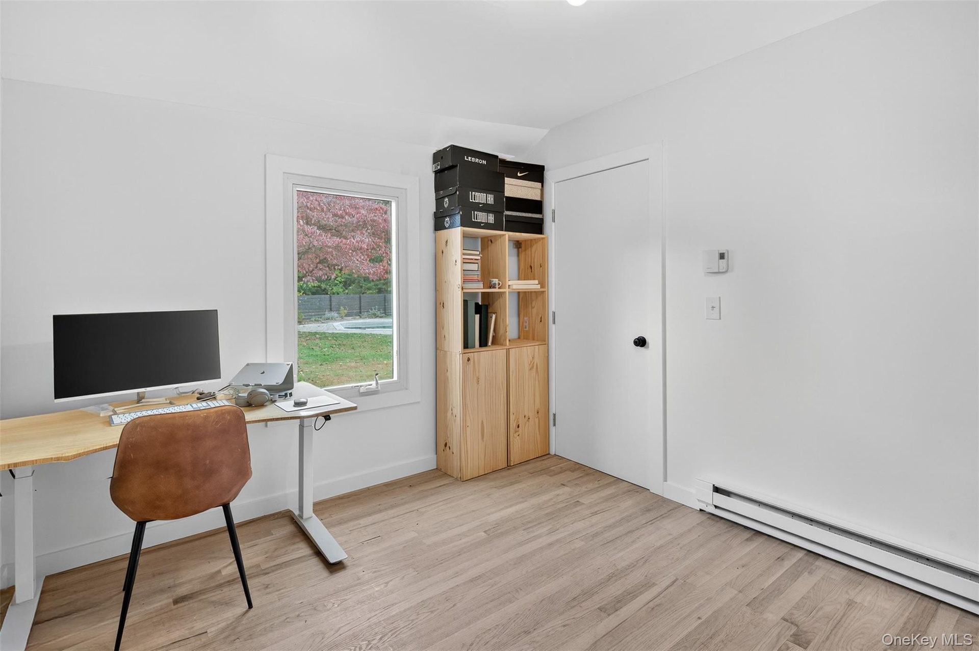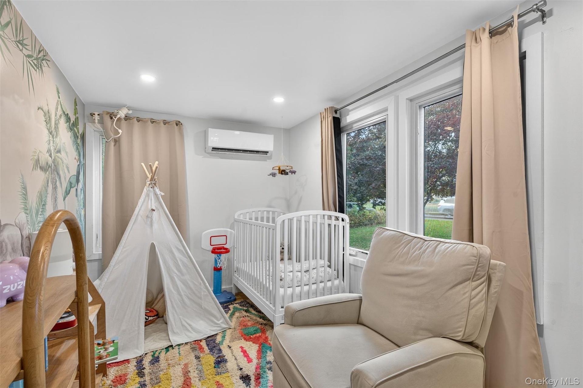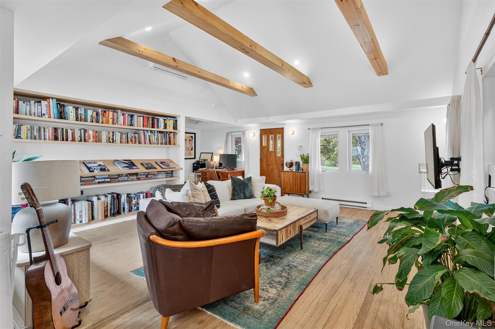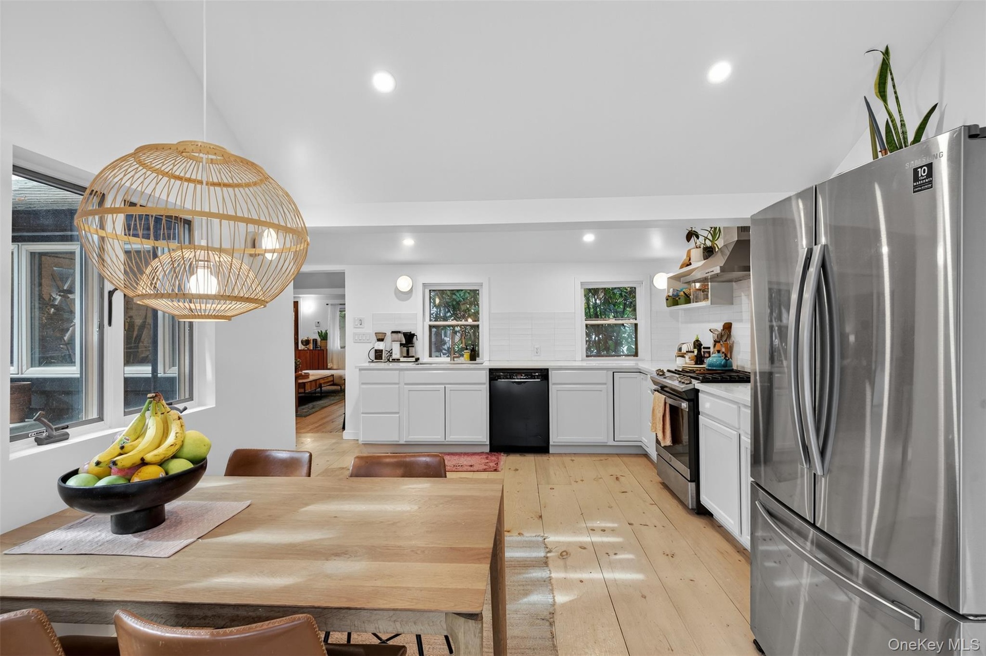 The modern kitchen opens directly onto a spacious back deck through sliding glass doors, extending your living space outdoors. Overlooking an in-ground saltwater pool, this backyard oasis is ideal for entertaining, relaxing, and enjoying long Hudson Valley summers.
