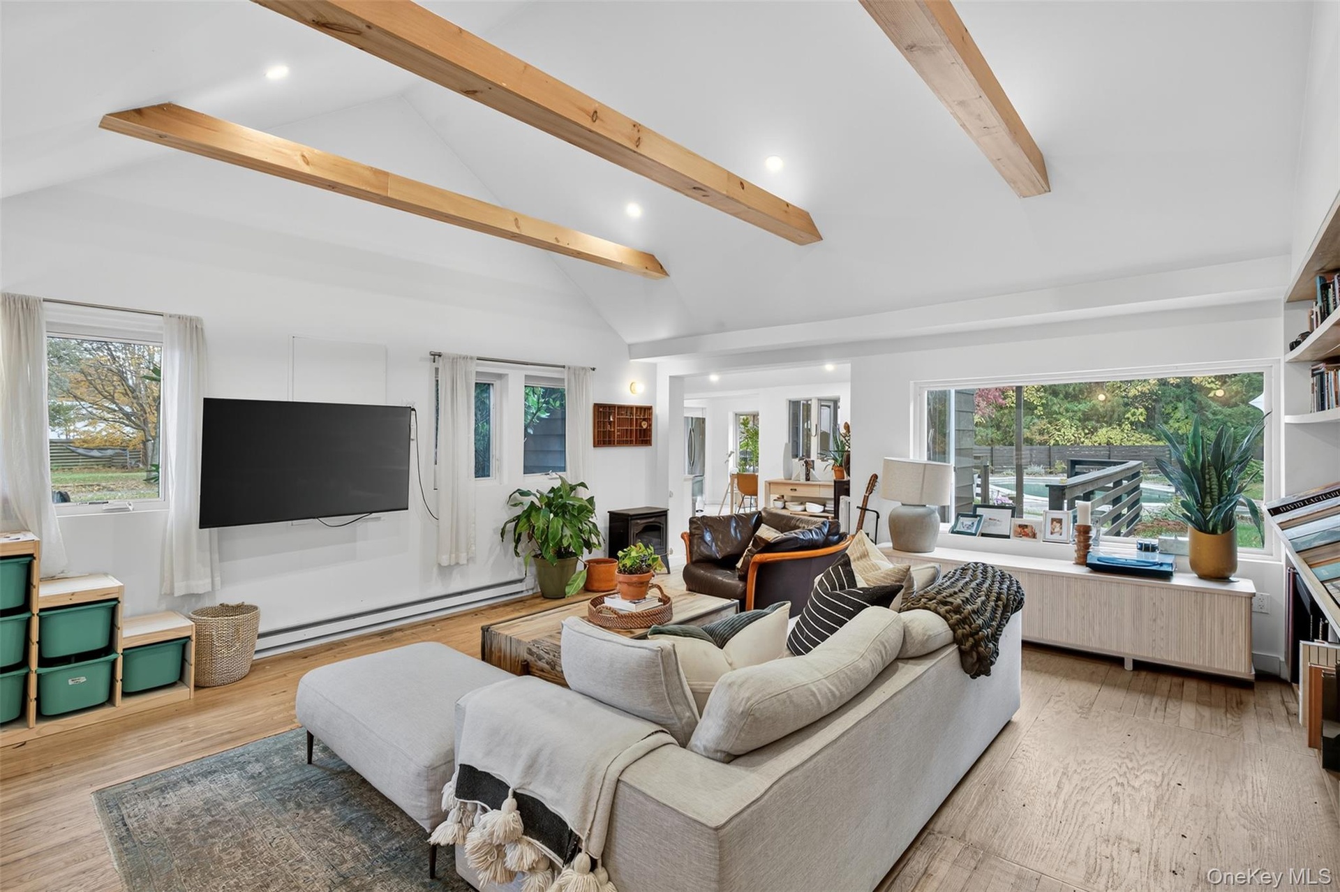 Step into a light-filled open-concept living area with vaulted ceilings, exposed beams, and large picture windows that bring the outdoors in. The seamless flow between the living room, dining area, and kitchen creates a warm, inviting atmosphere perfect for gathering with family and friends.