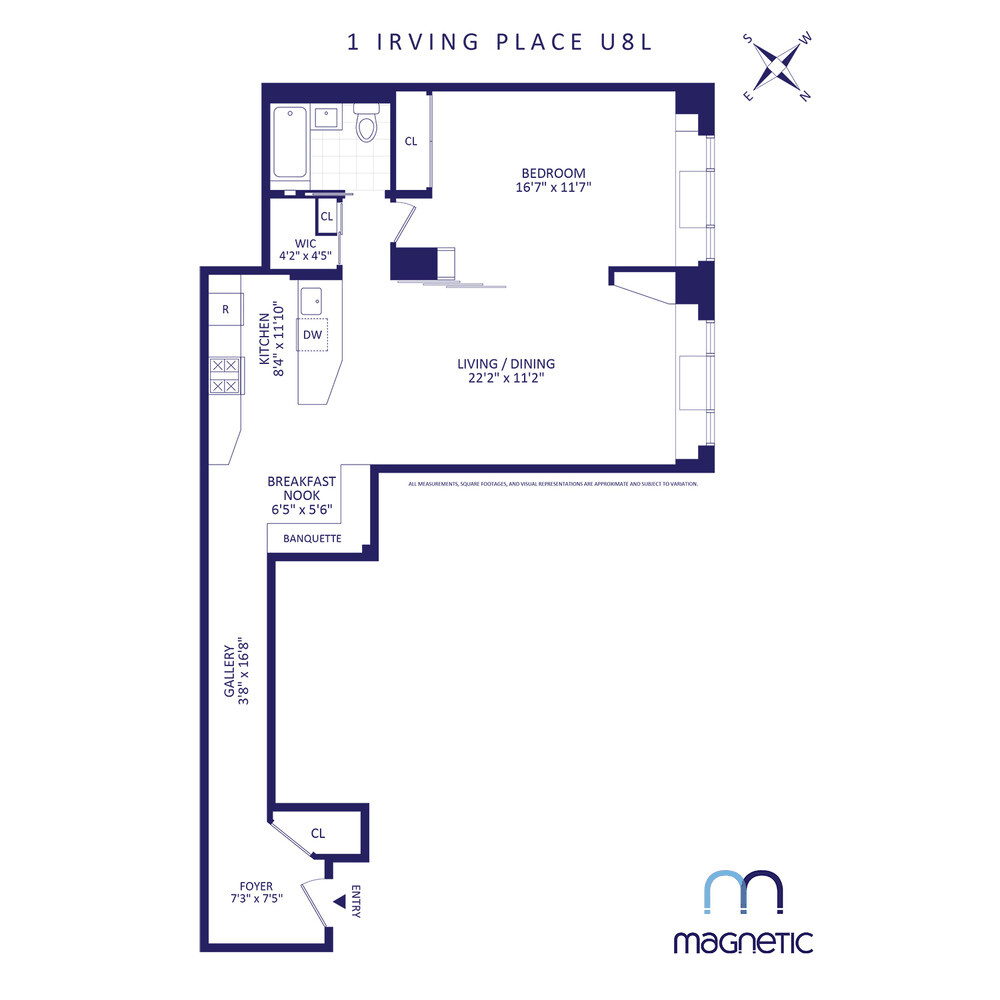 Upon entering this modern apartment, you are greeted with a large entryway and elongated hallway that leads you to the open living space. The large living area features mirrored sliding glass doors separating the living room and bedroom, making the layout feel open and spacious. The open kitchen features high-end appliances, granite countertops, and ample cabinet space. Right off of the kitchen lies a cozy breakfast nook with a built in banquette. The oversized bedroom easily accommodates a king-sized bed plus additional furniture with an abundance of closet space. The bathroom contains a soothing spa-like tub and a glass pedestal sink with quality fixtures. The apartment has climate controlled air conditioning dimmable track lighting, and built-in Sonos speakers throughout.