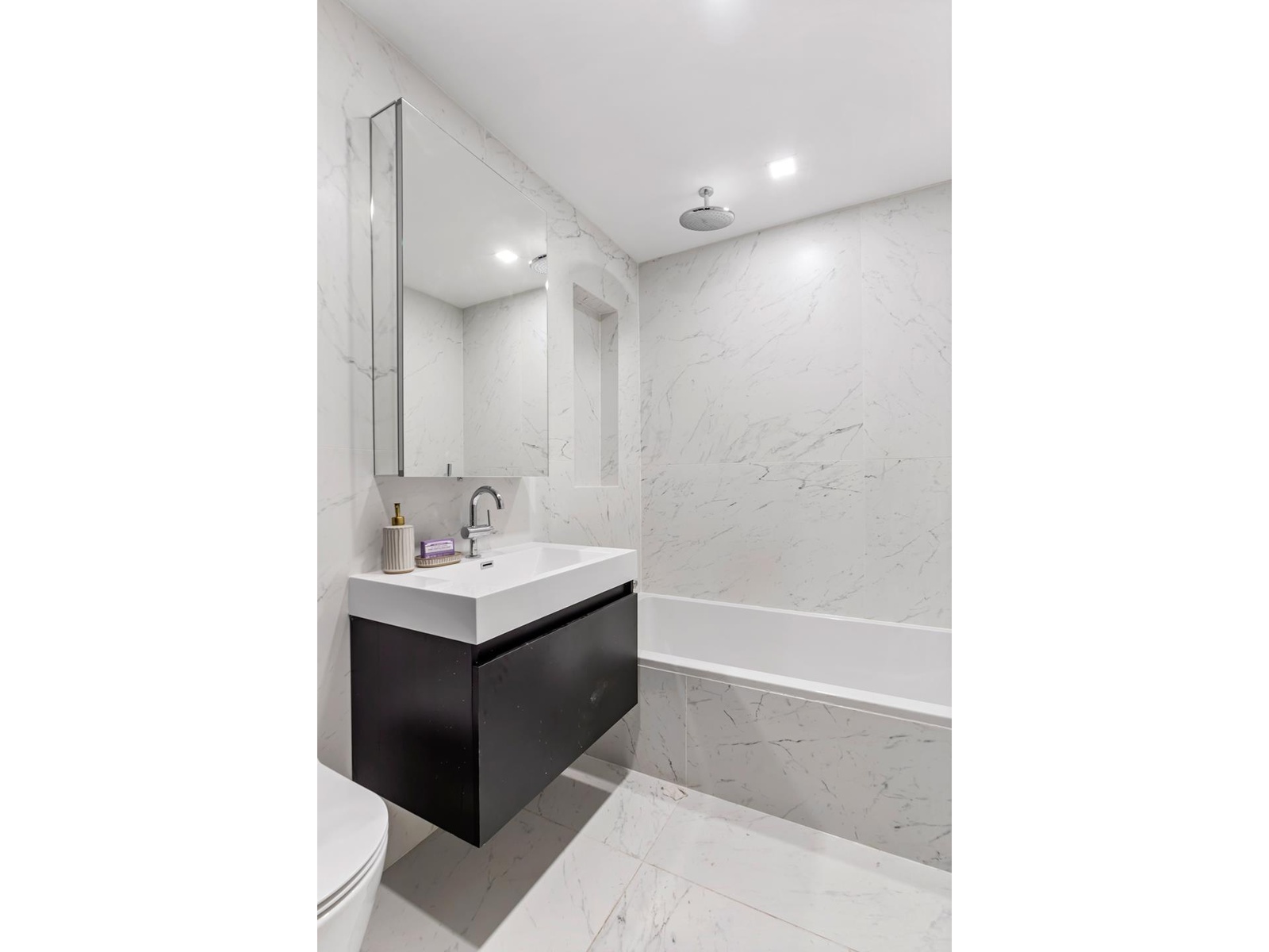 The bathrooms are equally spacious and stylish and feature Toscana Blanco Spanish porcelain tiles for a spa-like oasis feel. The design also includes Grohe fixtures and a tub/toilet duo by Fine Fixtures. Large vanities provide ample storage.