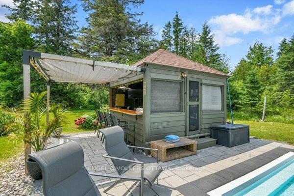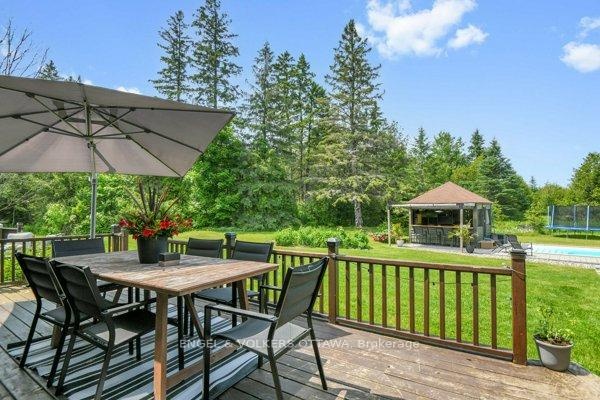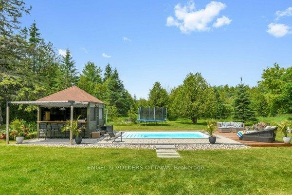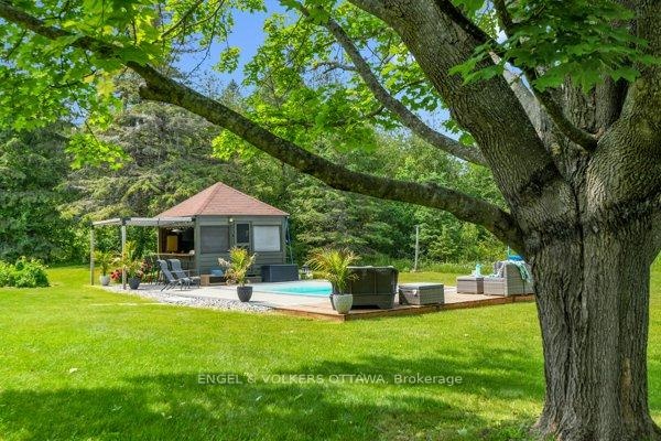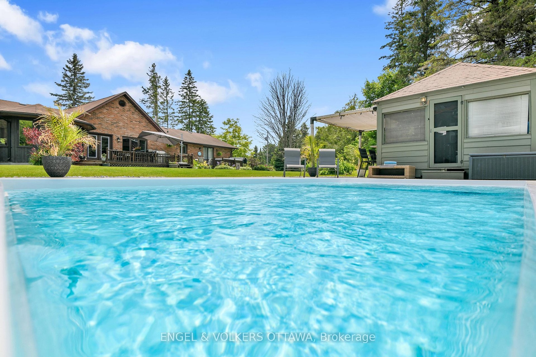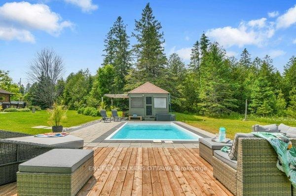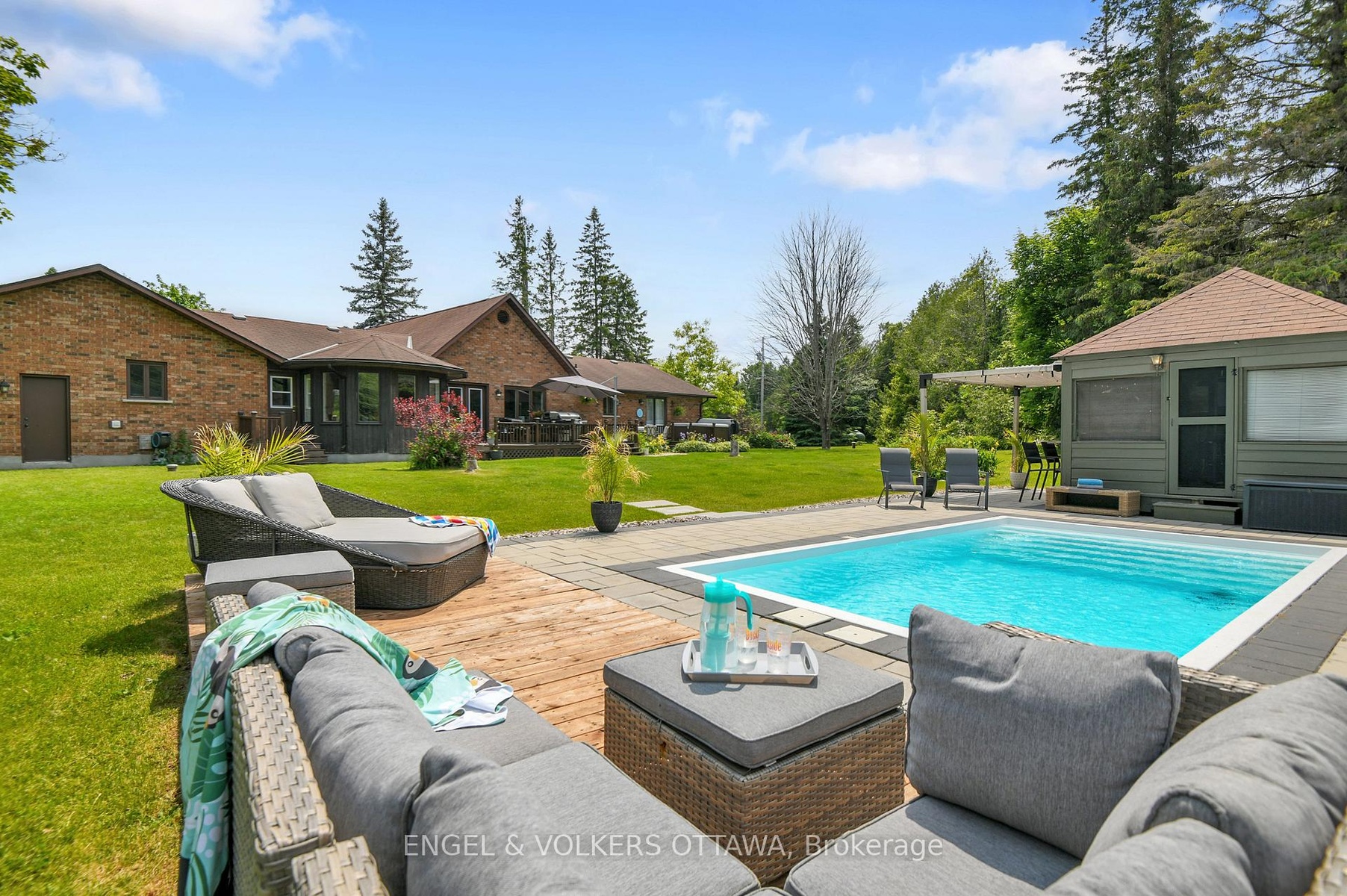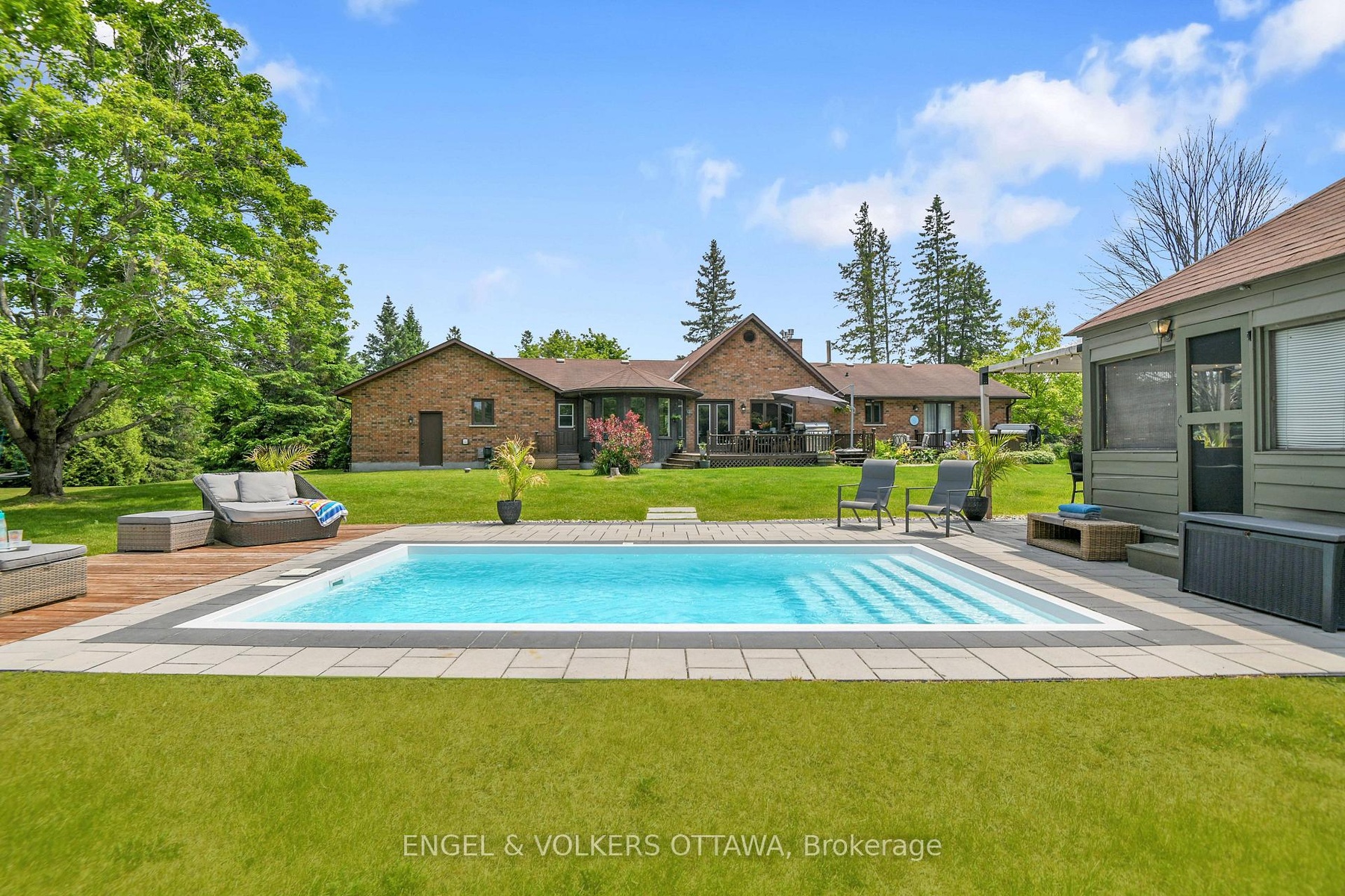 A handsome all brick bungalow on a prime lot with brilliant sun exposure and almost 500 feet of frontage awaits. Less than 10 minutes away from the charming community of Almonte which is steeped in history and interesting locale fare, restaurants , golf and a local hospital. The vaulted beamed main family room is anchored with a high end gas fireplace and overlooks the gardens and pool area beyond. The living room/den served as a 4th bedroom or home office in the past and is flooded with sunlight throughout the day. Gleaming hardwood floors throughout the interior create a sense of warmth and the scale of every room is generous and unique for the time the home was built. Bay windows in the breakfast area over looking the pool and patio doors onto a private deck off the Primary Suite are thoughtful luxuries in the original design. A main level laundry off the kitchen is well positioned. Baths have been updated. The lower level boasts an expansive home base for watching sports or movies and warmed by a handsome high end gas fireplace. A built in bar, games area and additional space for a bedroom or office is well laid out and the unfinished space offers storage and workshop potential. The home is equipped with a newer well, pressure tank, - all updated in 2021. Septic was pumped June 2025; inspection in spring 2025 indicates several more years of life with proper maintenance. Roof and mechanicals updated in 2018, interlock landscaping in 2017, granite counters and backsplash in 2020, ensuite and hardwood floors in 2019. Interior repainted in 2025. Upgraded main bath in Spring 2025, and new Windows mid Nov 2025.