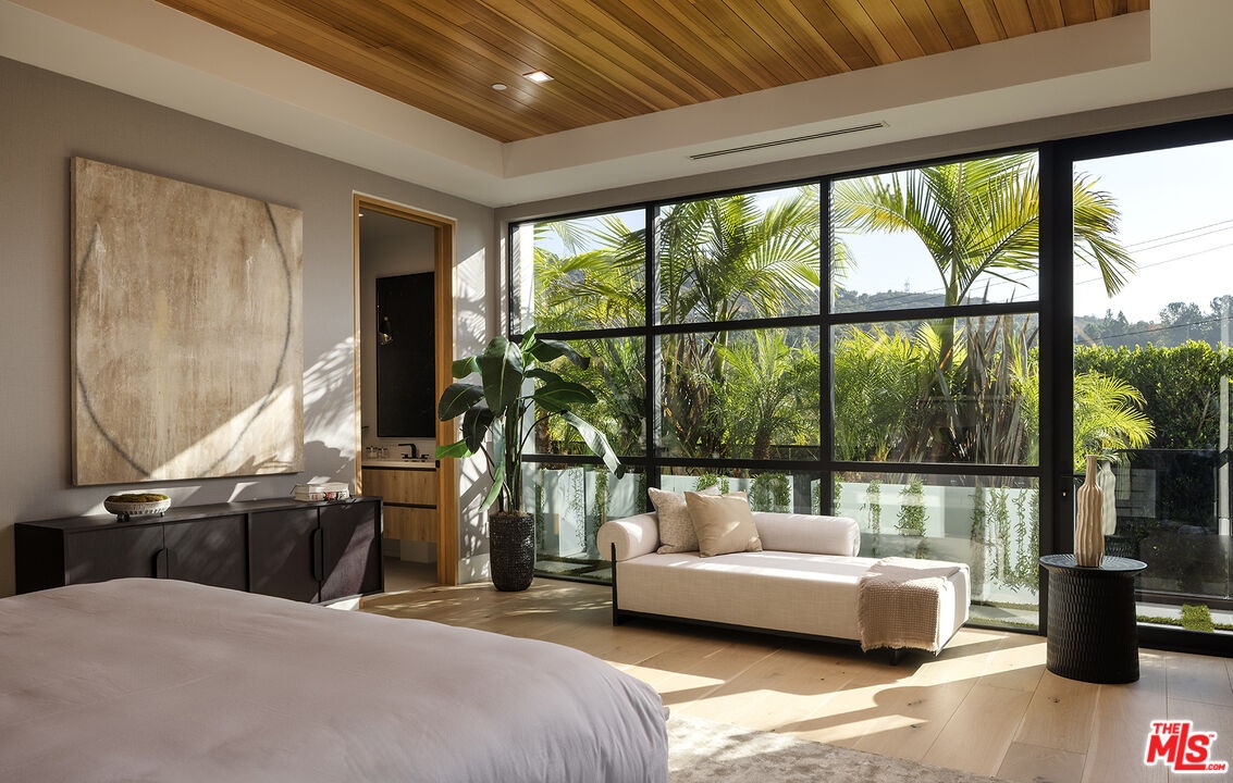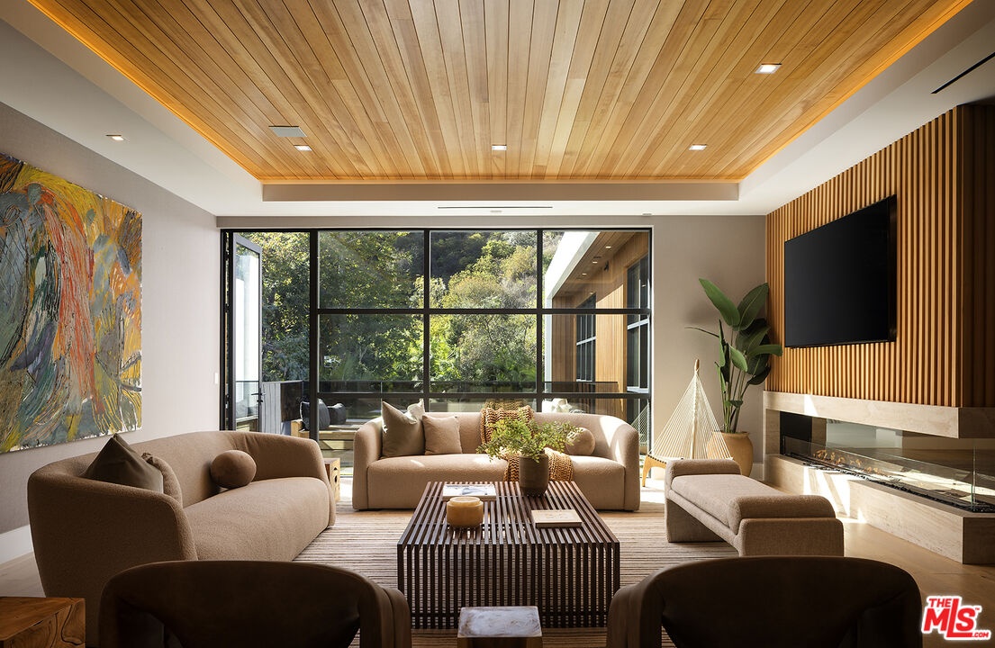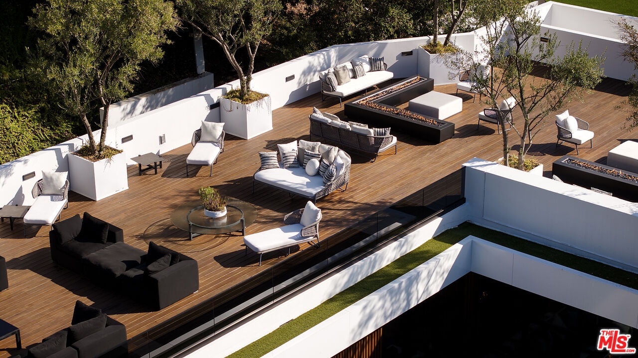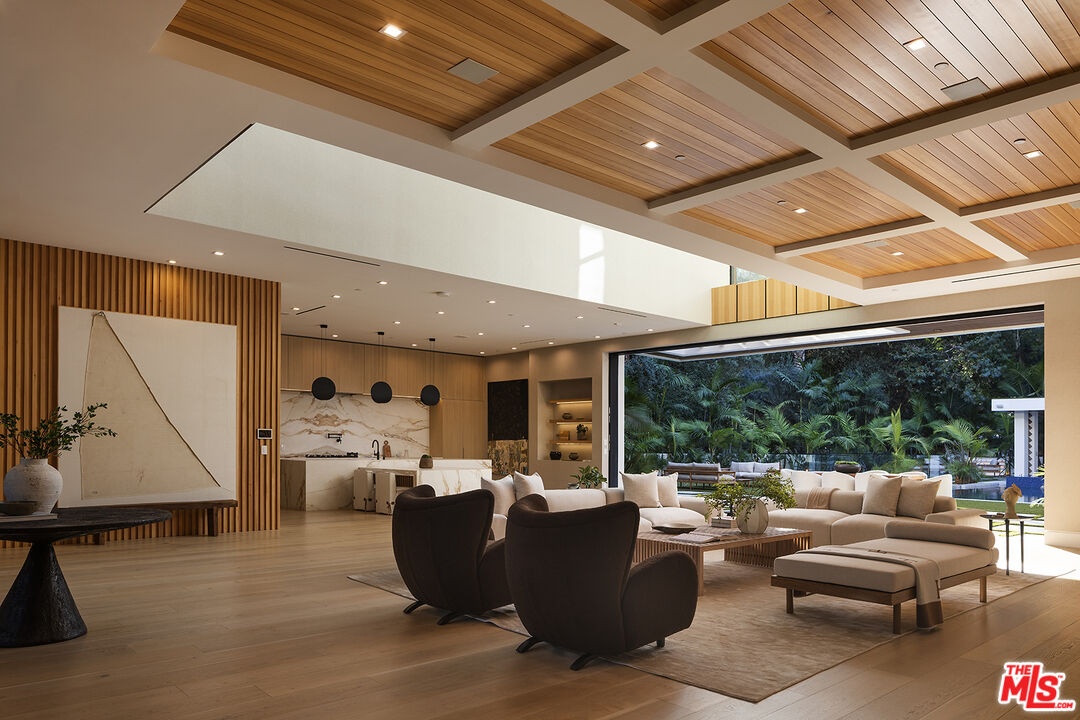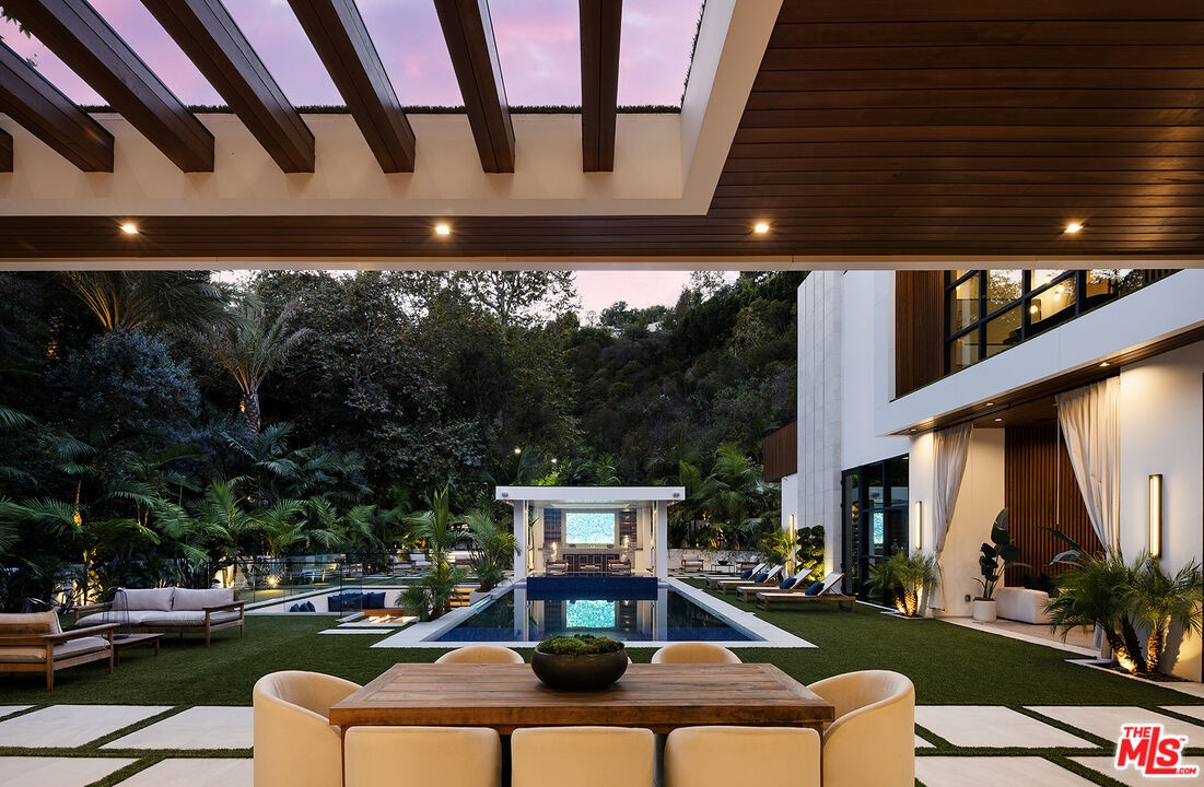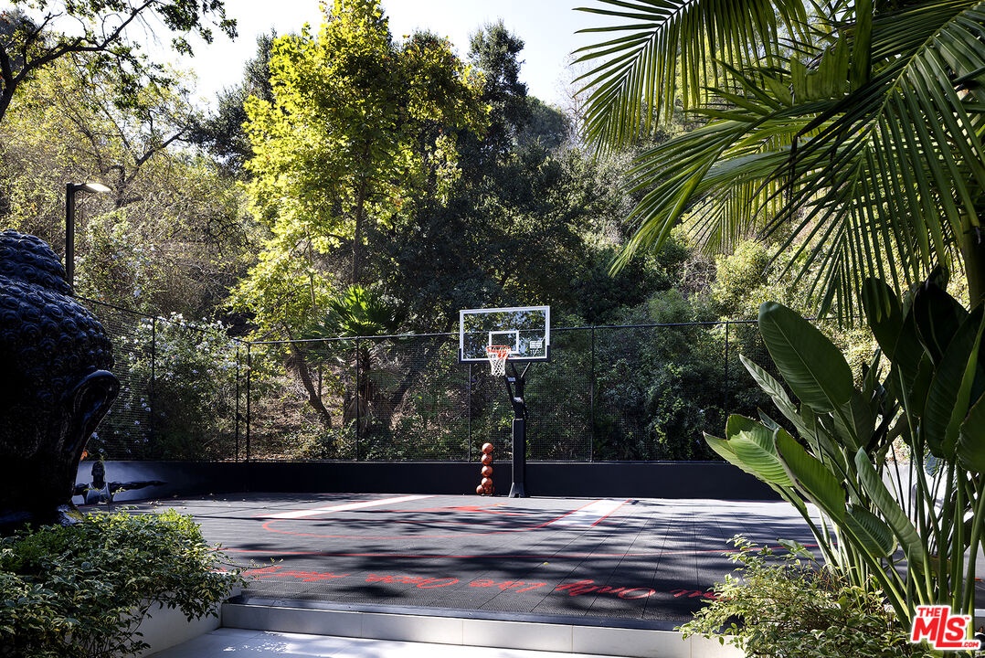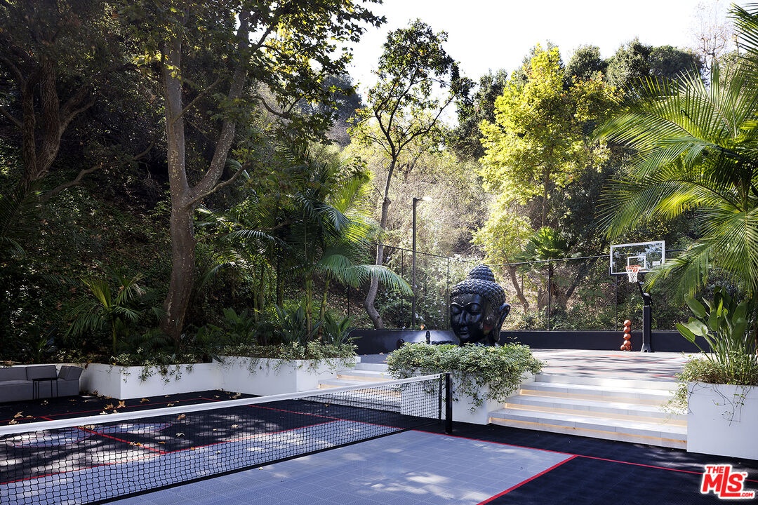 Indulge in an effortless resort-quality lifestyle from this extremely private entertainer's compound surrounded by natural greenery with sumptuous canyon views, showcasing a variety of premier amenities on 1.3 acres of mostly flat usable land. An absolute dream for recreational enthusiasts, growing families, and sports professionals alike, this exquisite haven includes a dedicated pickleball court, a professional-size basketball/sports court, and putting green, all enveloped by a flourishing leafy paradise. An expansive gated motor court provides parking for ten cars, and a striking entry calms the senses with soft organic tones complementing the lush hillside beyond. A gourmet chef's kitchen is outfitted with bookmatched stone slabs, triple waterfall island, and Miele appliances as well as a commercial-grade walk-in refrigerator in the caterer's prep galley. Both bar and wine room are showpiece standouts, and the theatre is expertly configured to match a true cinema experience. Upstairs, the primary wing alone spans 3,000 square feet and offers a lounge, two-sided fireplace, and a marvelous spa-worthy imported European stone-clad bathroom plus dual closet changing rooms, one of which features a walk-out balcony with fire pit overlooking the grounds below. Other amenities include an office, gym, sauna, and mud room. Enjoy a casual, fun-filled lifestyle at this private, family-friendly luxury resort that features a cabana with outdoor kitchen and rainfall curtain, relaxation loggia, a 16-person sunken fire pit with glass view to pool, numerous sitting areas, organic gardens, and 3,000-square-foot rooftop deck optimized for entertaining under California skies. Secluded in a park-like setting with no immediate neighbors, this ideal estate promises joyful existence and enduring, uninterrupted leisure from one of the most highly sought-after locales in the world. Welcome to the peak of contemporary luxury.