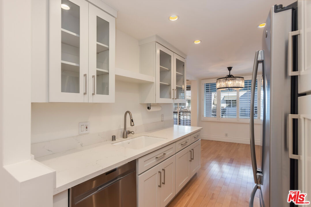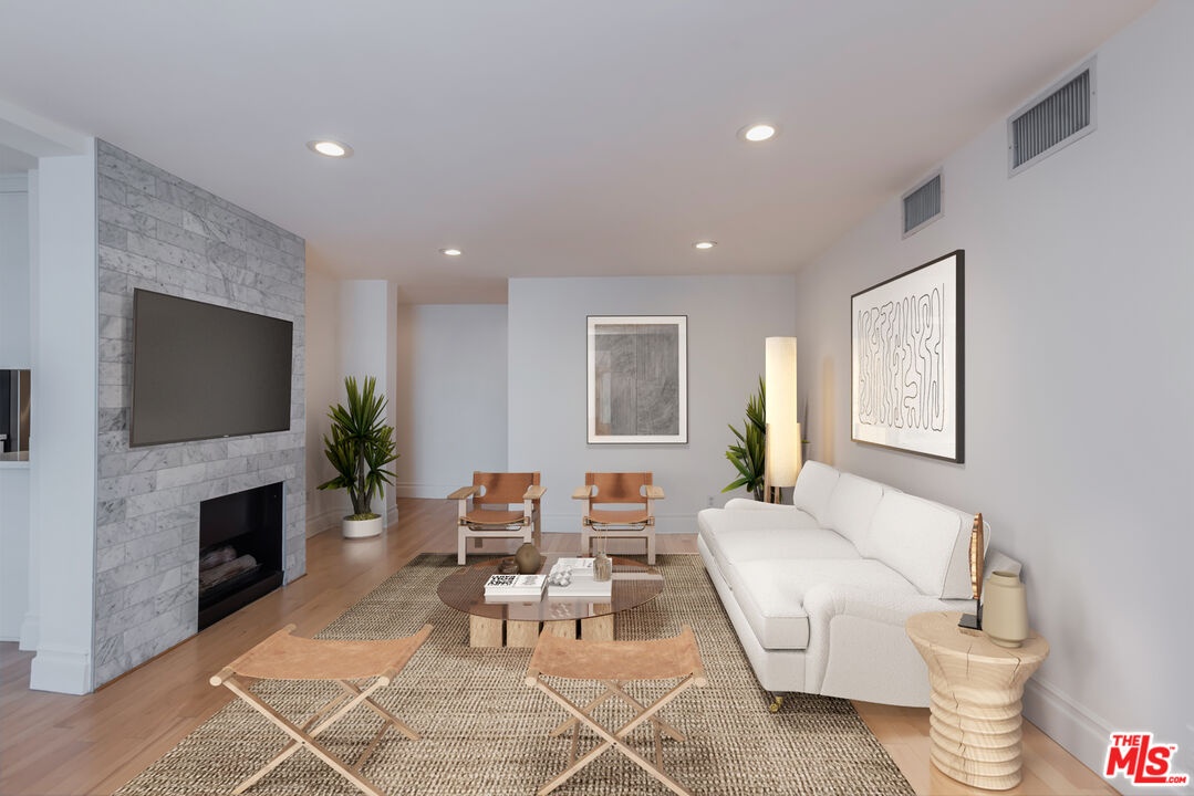 Quiet, private, and ideally situated just off the sparkling pool, this remodeled 2 bed, 2 bath condo offers effortless living in the heart of West Hollywood. Tucked in a prime interior location within the building, the unit features a remodeled kitchen with stainless steel appliances, 9' ceilings, wood floors, recessed lighting, and a decorative fireplace that adds character to the living space. The spacious primary bedroom includes a remodeled ensuite bath, custom closet, and a large window showcasing the verdant greenery outside. The second bedroom is also generously sized with direct access to the patio and pool area and is complemented by a nearby second fully remodeled bath. The private patio provides easy access to the pool, sunbathing area, parking, and nearby exits, a rare convenience in a larger complex. While in-unit laundry is possible, the location directly next to the building's laundry room offers seamless access without sacrificing interior space. Additional features include double-pane windows, plantation shutters, one assigned parking space in the upper level gated garage (with the option to rent an additional) guest parking, and HOA fees that include: earthquake insurance, water, trash, and sewer. Set just moments from West Hollywood's vibrant scene, including the new Erewhon, Trader Joe's, world-class dining, shopping, fitness, and nightlife, all while enjoying the peace and privacy of this quiet interior unit.