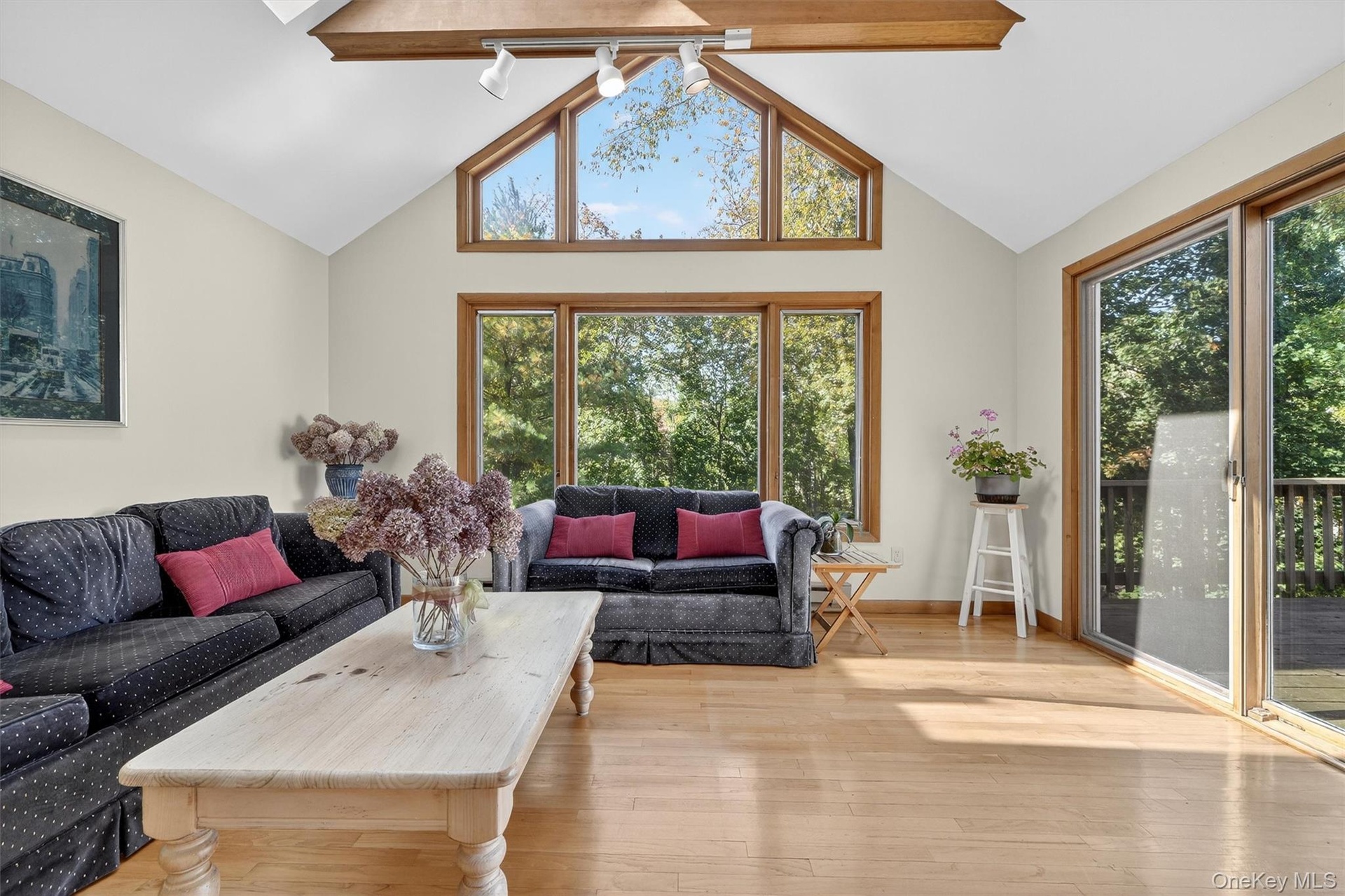 A large eat-in kitchen opens seamlessly to the dining area and the family room, which features a vaulted ceiling with wood beams, a skylight, and a wall of windows making the area sun-drenched, inviting, and warm. Hardwood floors flow throughout, creating a timeless and cohesive feel.