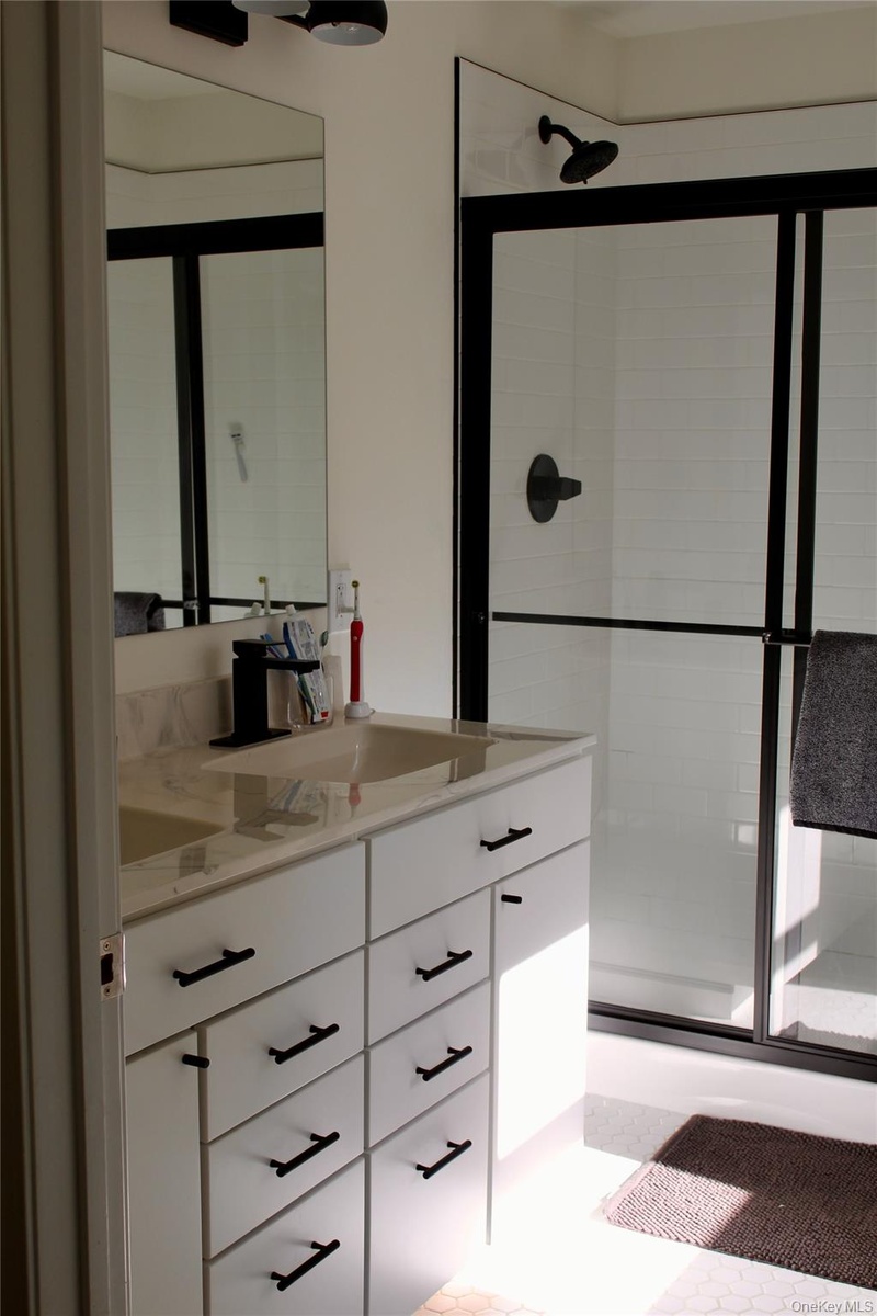 The primary suite includes a walk-in closet and spa-inspired ensuite bath with modern fixtures and a glass-enclosed shower. Two additional bedrooms provide flexibility for guests, a home office, or studio. Both bathrooms are beautifully finished with contemporary tile and sleek design.