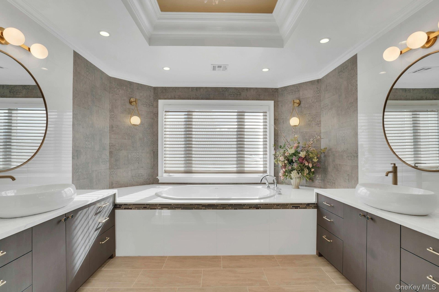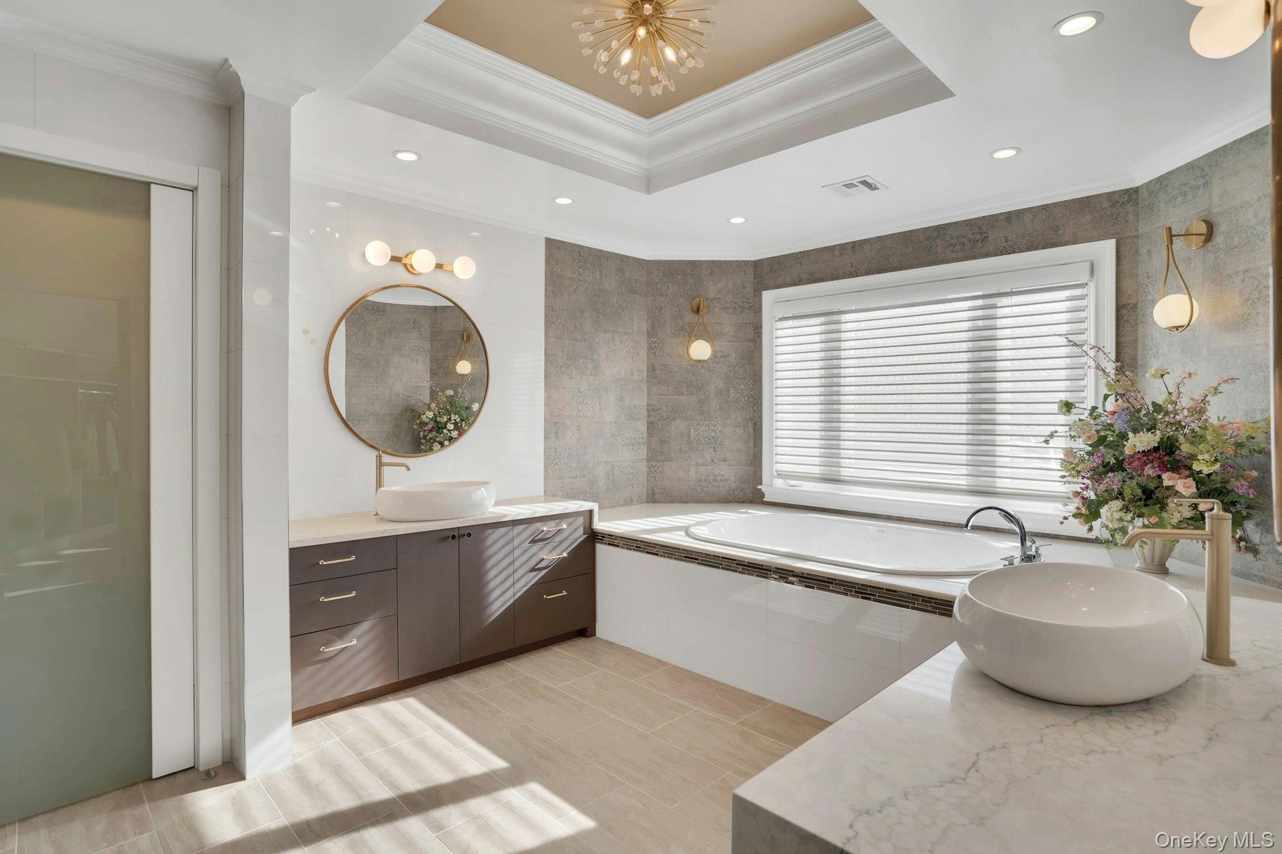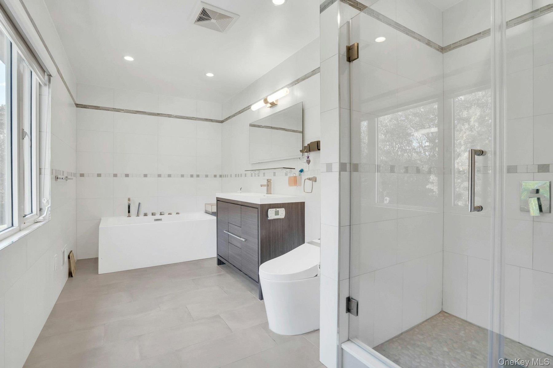 Upstairs, the primary suite offers a spa-like retreat with a designer bath, jacuzzi, double vanities, and custom walk-in dressing room with skylights. Three additional bedrooms each include ensuite bathrooms. The finished basement features a custom wet bar, sauna, home theater, and abundant storage space.
