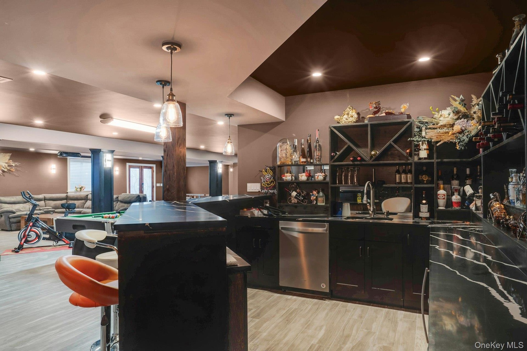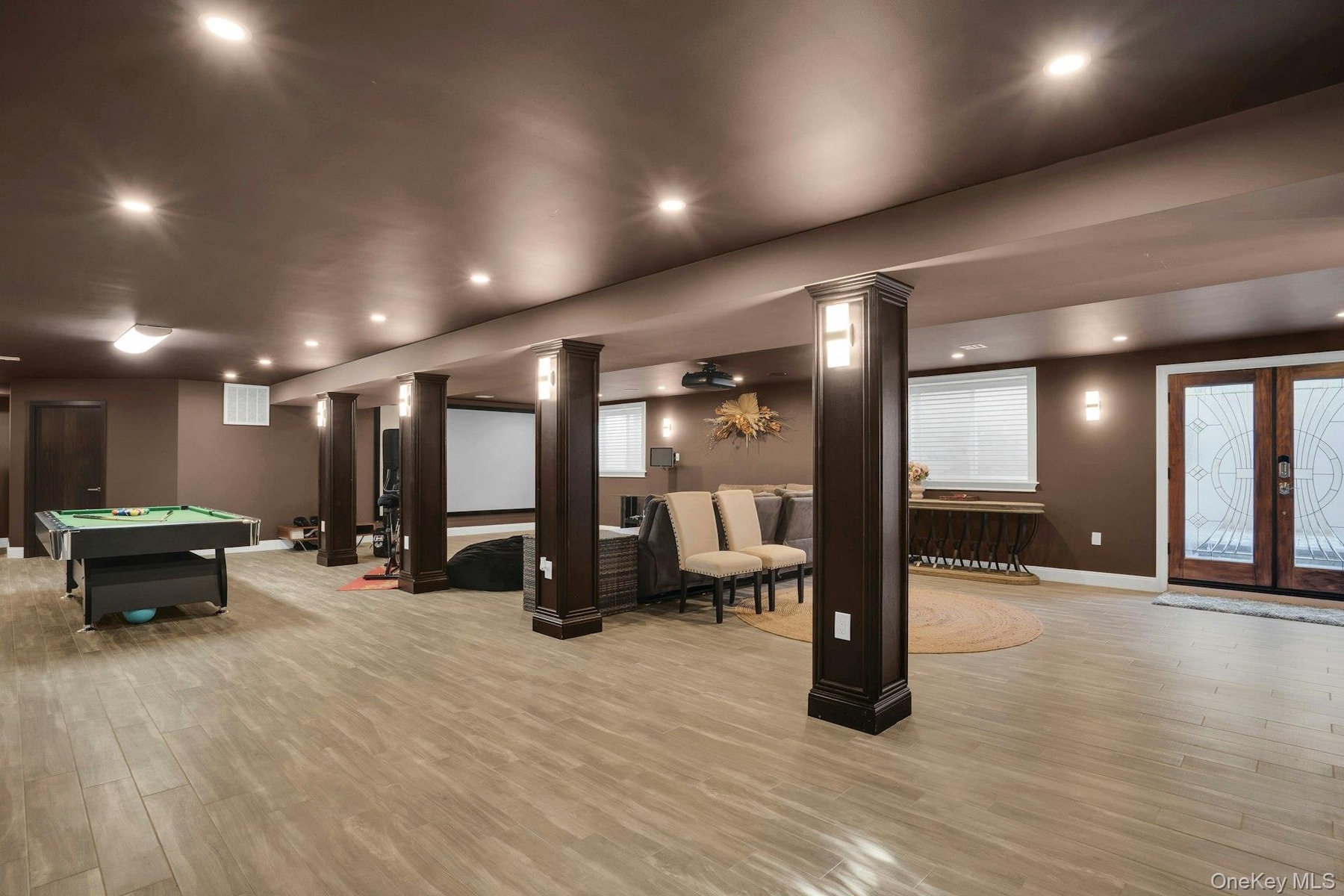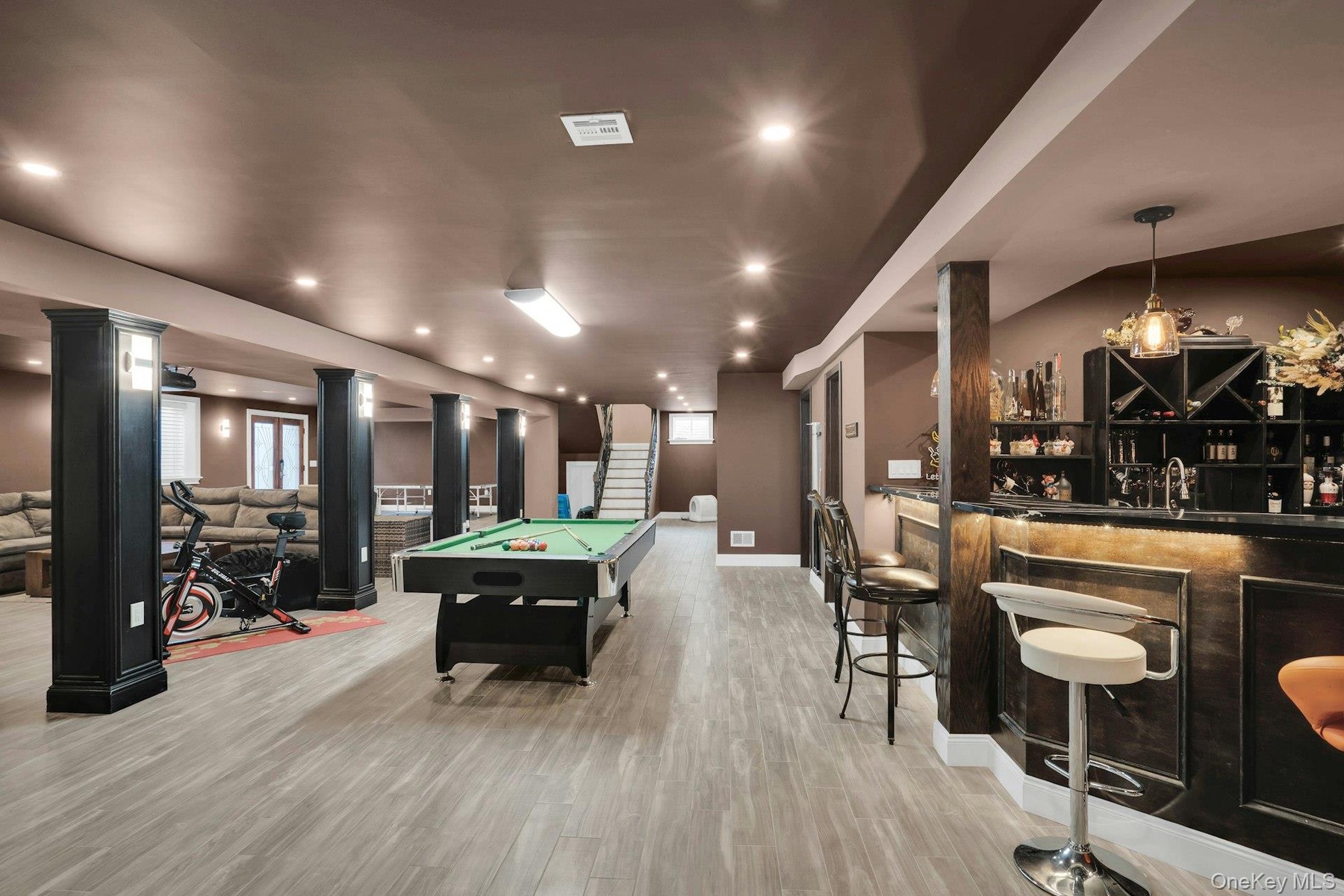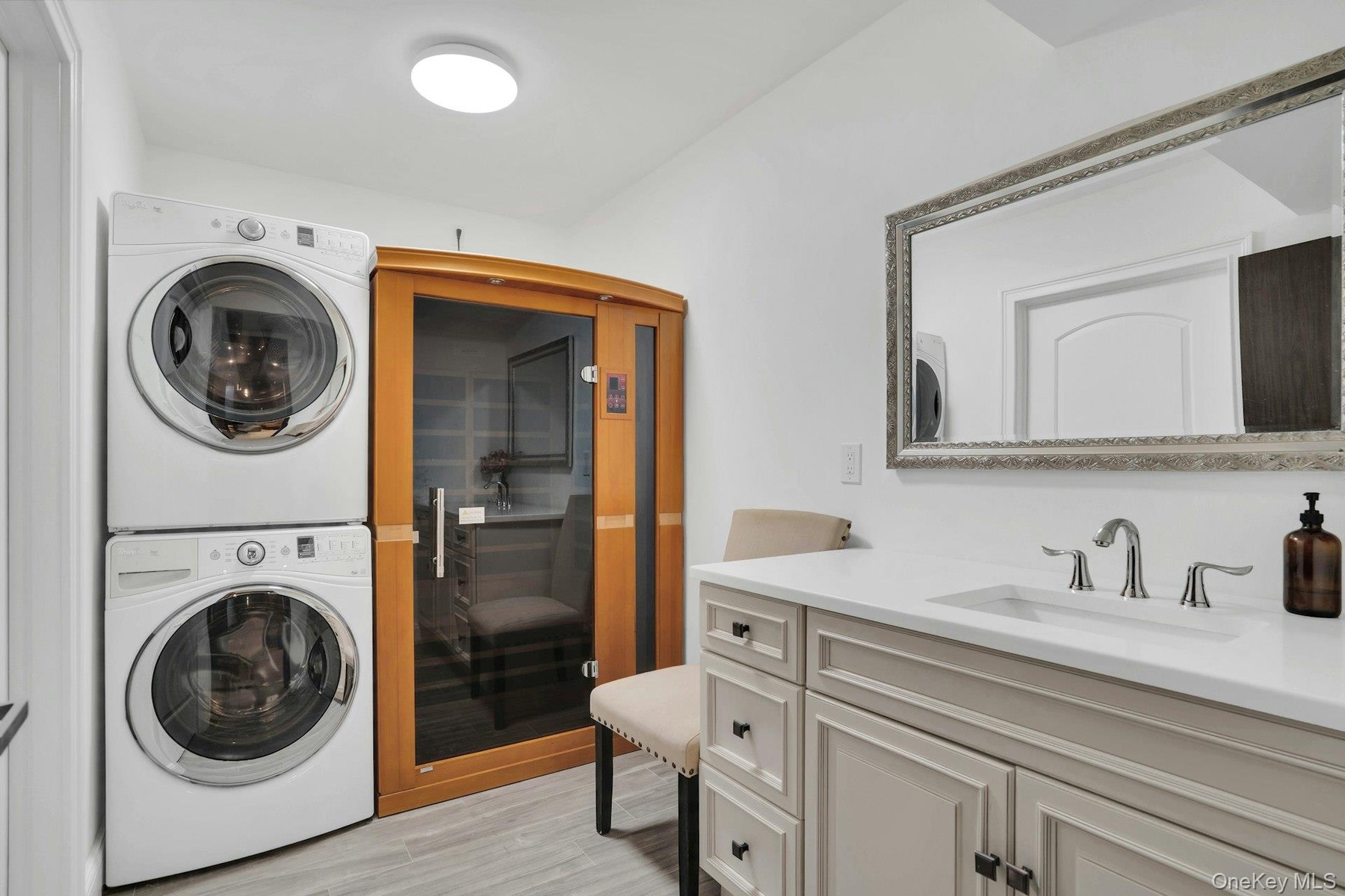 Upstairs, the primary suite offers a spa-like retreat with a designer bath, jacuzzi, double vanities, and custom walk-in dressing room with skylights. Three additional bedrooms each include ensuite bathrooms. The finished basement features a custom wet bar, sauna, home theater, and abundant storage space.