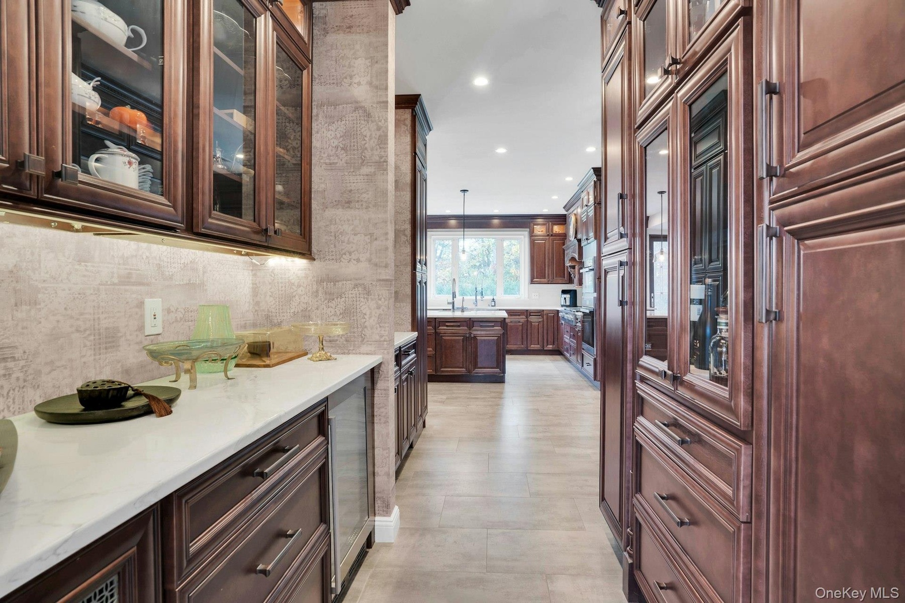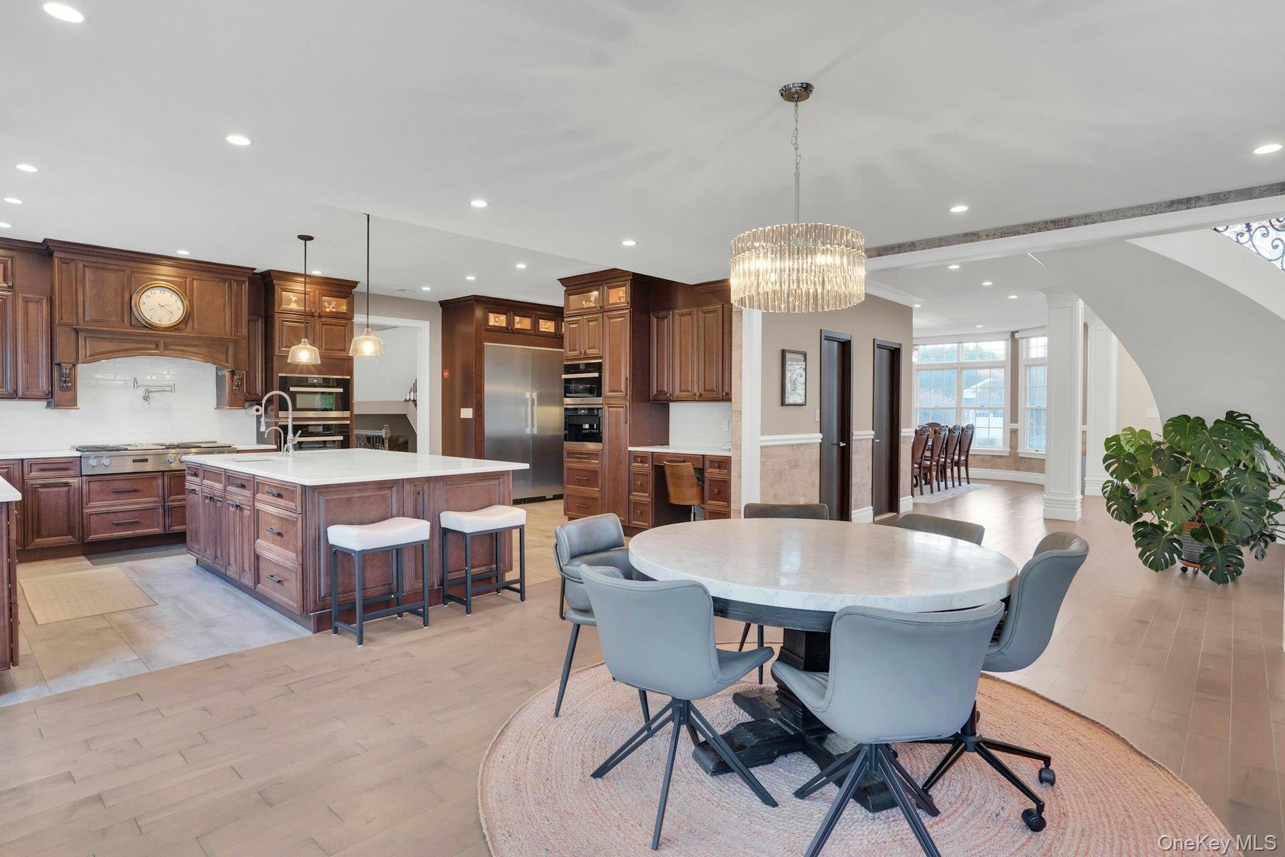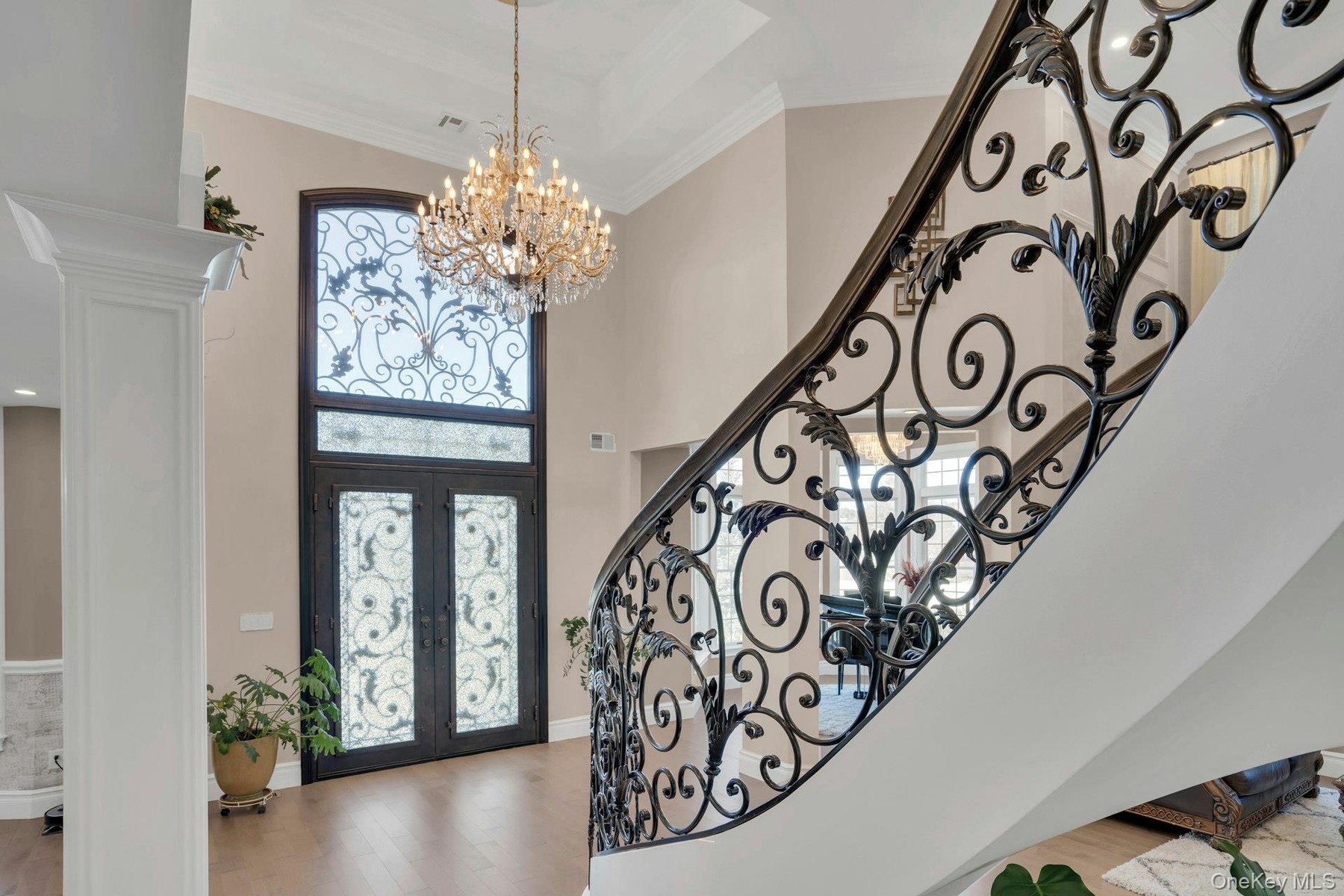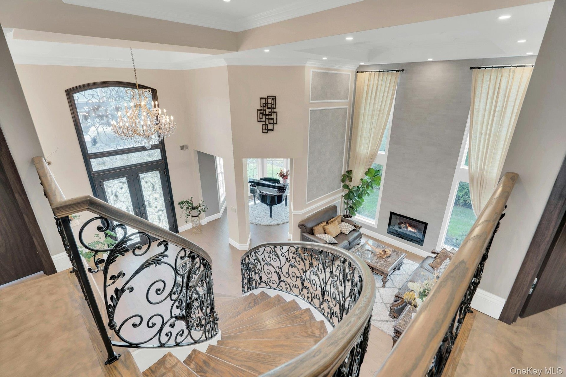 Renovated and updated in 2018. Step into a grand two-story foyer with a sweeping wrought-iron staircase and soaring ceilings. The main level offers a formal living room with a gas fireplace, formal dining room, piano room, and a spacious family room ideal for gatherings. The chef’s kitchen features custom cabinetry, quartz countertops, and top-of-the-line Miele appliances, including a built-in coffee maker, double steam ovens, and pot filler, all centered around a large island perfect for entertaining. A first-floor bedroom/office and 1.5 baths complete the main level.