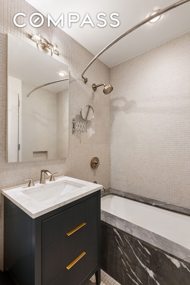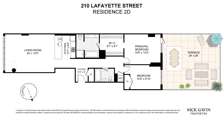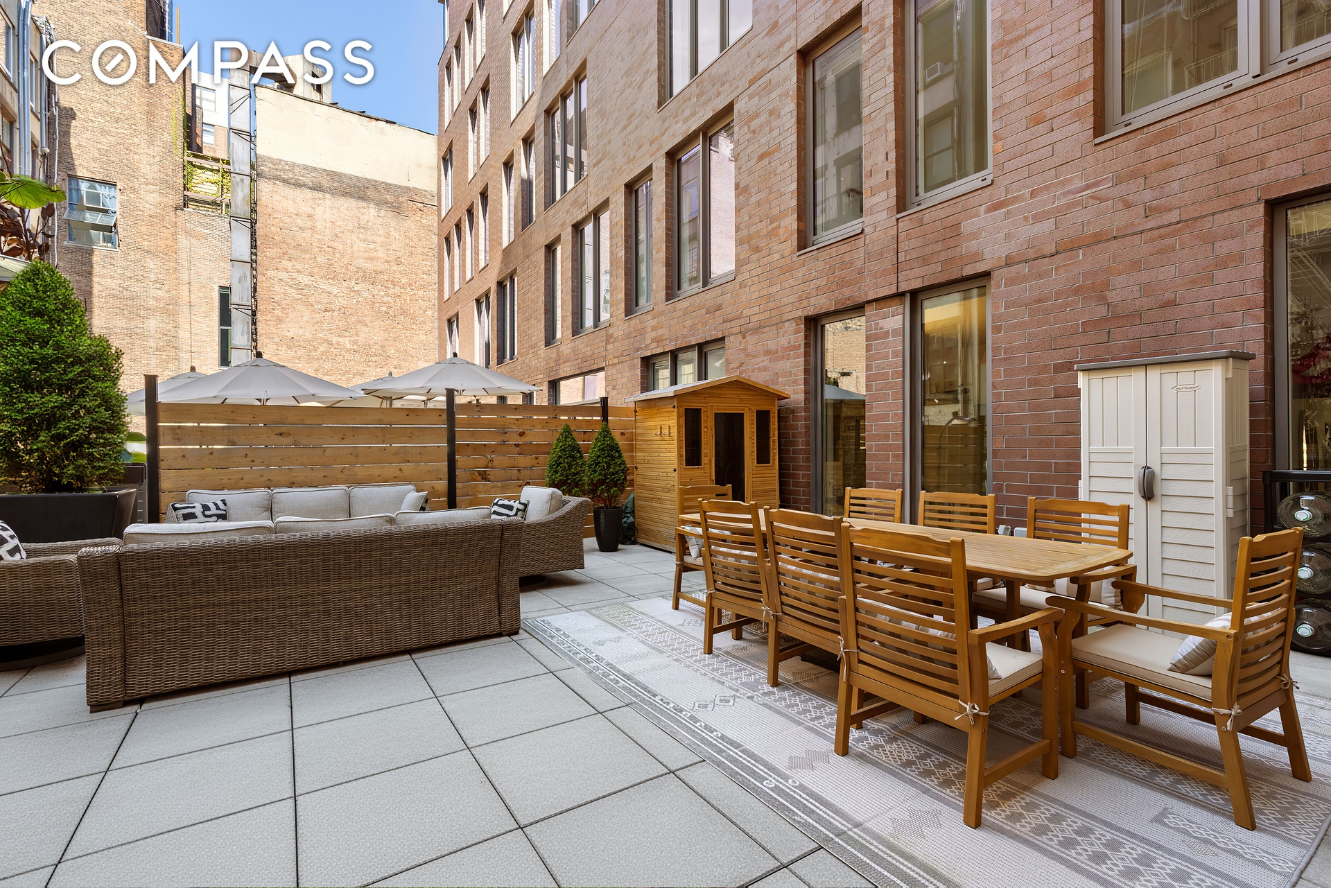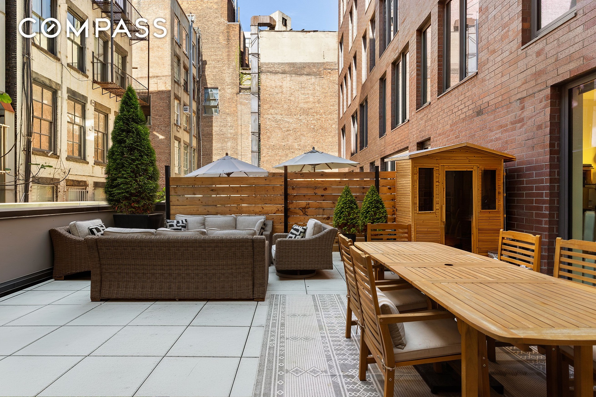 The open living and dining area anchors the home, offering a dedicated bar and generous proportions for entertaining or quiet evenings. The open concept kitchen is both refined and functional, centered on a Carrera marble peninsula and outfitted with sleek gray cabinetry and a full suite of Miele and Sub-Zero appliances. The primary suite, with direct access to the terrace, is designed as a private retreat. An expansive dressing area and en-suite bath complete the space, clad in Blue de Savoie marble and appointed with a soaking tub, walk-in shower, and double vanity. The secondary bedroom, which is equally bright, versatile, and also overlooking the terrace, is served by a second full bath with a soaking tub. Additional features of the home include solid ash hardwood floors, zoned climate control, and in unit washer/dryer. The terrace is the defining element of this home: a brick- and steel-framed expanse with electricity and water lines, equally suited to dining, gardening, or quiet retreat. More than an amenity, it is an outdoor extension of the home that shifts with the seasons.