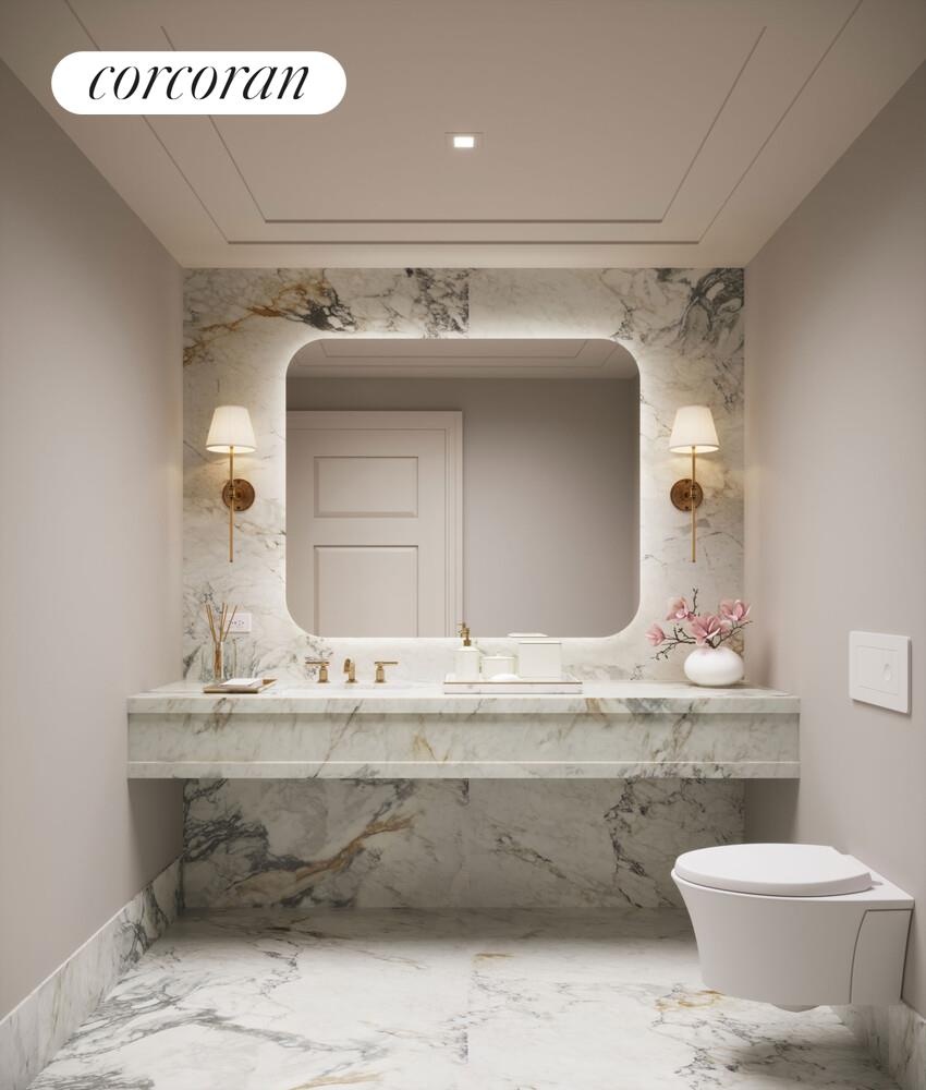 Secondary bathrooms feature Blanco Dolomiti marble premium honed mosaic flooring and walls, lacquered vanities with white wooden stone countertops, a tub or shower, and Kallista polished chrome fixtures and fittings including a hand shower. The powder room features a Panzer honed marble vanity, feature wall, and flooring, a Kallista unlacquered brass faucet, and a Kohler sink.