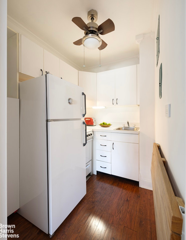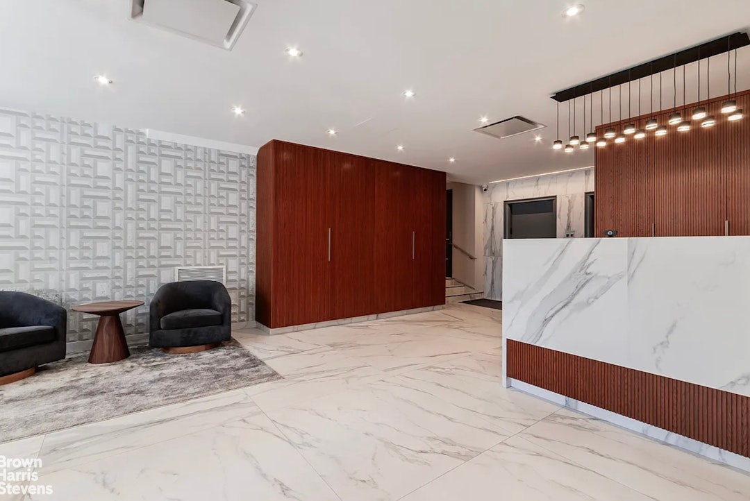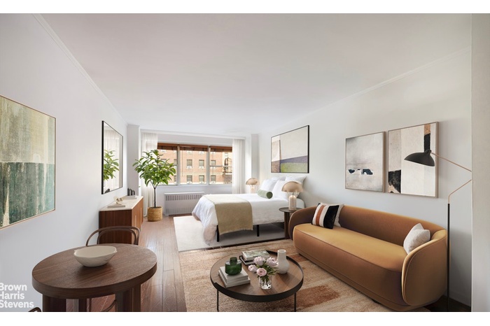Residence 5G is a generously sized studio featuring a highly functional layout, expansive windows, and exceptional storage. Perched on the fifth floor, this home enjoys open, sun-filled views that create a warm and inviting atmosphere. The living area comfortably accommodates a king-size bed, a dedicated workspace, and a separate living/dining area. The freshly painted kitchen is tastefully designed with white cabinetry and offers abundant storage. Off the entryway, three cedar-lined closets provide ample organization, while a dressing area leads to a fully renovated bathroom.