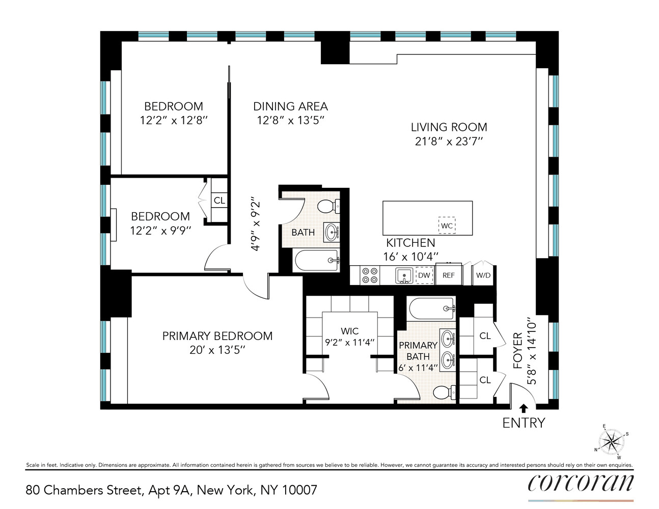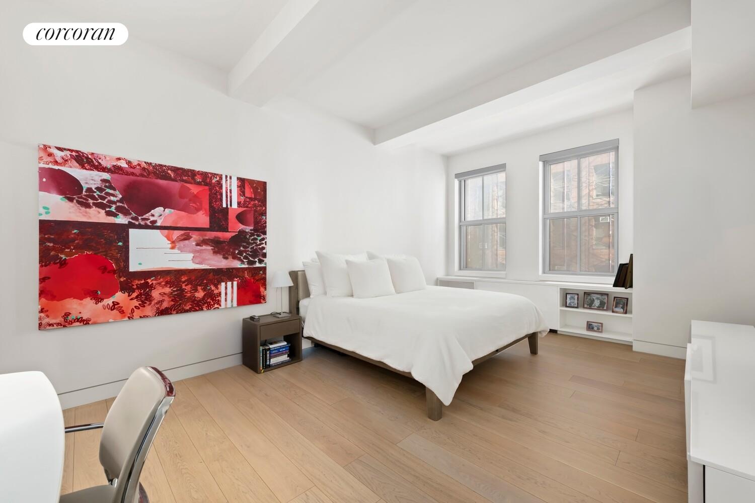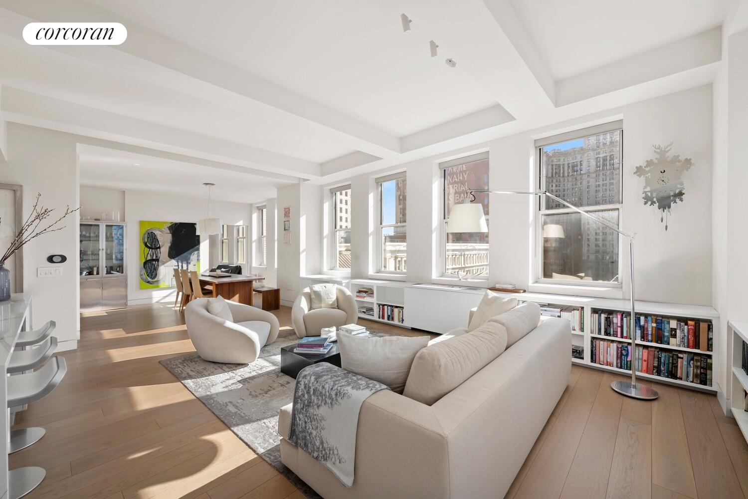 Inside this nearly 2,000-square-foot home, 10-foot-tall beamed ceilings soar above wide-plank hardwood floors and 20 oversized windows on the northern, eastern and southern exposures. A windowed foyer flanked by two huge closets welcomes you into the massive corner living room, where dramatic views skim across City Hall Park to the David Dinkins Municipal Building, the Brooklyn Bridge and Frank Gehry's 8 Spruce. Plan your next dinner party in the adjacent formal dining area and enjoy an open gourmet kitchen with floor-to-ceiling custom cabinetry, a massive waterfall island/breakfast bar and swaths of quartz. A fleet of stainless steel appliances, including a Wolf range, Sub-Zero refrigerator and Bosch dishwasher, makes cooking a joy.