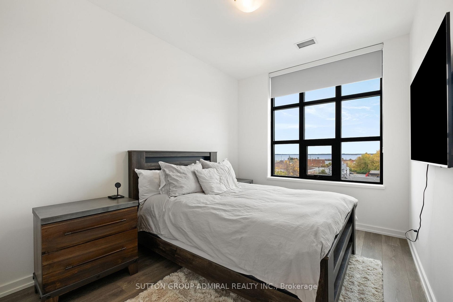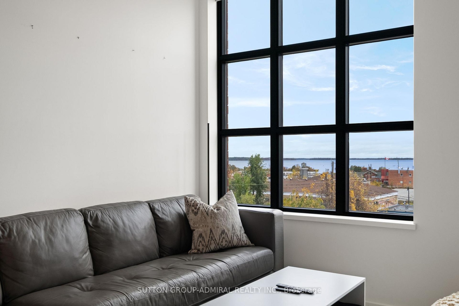 Lakeview Loft Living in the Heart of Orillia WITH DIRECT WATER VIEWS Welcome to Matchedash Lofts, where modern design meets downtown convenience. This bright and airy third-floor 950 sq ft residence with souring high ceilings and floor-to-ceiling windows and a Juliette balcony with picturesque views of Lake Couchiching and the Orillia skyline. The functional layout includes a spacious one-bedroom plus den and two full bathrooms. The open living and dining area flows seamlessly into a contemporary kitchen appointed with stone counters, stainless steel appliances, tile backsplash, and generous storage. The den offers flexibility as a home office or guest room, while the primary suite provides a walk-in closet and a private ensuite with elegant finishes. Residents enjoy access to a rooftop terrace showcasing panoramic lake views, along with secure underground parking and a dedicated storage locker. Perfectly situated within walking distance to shops, restaurants, the waterfront, and scenic trails, this residence delivers a refined blend of comfort, location, and lifestyle.