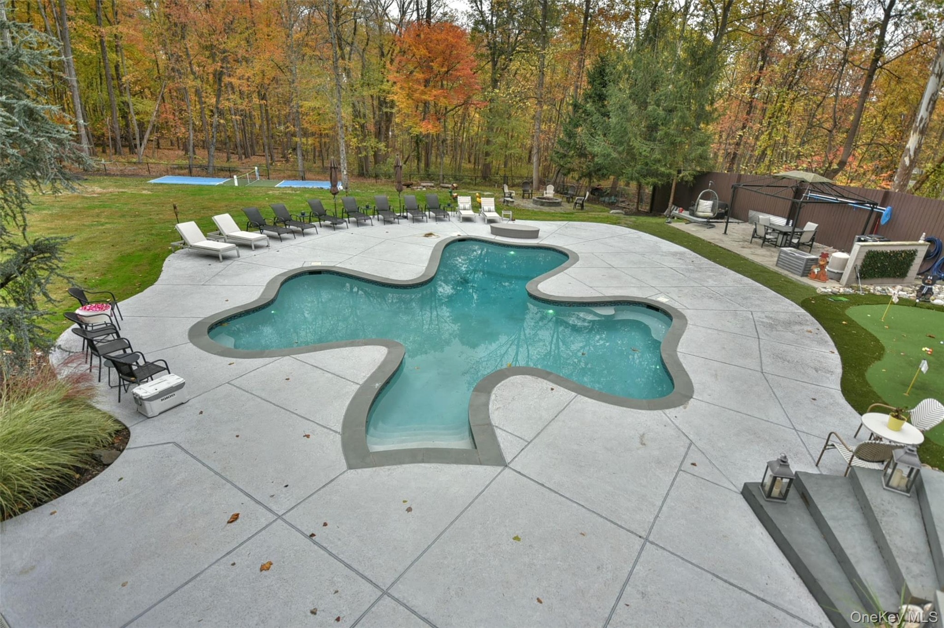 Nestled at the end of a private cul-de-sac, this magnificent 6000 sq ft, , 6-bedroom, 5-bath, 3 car garage English Tudor is a masterpiece of classic elegance and modern luxury. A meandering paver driveway leads to this stately residence, gracefully set on over an acre of lush, landscaped grounds that evoke the feel of a private resort. The outdoor oasis features a unique Shamrock gunite pool, pickleball court, putting green, fire pit, gazebos, and a covered patio with outdoor TV surrounded by mature trees and manicured gardens. The oversized deck overlooks the lush rear yard, creating the perfect backdrop for entertaining or peaceful relaxation. A dramatic two-story grand entry with marble flooring sets the tone for the home’s elegant interior. The chef’s kitchen is equipped with a Wolf stove, Sub-Zero refrigerator, microwave drawer, wine fridge, granite countertops, and a large center island. Generous living spaces include a grand family room with a floor to ceiling stone wood-burning fireplace, an oversized living room with a marble-surround gas fireplace, and a formal dining room with its own fireplace and wine fridge. French doors open to a sophisticated office/library with built-ins- ideal for remote work or quiet study. A wrap-around staircase leads to the second level, where the spacious primary suite impresses with two custom walk-in closets, a balcony overlooking the rear yard and a luxurious en-suite with large marble shower, whirlpool tub and double sinks. Three additional generously -sized bedrooms feature walk-in closets are served by two full baths, with a convenient back staircase leading to the kitchen area. The walk-out lower level expands the living space with a family room, home office, two additional bedrooms, a fitness room, billiards/game room, sauna, second kitchen, and a full bath—ideal for guests, extended family, or recreation. This extraordinary Tudor estate offers the perfect blend of elegance, function, resort style amenities and privacy in a premier location- 13 miles from NYC, close to major bridges, nearby to Westchester and Bergen County. Excellent Pearl River Schools!
