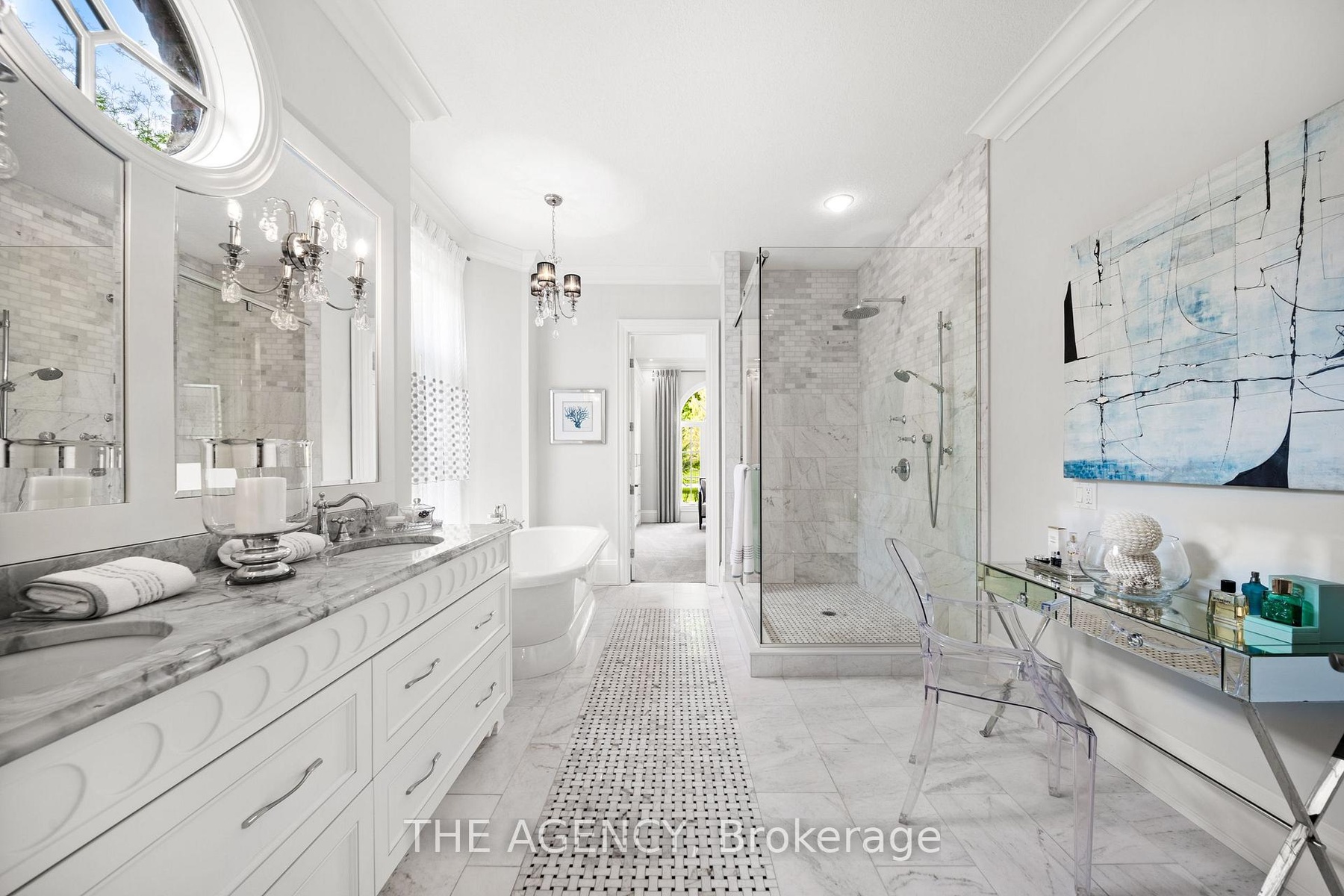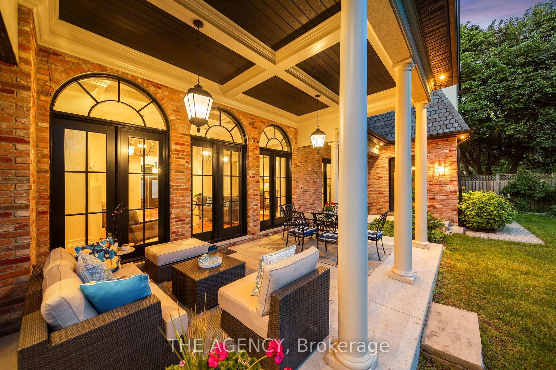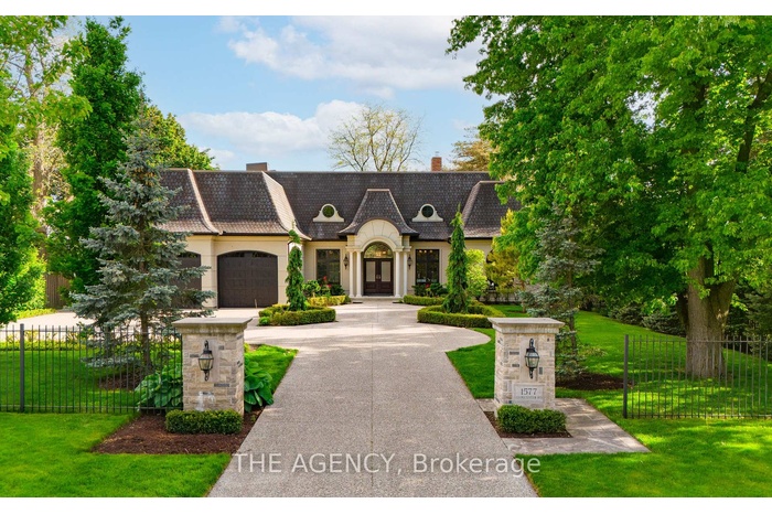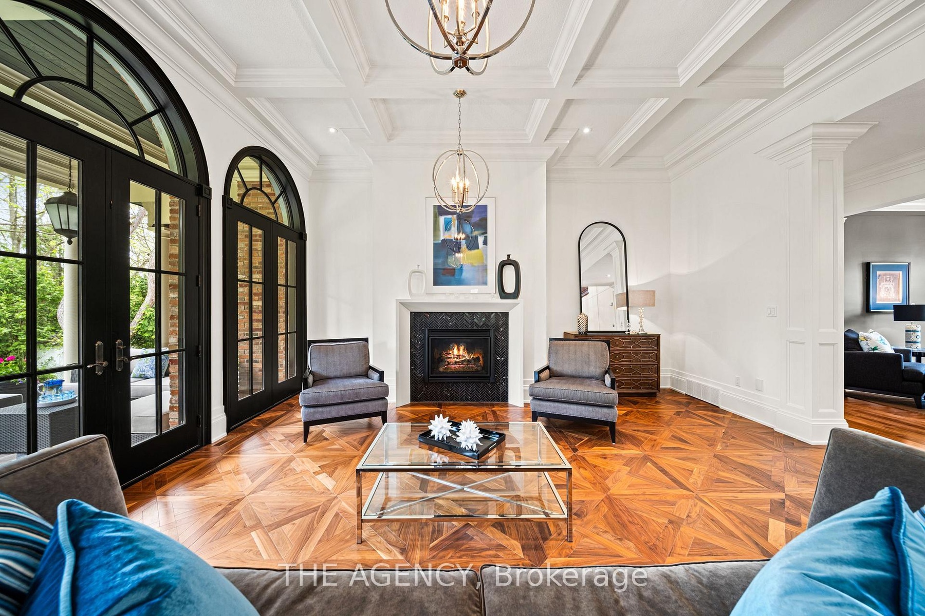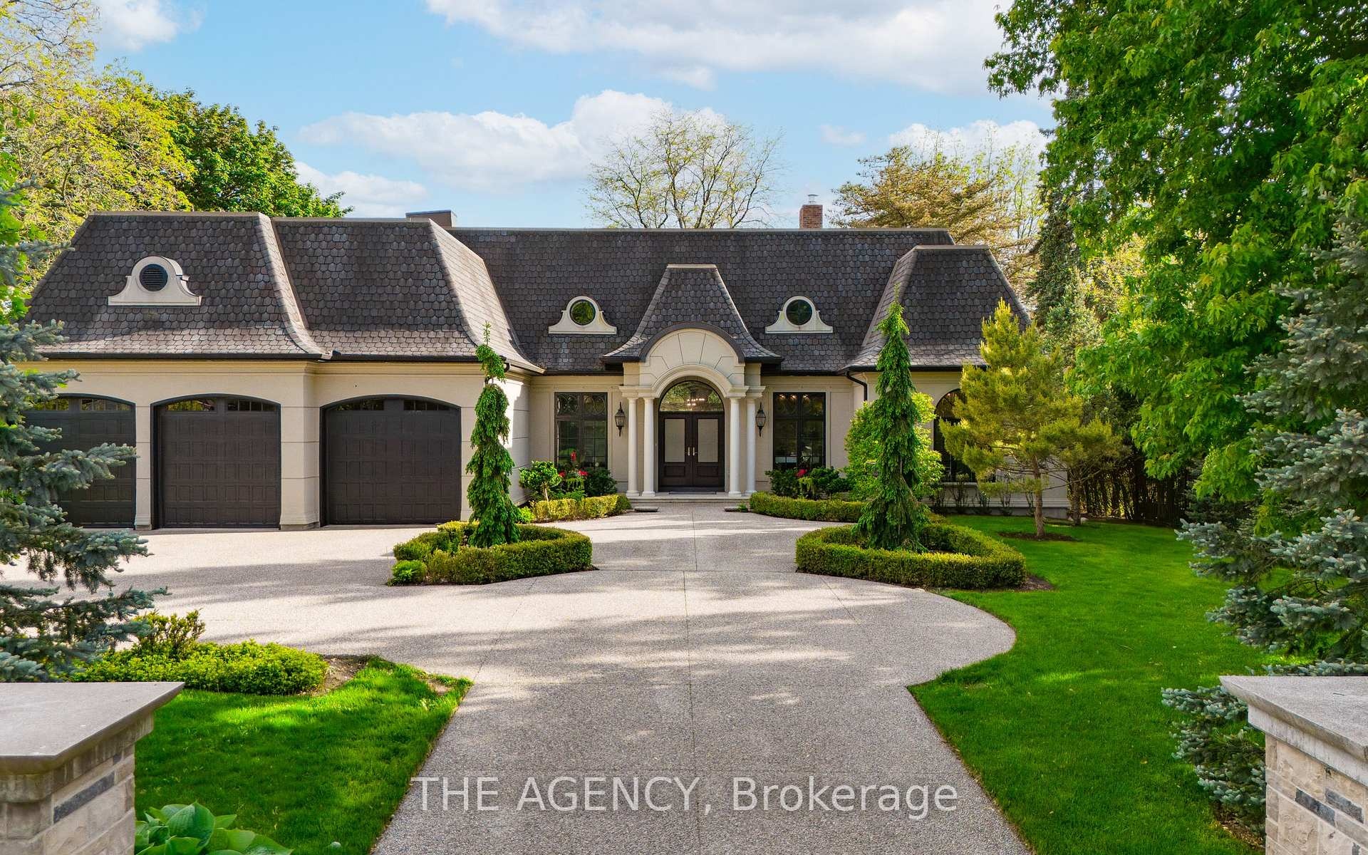 Welcome to this extraordinary bungaloft, nestled on a private, wooded lot and offering the perfect balance of luxury, function, and architectural detail. The main level impresses with 12-foot ceilings, walnut flooring and high-end finishes throughout. Tray ceilings in the formal dining room, coffered ceilings in key living spaces, and solid core doors enhance the sense of quality and scale. Expansive transom windows and high baseboards add architectural charm and natural light throughout. The main floor principal bedroom offers a serene retreat with tray ceilings, garden doors leading to the rear yard, and a stunning ensuite featuring marble tile with inlay, a freestanding tub, a glass-enclosed shower, dual vanities, and a spacious walk-in closet with custom built-ins and dual access. The family room is warmed by a wood-burning fireplace, while the separate living room offers a cozy natural gas fireplace. Two separate mudrooms-one off the front foyer and one off the garage-add everyday practicality to the homes thoughtful layout. The kitchen features premium Wolf appliances, a farmhouse sink, pot filler, and a large island with seating. The adjacent servery includes a fridge, wall oven, microwave, and a secondary sink-ideal for hosting. Upstairs, the loft provides a versatile living area, two generously sized bedrooms, and a beautifully finished main bath with a double vanity, freestanding tub, glass shower, and elegant tile inlay flooring. The lower level adds versatility with two additional bedrooms and rough-in. A walk-up to the triple car garage enhances convenience and supports multi-generational living. Outside, enjoy a private, two-tiered backyard oasis with a covered rear porch, perfect for relaxing or entertaining. The expansive driveway offers parking for up to eight vehicles, in addition to the spacious triple car garage with built-in storage, completing this exceptional property.