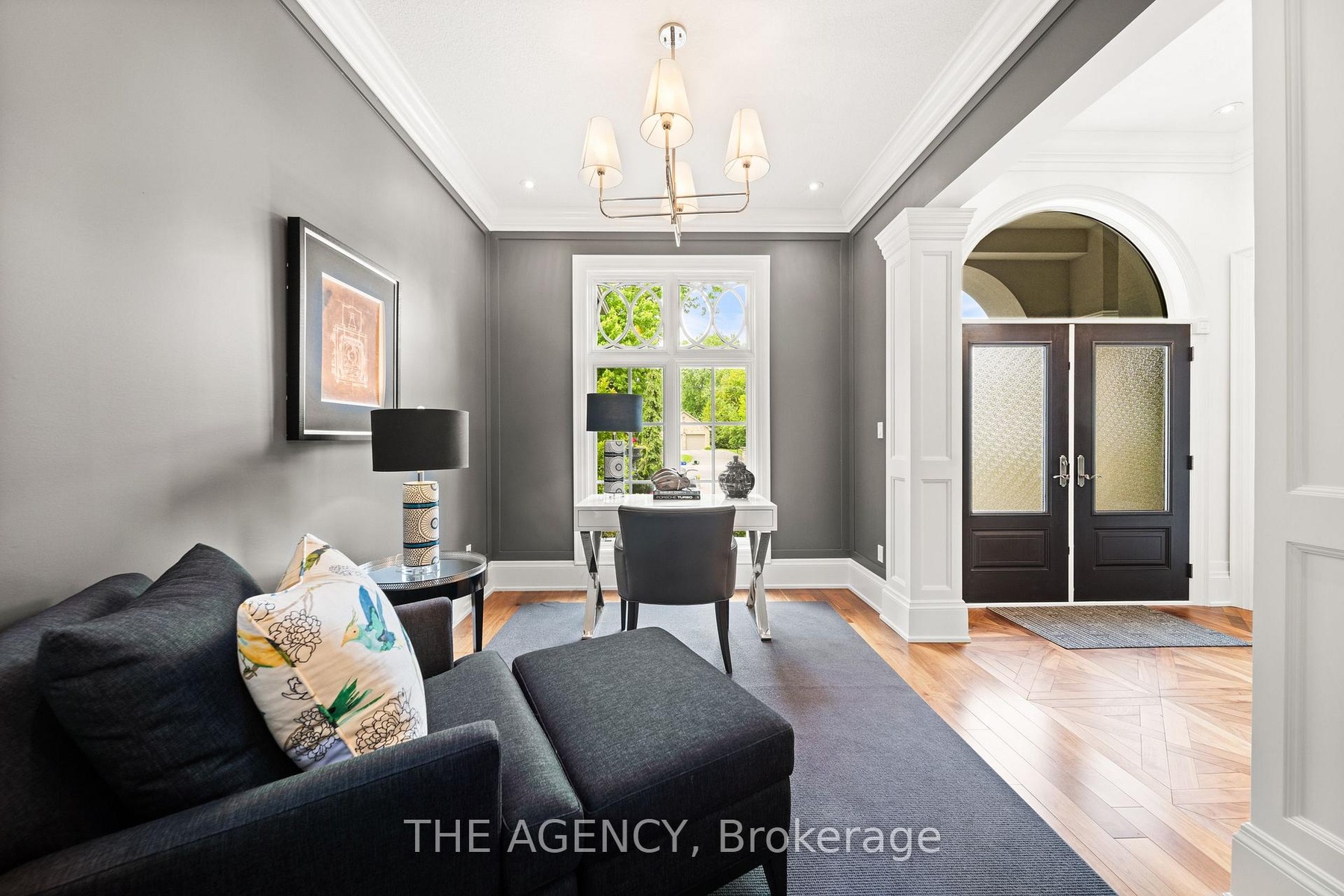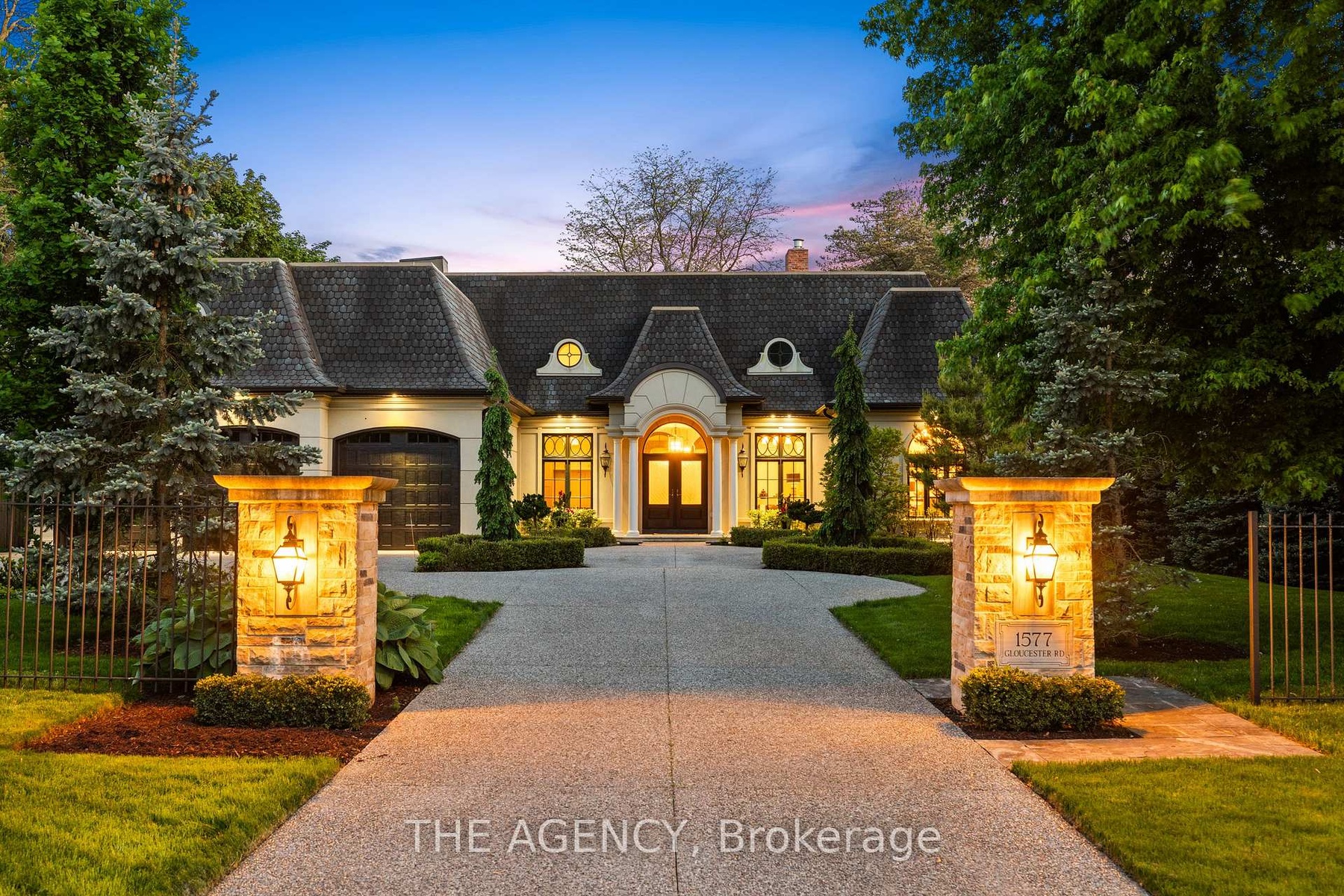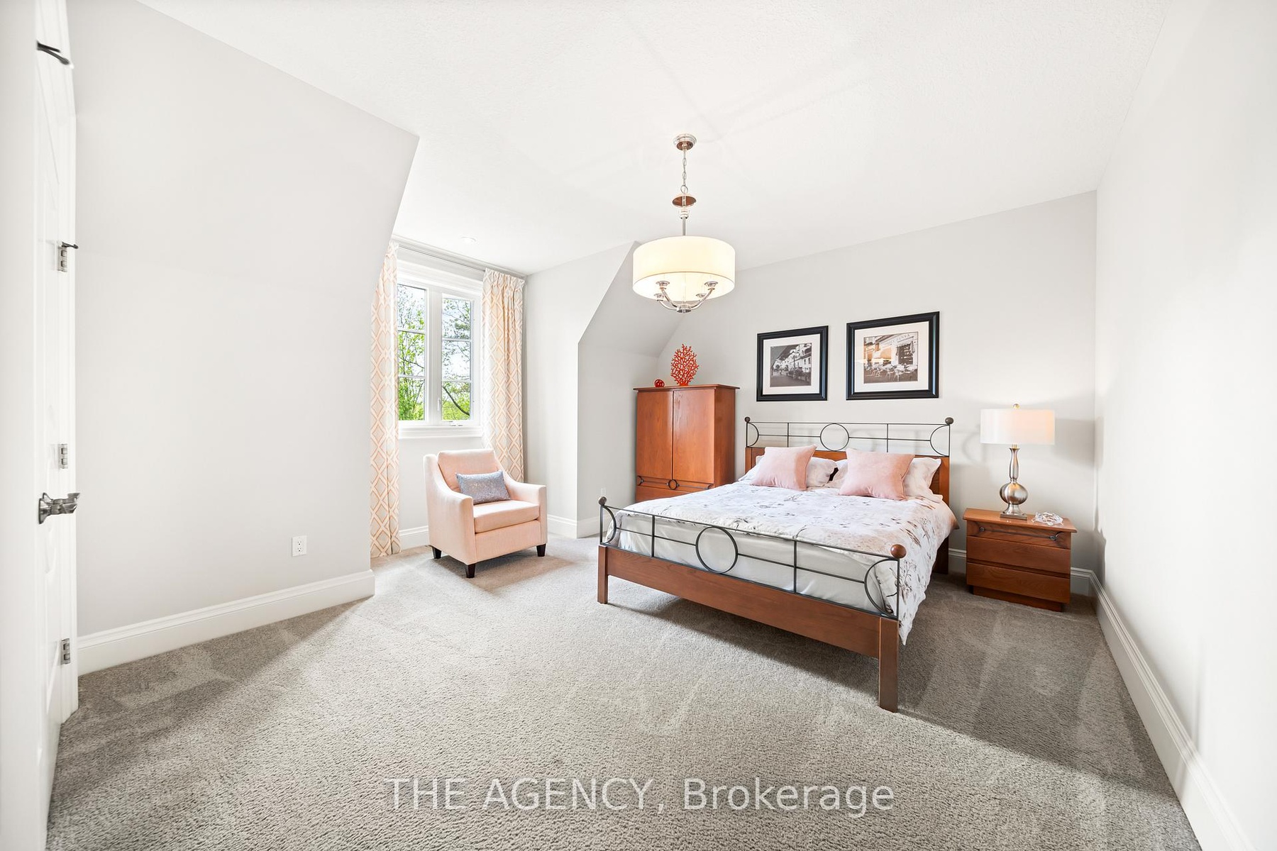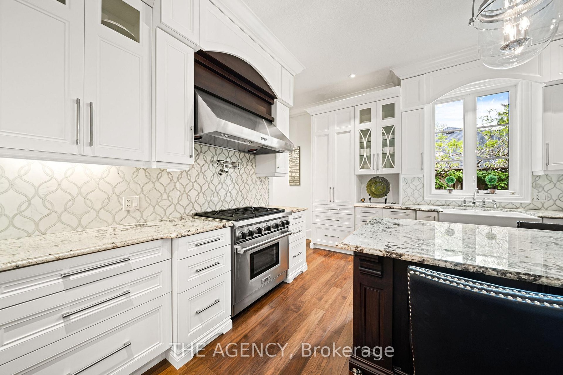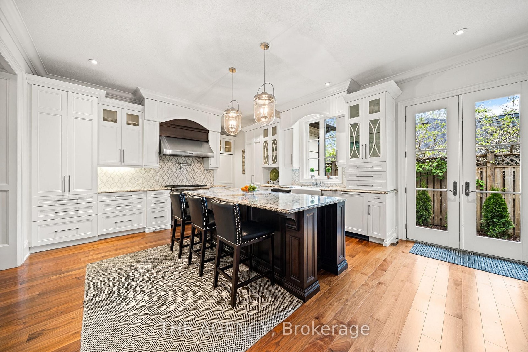 Welcome to this extraordinary bungaloft, nestled on a private, wooded lot and offering the perfect balance of luxury, function, and architectural detail. The main level impresses with 12-foot ceilings, walnut flooring and high-end finishes throughout. Tray ceilings in the formal dining room, coffered ceilings in key living spaces, and solid core doors enhance the sense of quality and scale. Expansive transom windows and high baseboards add architectural charm and natural light throughout. The main floor principal bedroom offers a serene retreat with tray ceilings, garden doors leading to the rear yard, and a stunning ensuite featuring marble tile with inlay, a freestanding tub, a glass-enclosed shower, dual vanities, and a spacious walk-in closet with custom built-ins and dual access. The family room is warmed by a wood-burning fireplace, while the separate living room offers a cozy natural gas fireplace. Two separate mudrooms-one off the front foyer and one off the garage-add everyday practicality to the homes thoughtful layout. The kitchen features premium Wolf appliances, a farmhouse sink, pot filler, and a large island with seating. The adjacent servery includes a fridge, wall oven, microwave, and a secondary sink-ideal for hosting. Upstairs, the loft provides a versatile living area, two generously sized bedrooms, and a beautifully finished main bath with a double vanity, freestanding tub, glass shower, and elegant tile inlay flooring. The lower level adds versatility with two additional bedrooms and rough-in. A walk-up to the triple car garage enhances convenience and supports multi-generational living. Outside, enjoy a private, two-tiered backyard oasis with a covered rear porch, perfect for relaxing or entertaining. The expansive driveway offers parking for up to eight vehicles, in addition to the spacious triple car garage with built-in storage, completing this exceptional property.