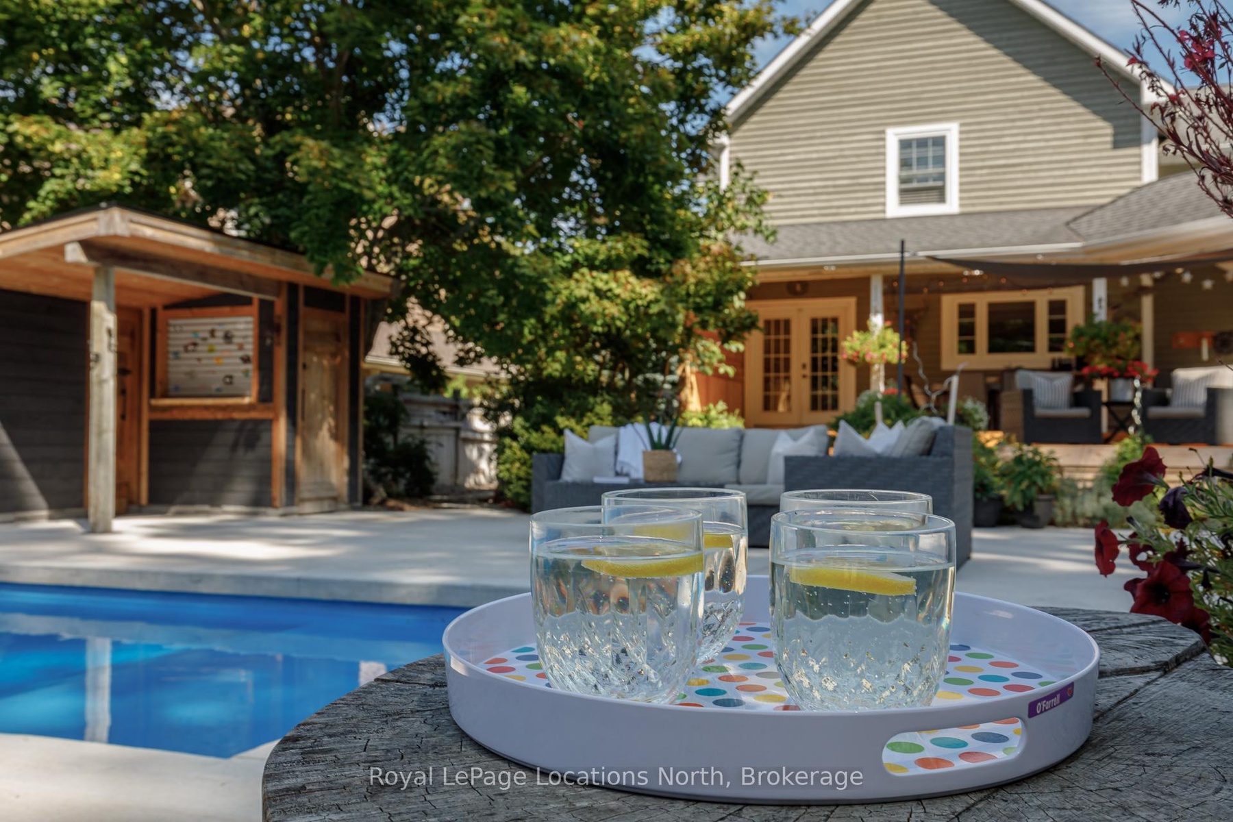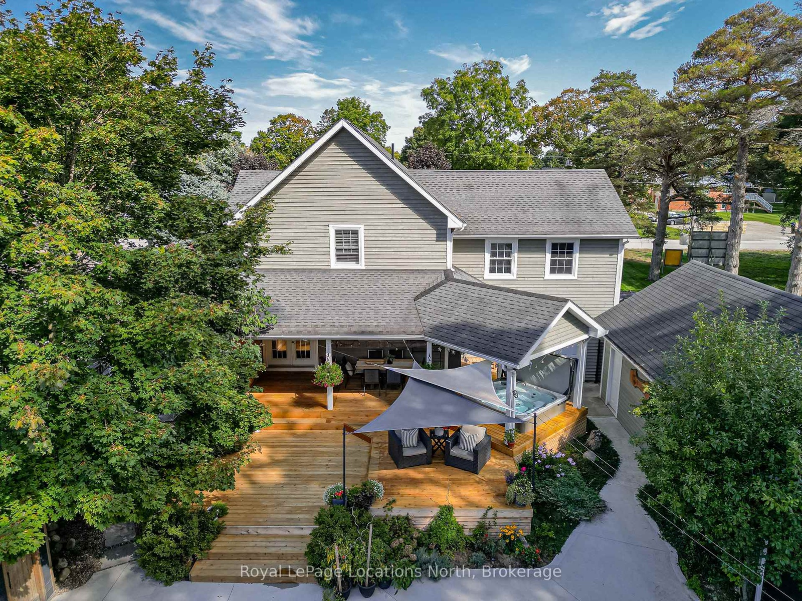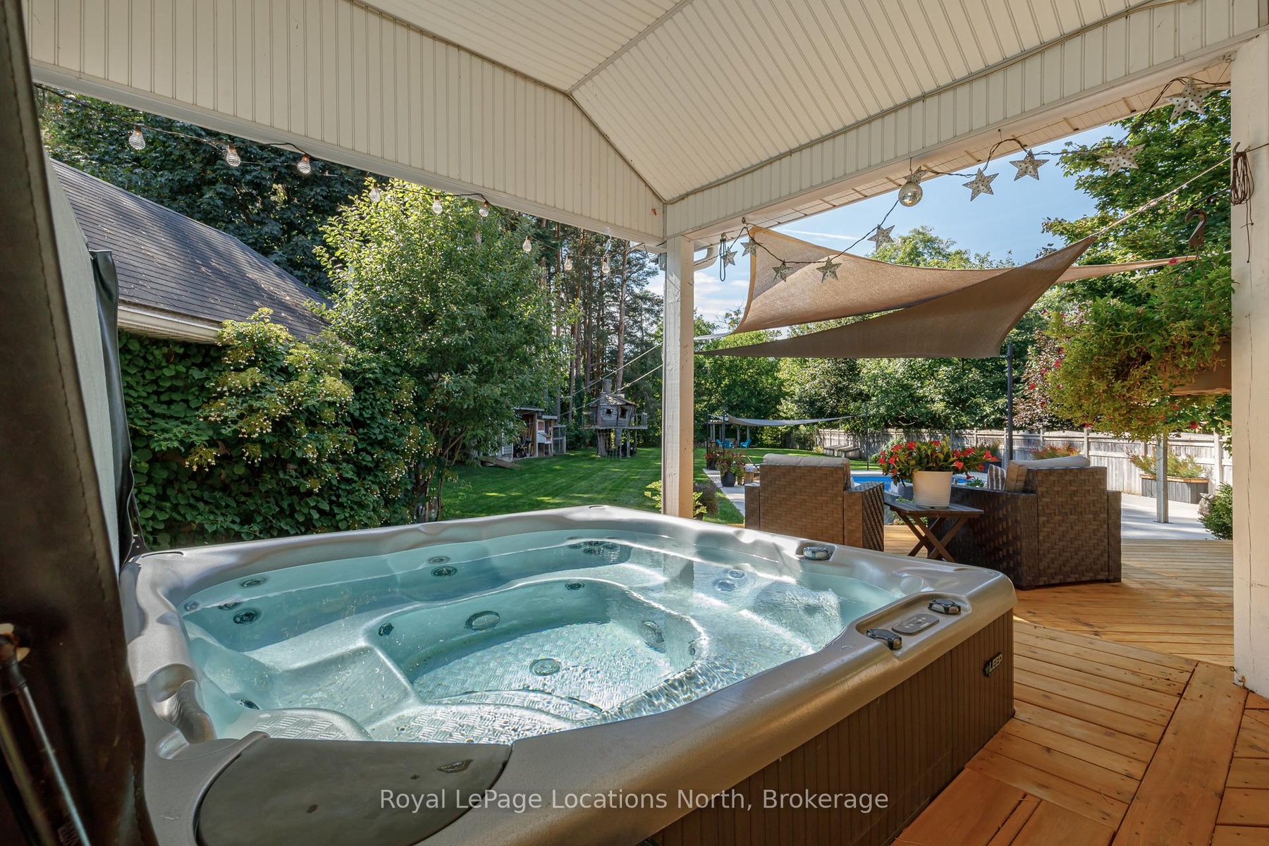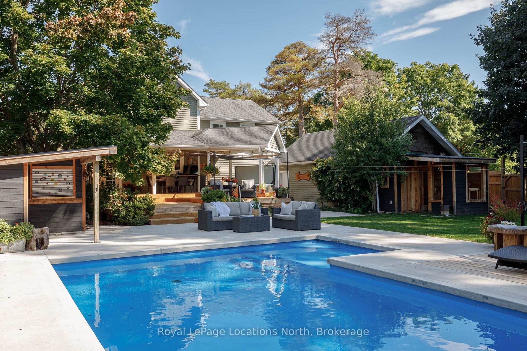 Charming Family Home with Backyard Oasis in the Heart of Nottawa! Set on a quiet street and nestled on a private, beautifully landscaped lot, this charming family home offers the perfect blend of comfort, style and outdoor living. From its inviting front porch and great curb appeal to the backyard oasis beyond, every detail has been designed for relaxation and connection. Step inside to a bright and welcoming living room featuring wood floors, California shutters and a cozy gas fireplace. The open-concept dining area flows seamlessly into a gourmet kitchen complete with stainless steel appliances, a coffee bar and a walkout to your backyard paradise - ideal for entertaining and family gatherings. Outdoors, enjoy resort-style living with an inground pool, hot tub, sauna, spacious deck, and fenced yard - the ultimate setting for summer fun and making lasting memories with friends and loved ones. Upstairs, you'll find three spacious bedrooms plus a lovely primary suite with an ensuite bath and walk-in closet. Convenient second-floor laundry adds everyday ease. The finished lower level offers even more space with a family room perfect for movie nights, a games area, and an exercise zone - providing something for everyone. Additional highlights include an attached garage, large heated workshop, garden shed and a concrete driveway with parking for multiple vehicles. Located steps from Nottawa amenities and just a short drive to Nottawa Elementary School, area golf courses, ski clubs, trails, and Georgian Bay, this home combines small-town charm with easy access to four-season recreation. A truly wonderful place to raise a family and create lasting memories.