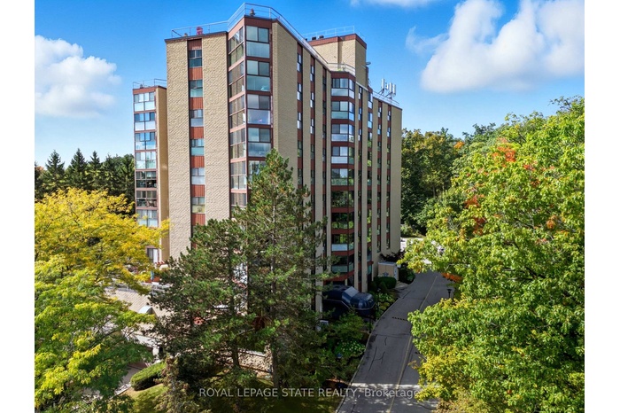 Welcome to The Highlands by the Park; 20 Berkley Road. Nestled atop a hill at the end of a quiet cul-de-sac in historic West Galt, this prestigious condominium offers tranquility, privacy, and sweeping views of nature and the city skyline. Overlooking a majestic woodlot, Victoria Park, and beyond, this building is one of Cambridge's hidden gems. This spacious 2,418 square foot, carpet-free unit offers a rare combination of size, layout, and natural light. With 3 generously sized bedrooms, 2 full bathrooms, and a thoughtfully designed floor plan, it's ideal for those seeking a blend of comfort and functionality. Step into an impressive foyer with mirrored walls and a large closet before entering the bright eat-in kitchen, complete with ceramic tile, crisp white cabinetry, built-in range top, track lighting and a cozy breakfast nook that looks out over lush greenery. The kitchen opens into a formal dining room with laminate flooring and elegant wall sconces; perfect for entertaining. The adjacent oversized living room features a wood-burning fireplace (sold in as-is condition) and leads to a bright all-season solarium with floor-to-ceiling windows, perfect as a den, office, or creative space. Down the hallway, you'll find three spacious bedrooms, including a large primary suite with two large windows, an expansive walk-in closet, and a 5-piece ensuite. A second 4-piece guest bath serves the remaining bedrooms. The in-suite laundry closet is conveniently tucked away off the main hallway. Building amenities include a rooftop terrace with panoramic views, ample seating, and barbecue, a party room with full kitchen and lounge area, meeting room, exercise room, and beautifully maintained common spaces. This unit includes one underground parking spot with a tandem storage locker. Don't miss this rare opportunity to live in a peaceful, elevated community surrounded by nature, just minutes from the charm and culture of West Galt.